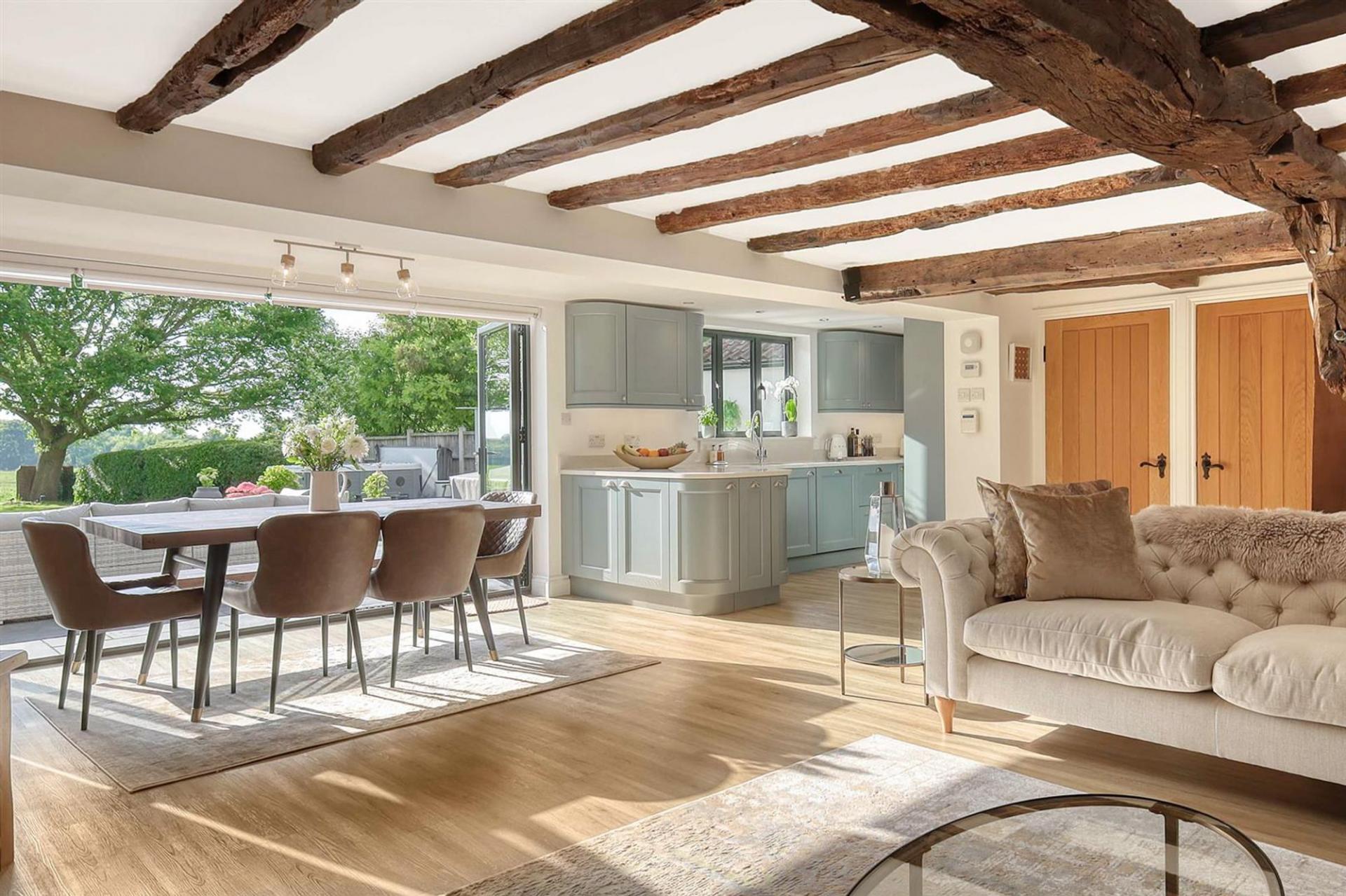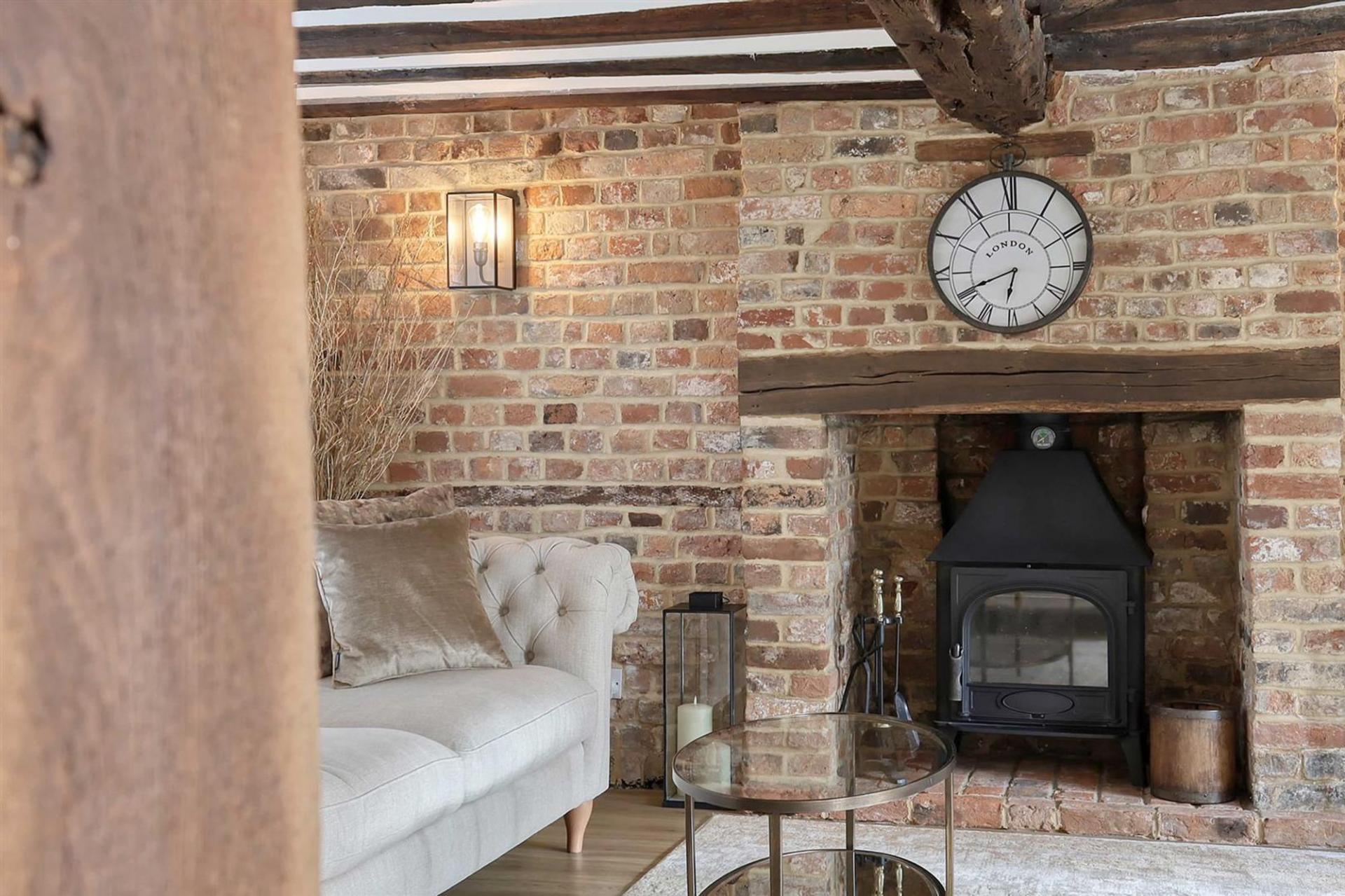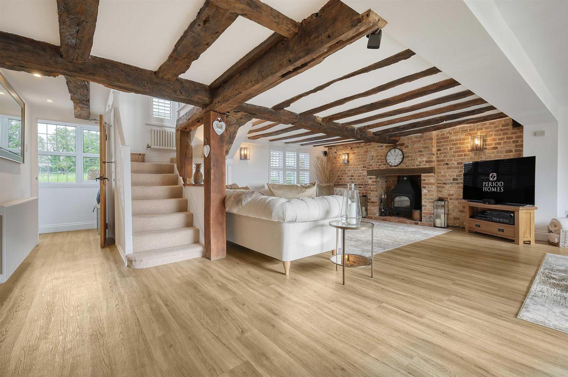 Originally two cottages, this beautifully maintained detached home is full of characterful features. The house is approached by a block paved driveway with off street parking for multiple vehicles. Upon entering, you're welcomed by a porch, perfect for shoe storage. From there, the impressive open plan reception/dining room features original timber beams and an exposed brick wall with Inglenook fireplace, completed with a wood burner, ideal for cosy winter months. The dining area overlooks the beautiful garden and has bi-folding doors for seamless indoor-outdoor living in the summer. To the right of the dining area is the kitchen, renovated within the last two years featuring integrated appliances, shaker style units and quartz worktops. The remainder of the downstairs comprises a large utility room, a w/c, and a third double bedroom.