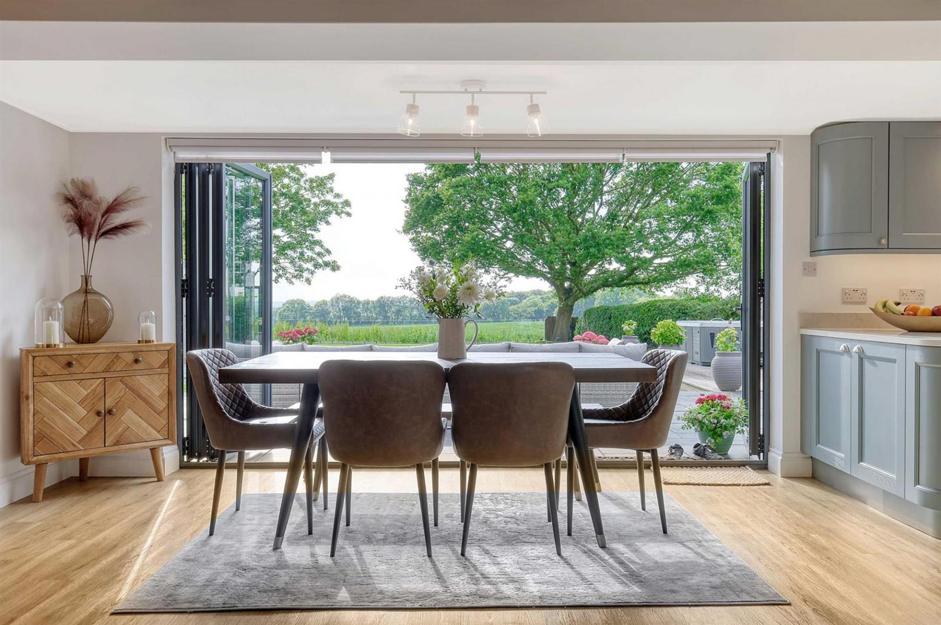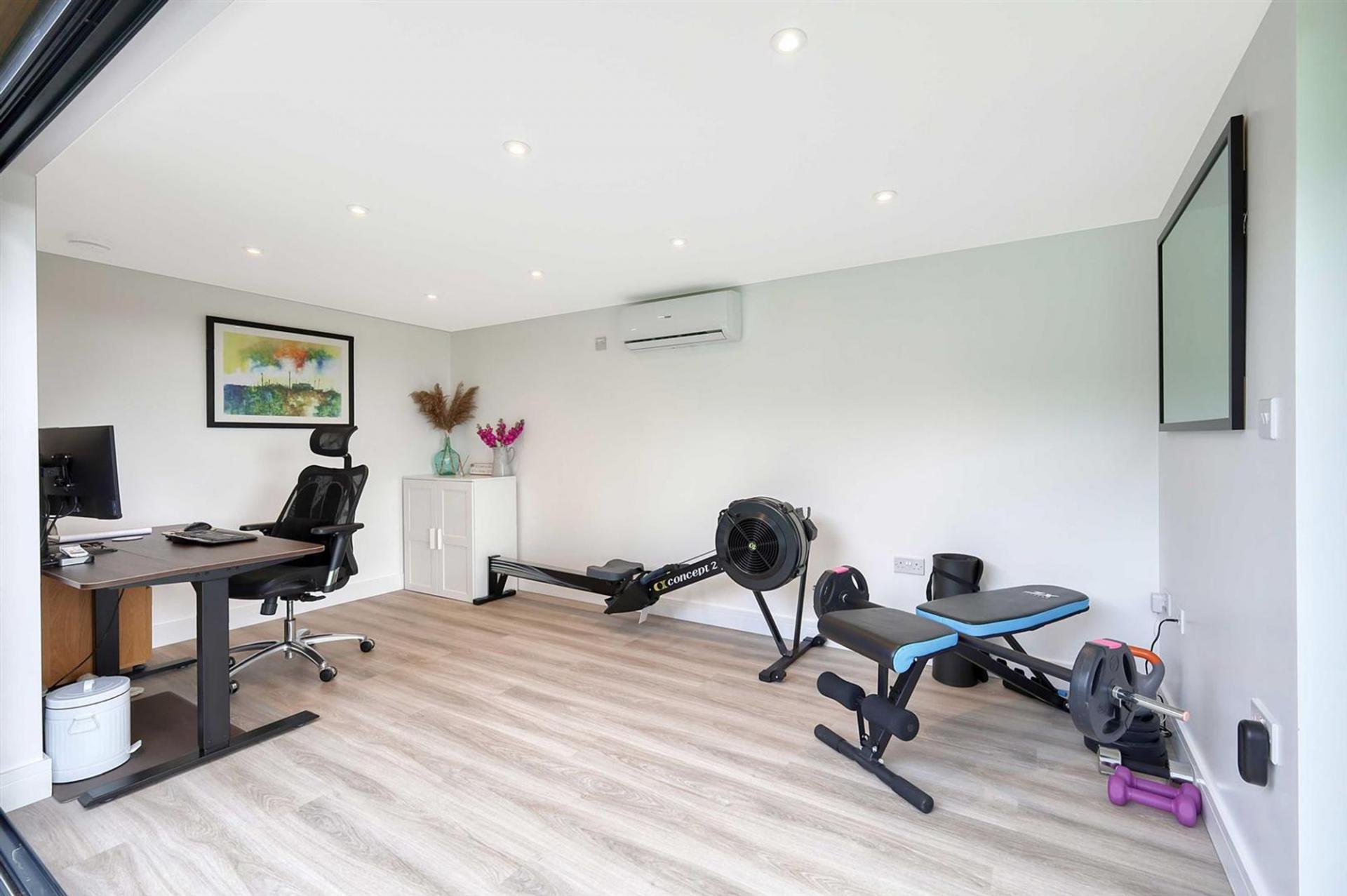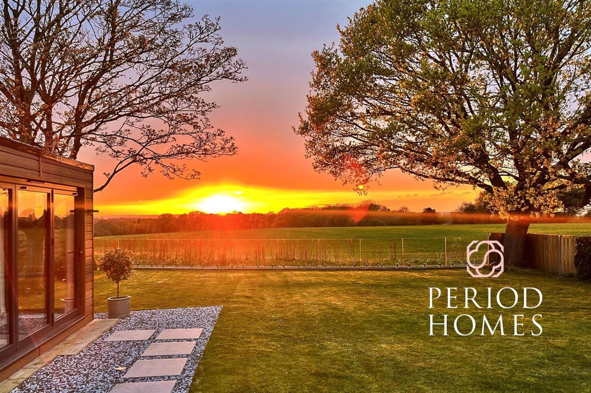 To the rear of the garden, a high-spec garden office offers the perfect work from home solution, featuring CAT 6 cabling, air conditioning/heating, TV point, and bi-folding doors that frame the stunning farmland views. A second, substantial outbuilding provides excellent storage and houses additional appliances.