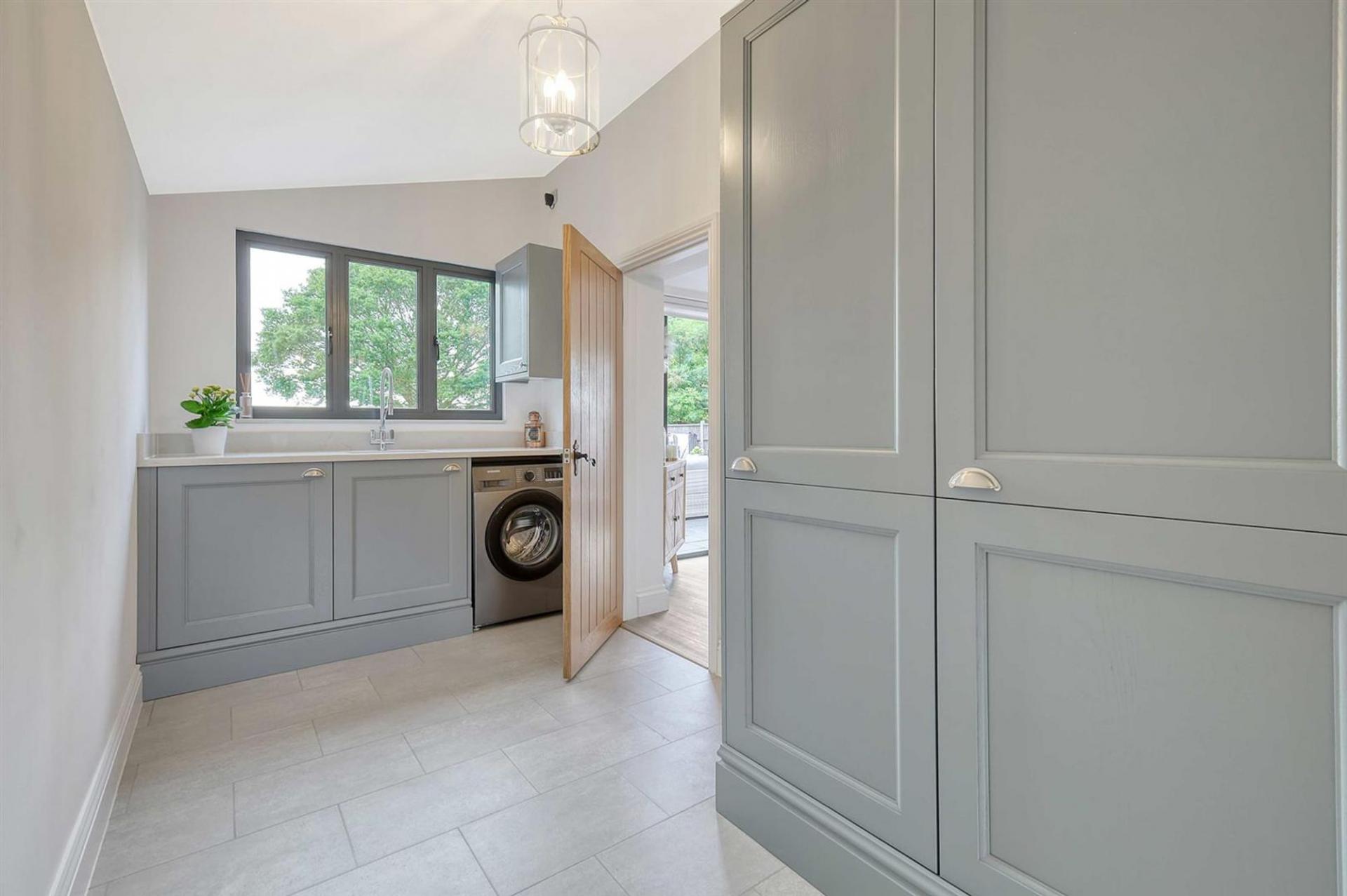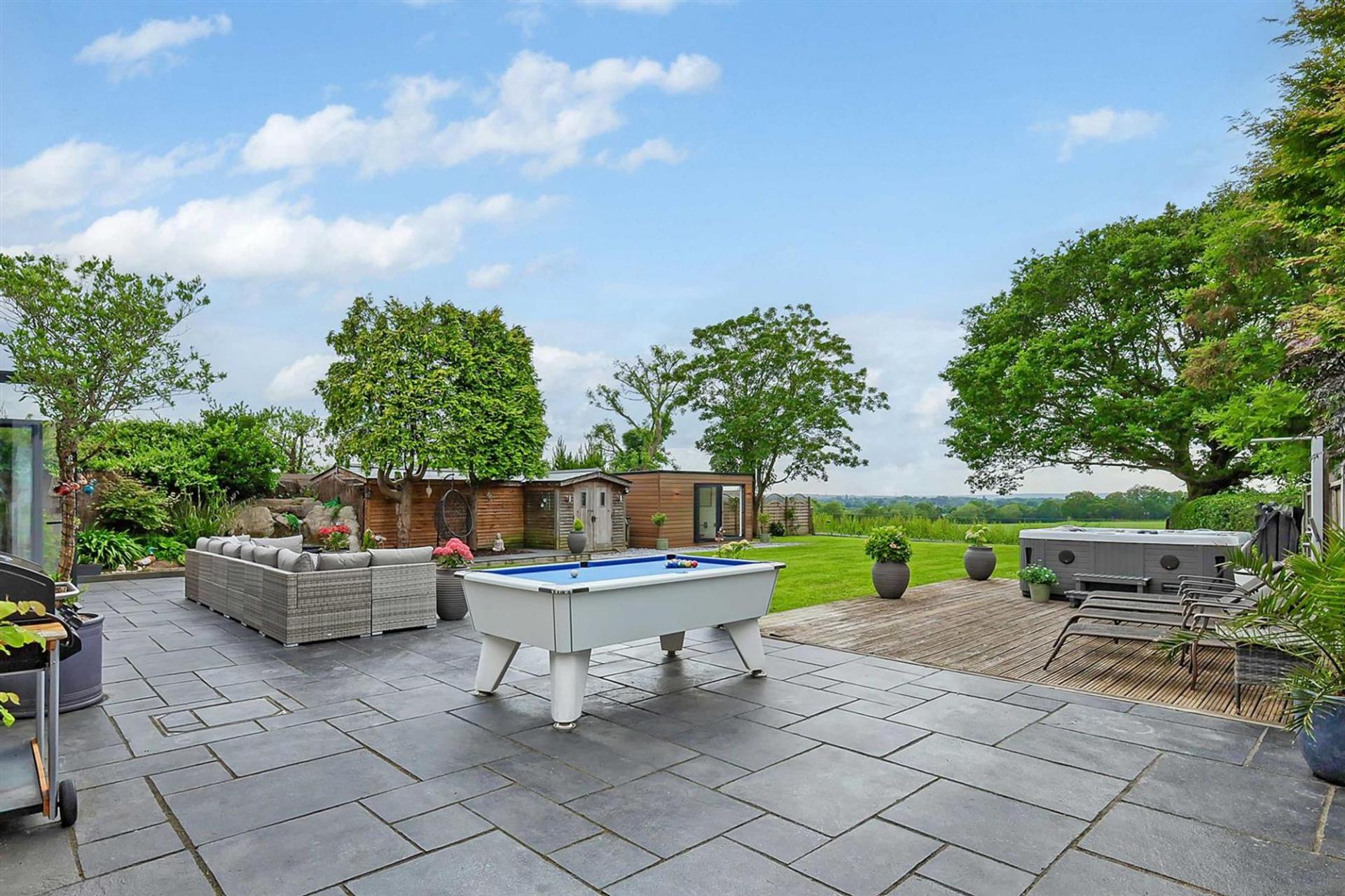 The magnificent garden extends to approximately 100 ft and is bordered with glass panels at the rear, offering uninterrupted views over open farmland. There is a large patio area perfect for al fresco dining and entertaining, as well as a pond that adds to the tranquil setting. Furthermore, there is wide side access on the right side of the house, complete with a log store.