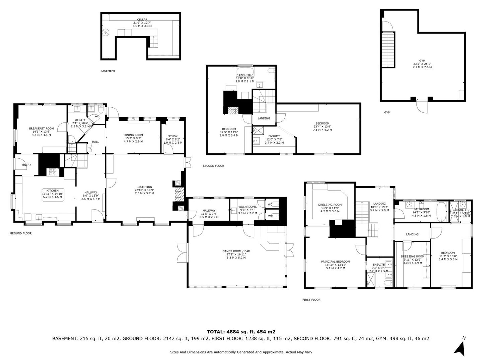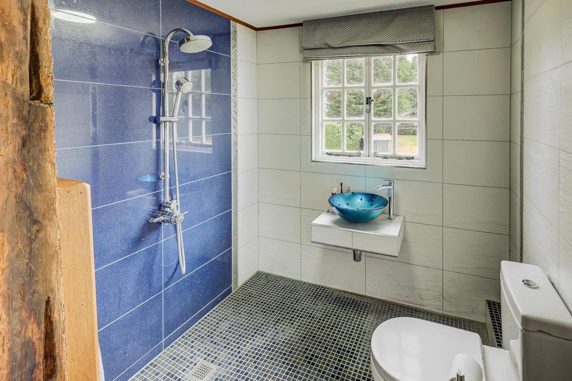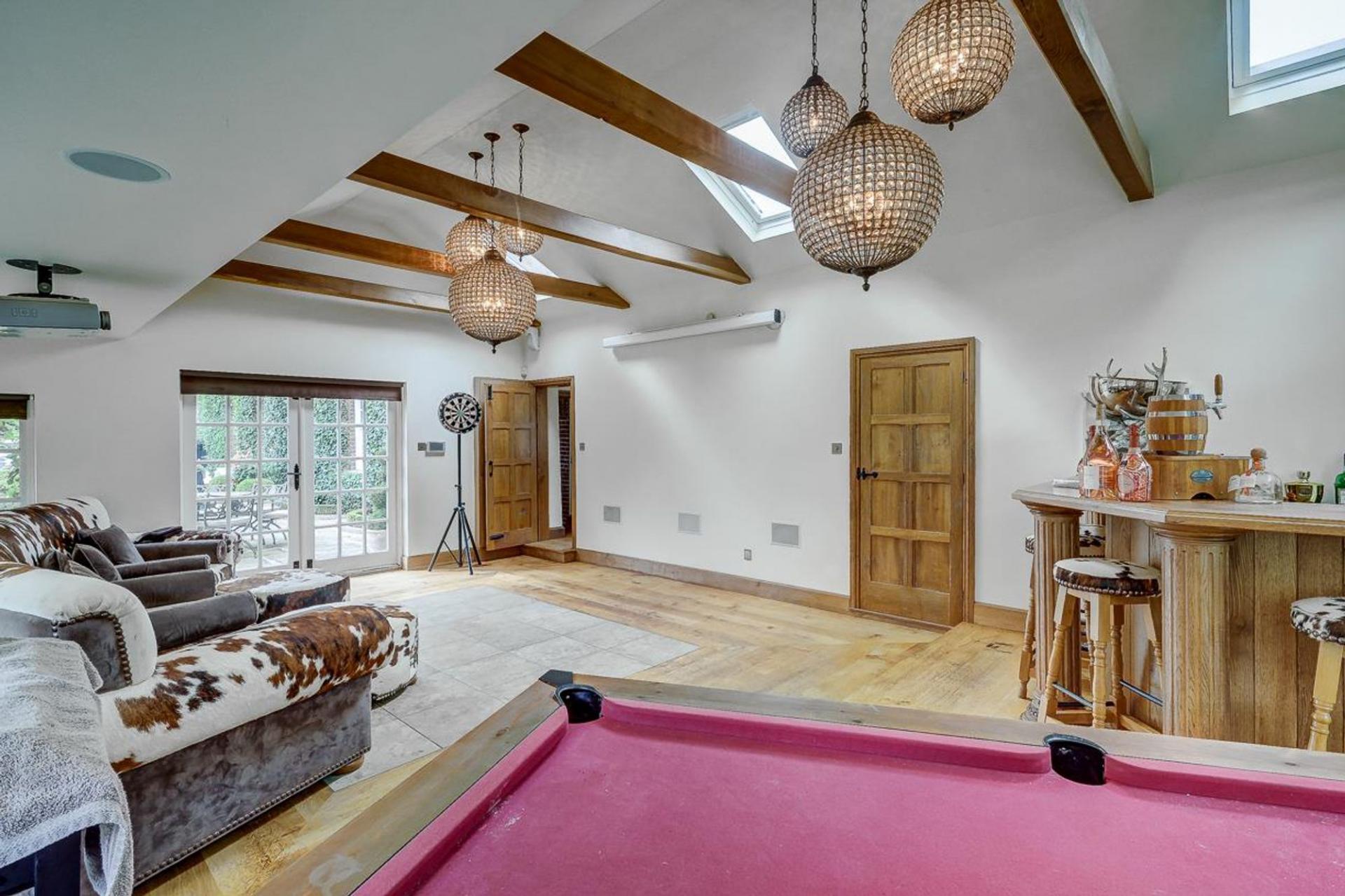 The 22ft main reception room showcases an impressive red brick Inglenook fireplace, leading to a beamed dining room and separate study. The bespoke Mark Wilkinson kitchen is fitted with a central island, wine cooler, granite worktops, and an Aga, with an adjoining breakfast room, utility, and ground floor cloakroom/WC. A personal door leads to the dry cellar, housing a central vacuum system and storage. The 27ft leisure/games room is a show-stopping space, featuring a vaulted ceiling, bespoke oak bar, underfloor heating, and French doors flooding the room with natural light. This area also includes a washroom and dual WCs.
