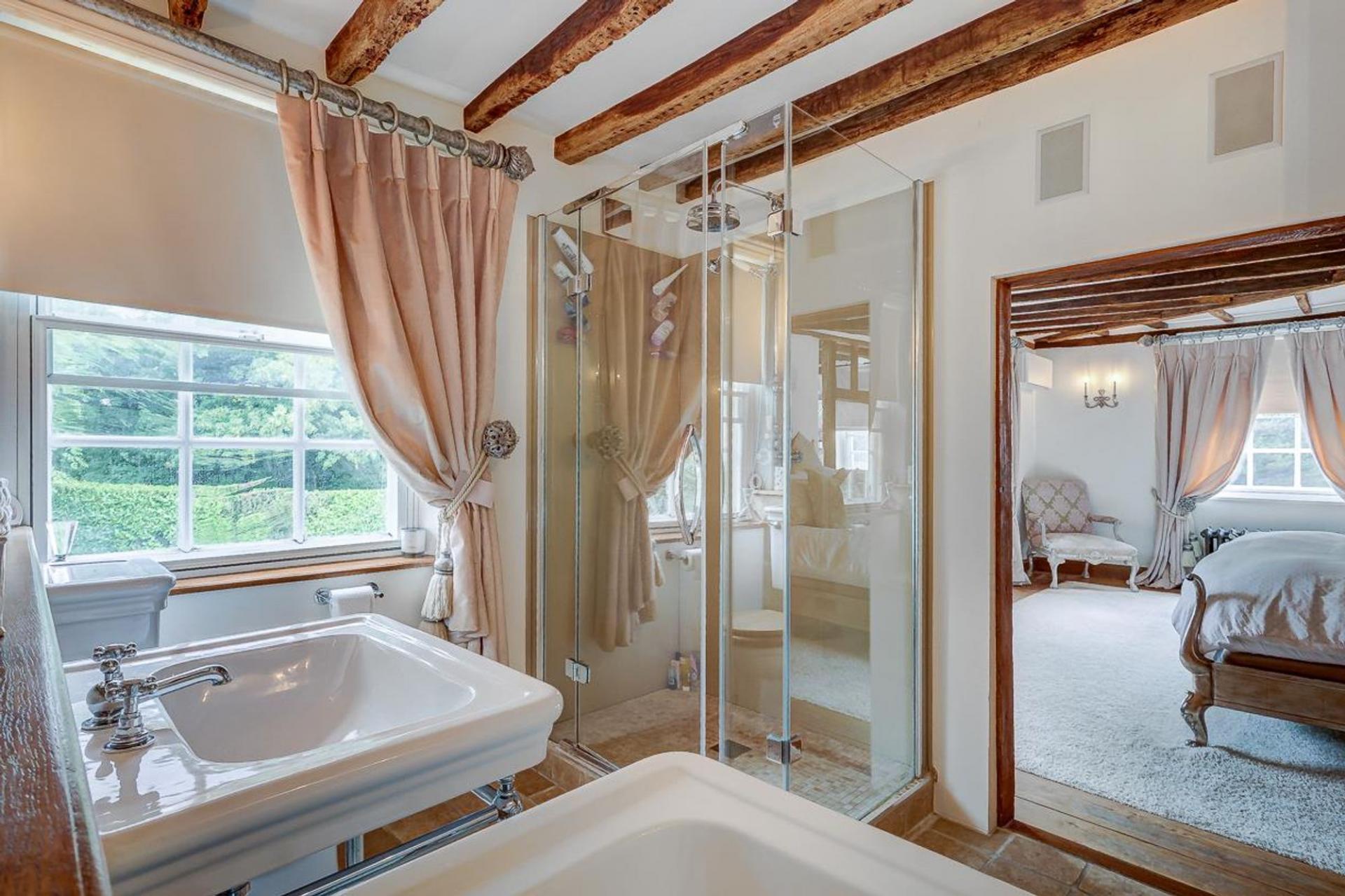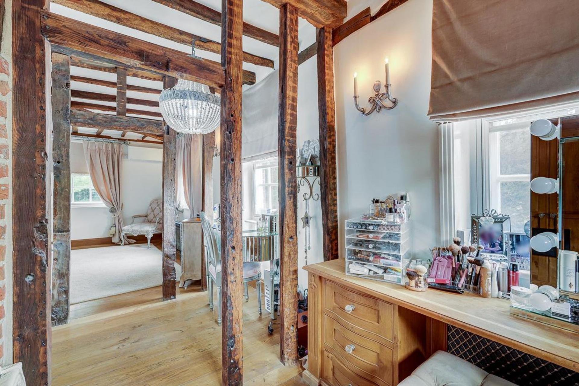 A solid oak staircase leads to the first-floor accommodation, where the principal bedroom suite enjoys a spacious dressing area and en-suite shower room. A further double bedroom with en-suite, an additional dressing room, and a main bathroom complete this level. The staircase continues to the second floor, where two more vaulted en-suite bedrooms are beautifully finished with exposed beams.