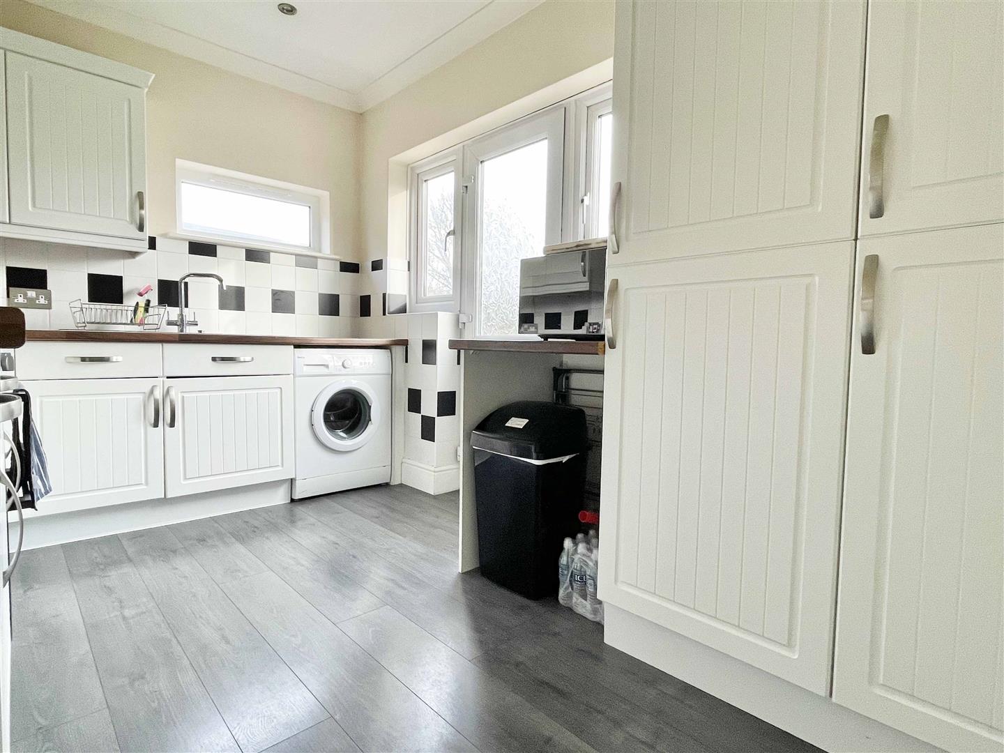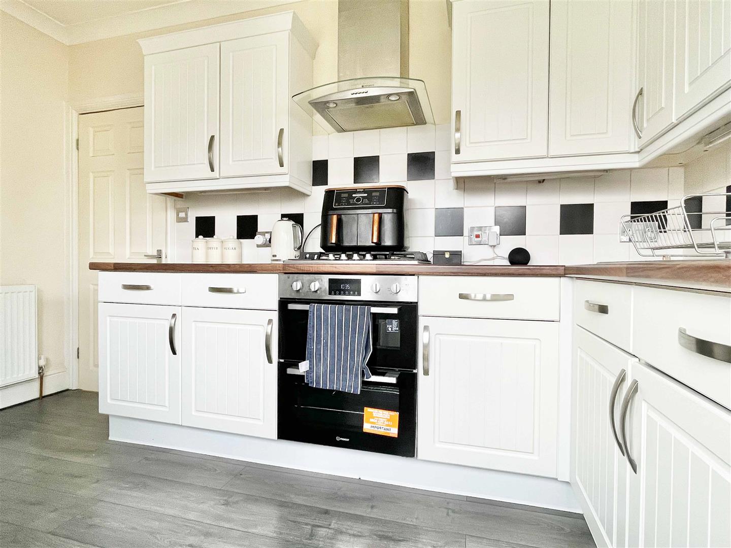 Kitchen: - 3.71m x 2.59m (12'02" x 8'06") - Dual aspect double glazed window to side with window and door to rear, round edge work tops with stainless drainer sink inset, gas hob with extractor over, matching wall and base units, integrated oven and fridge freezer, space for washing machine, wood effect flooring, radiator.
