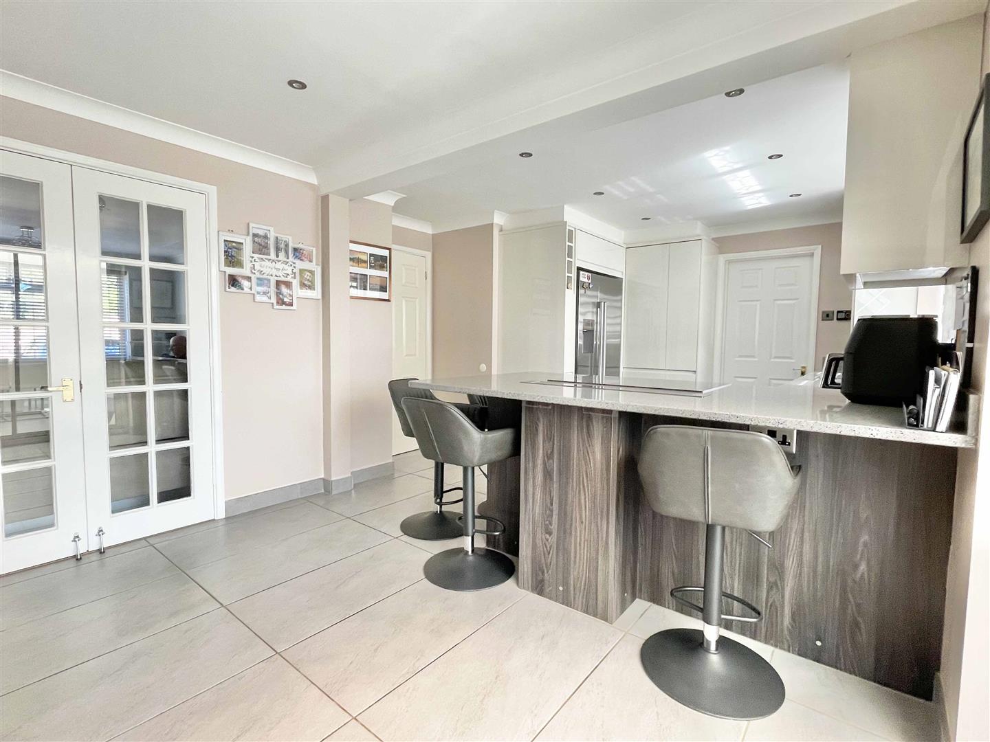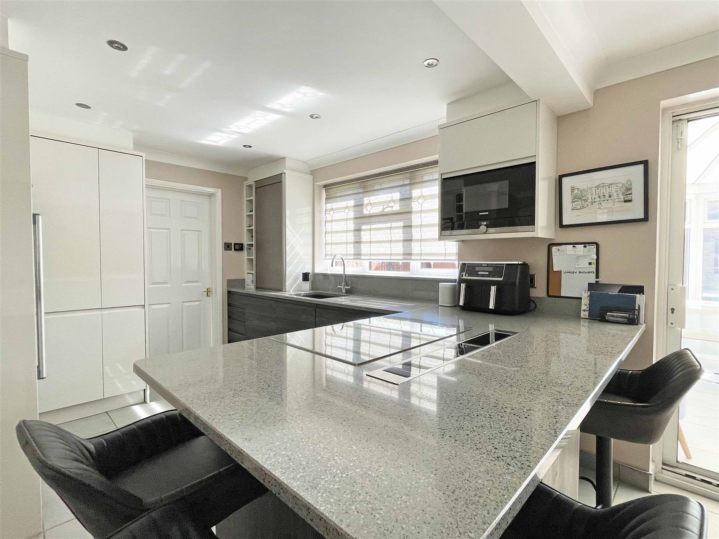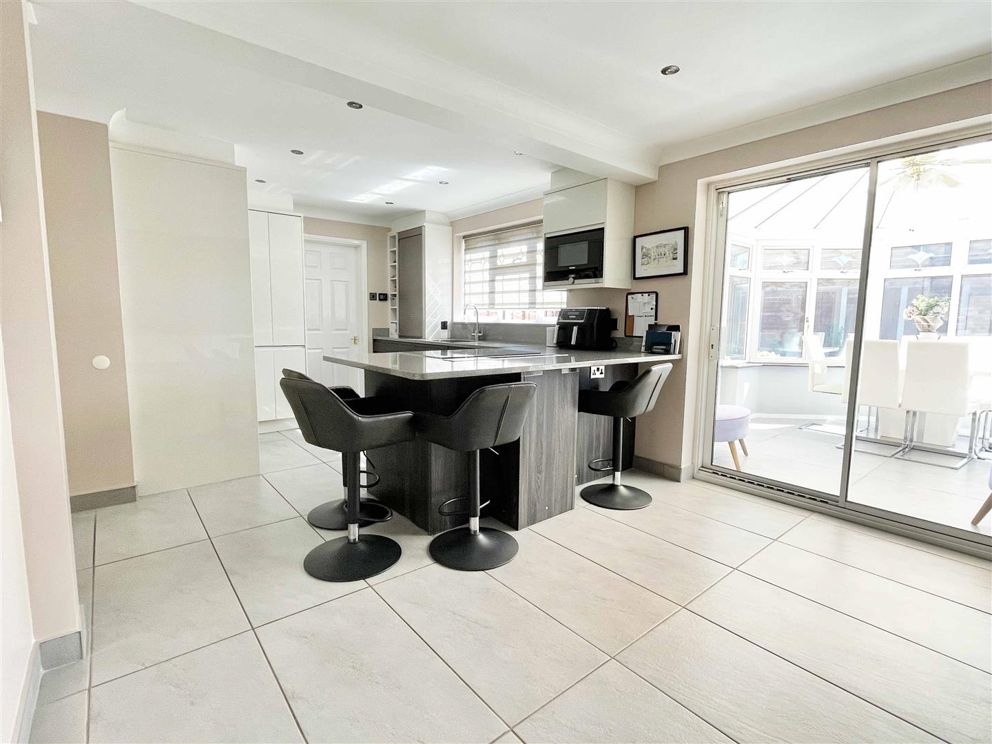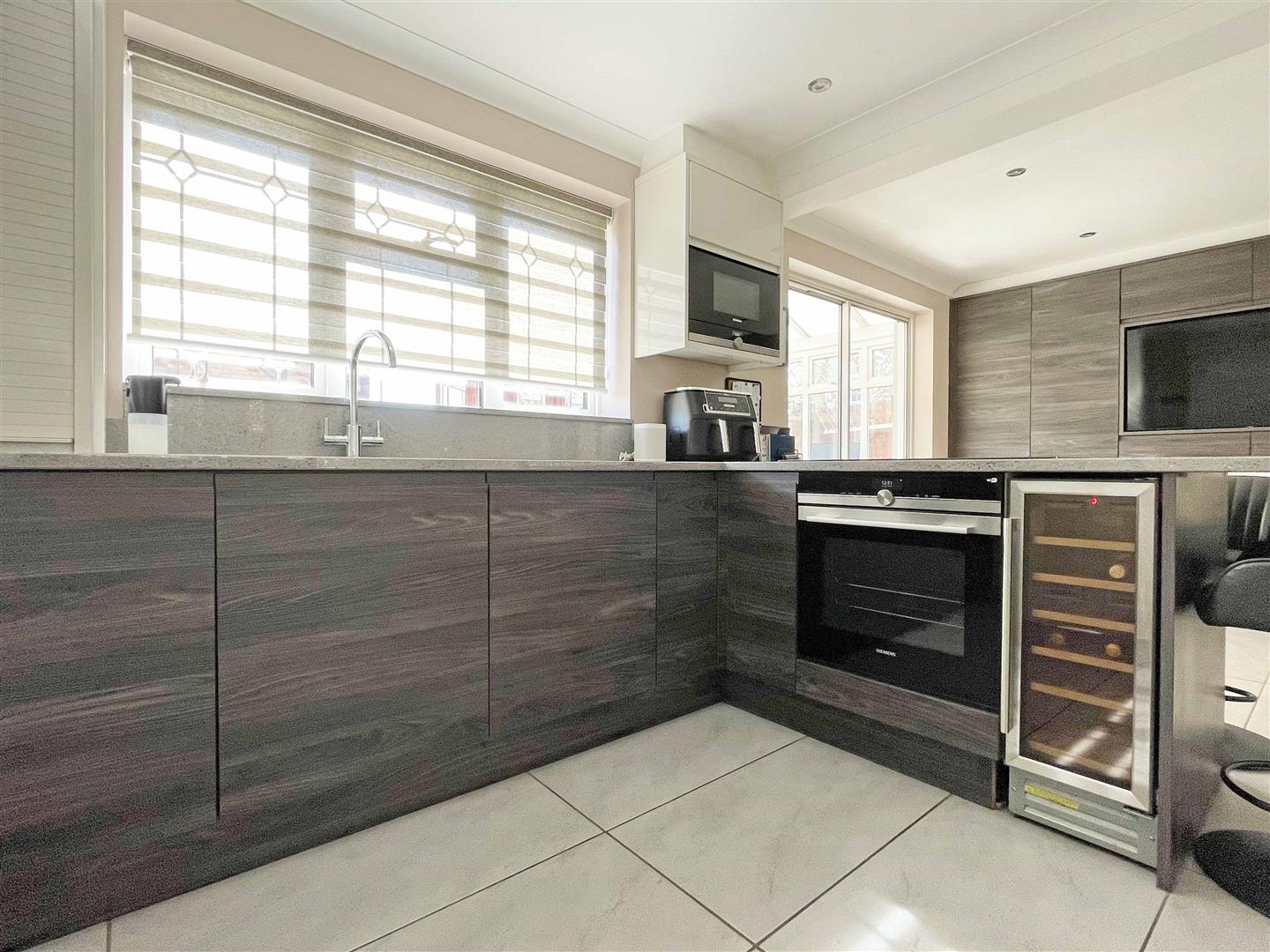 Kitchen Diner: - 5.77m x 3.33m>2.26m (18'11" x 10'11">7'05" ) - Double glazed window to rear, sliding doors into conservatory, built in media wall, Granite square edge worktops & splashbacks,with composite sink inset, breakfast bar, induction hob with pop-up extractor set in worktop, vast range of matching wall & base units, integrated oven, microwave, wine cooler, dishwasher, space for double fridge freezer, tiled flooring, doors to-