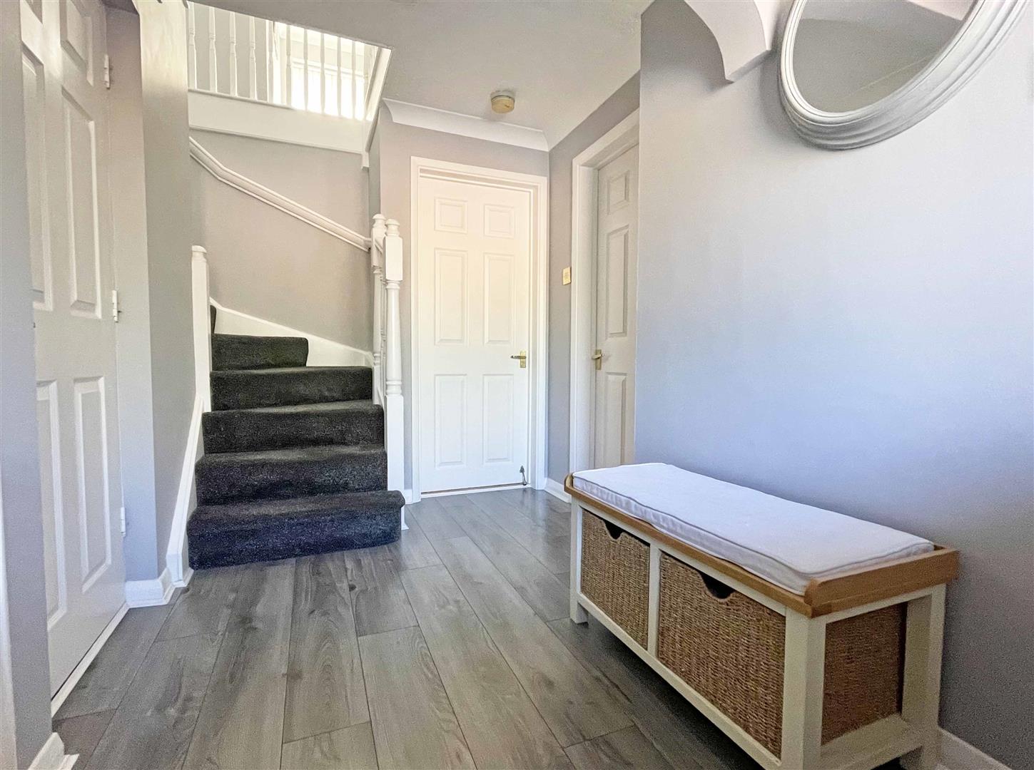 Entrance Hall: - Composite part glazed entrance door into hallway, stairs to first floor, radiator, wood effect flooring, doors to-