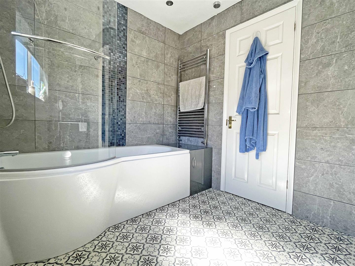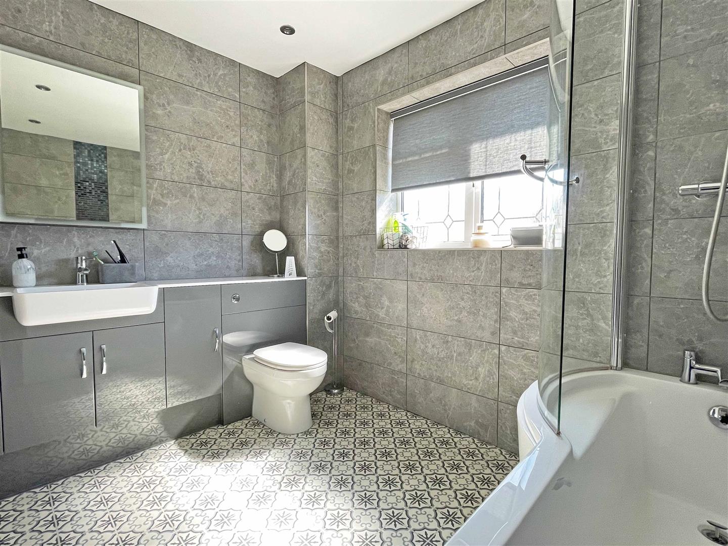 Family Bathroom: - 2.74m x 2.11m (9'00" x 6'11") - Double glazed window to rear, P shaped bath with shower over, vanity hand basin, low level W/C, chrome towel rail, fully tiled, vinyl flooring.