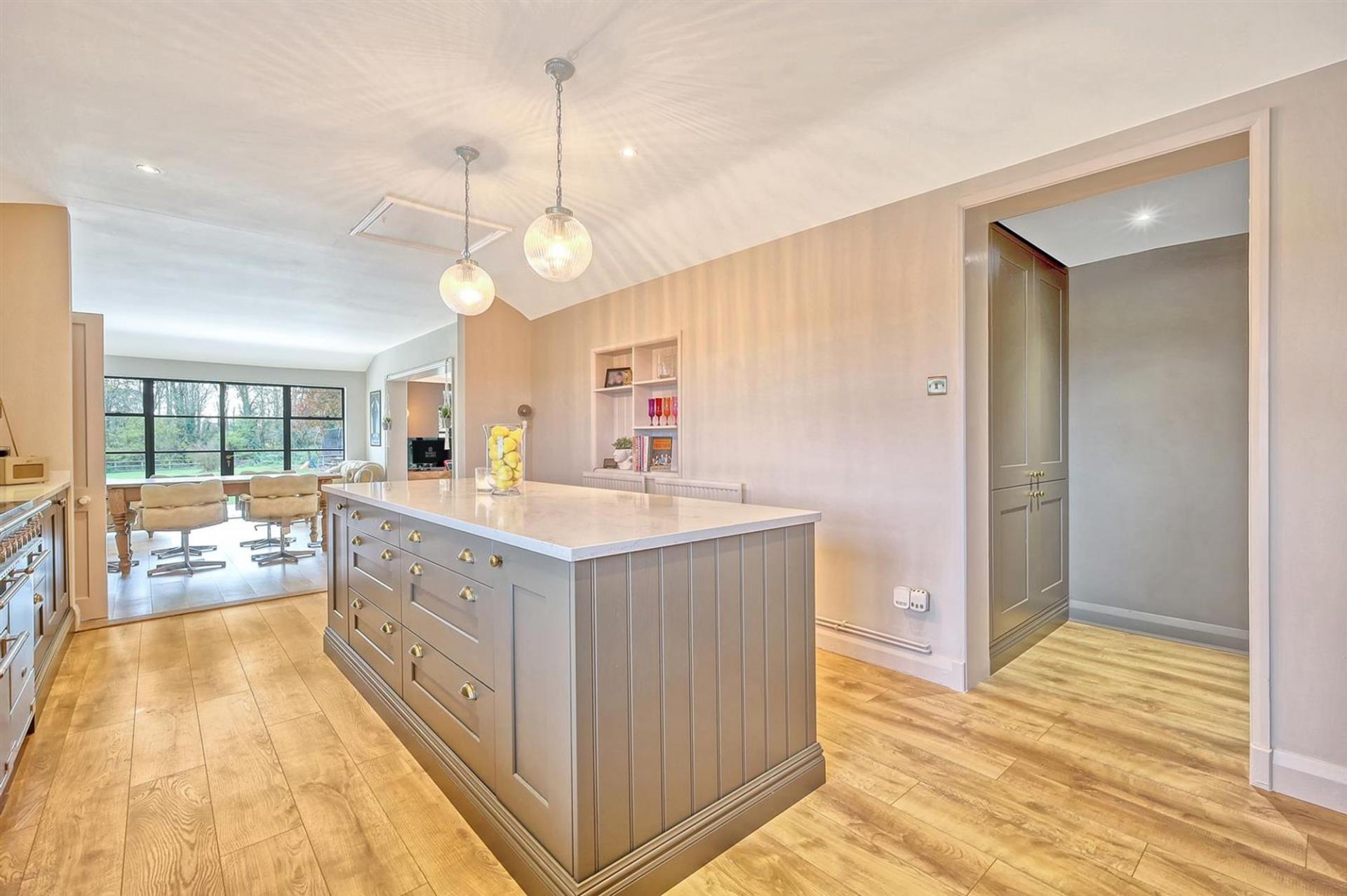 At the heart of the home is the stunning kitchen, featuring a central island and high-quality finishes. It opens onto a dining area with expansive windows, creating a bright and sociable space. A pantry adjoining the kitchen adds practicality, while the open-plan arrangement leads naturally into the living areas.