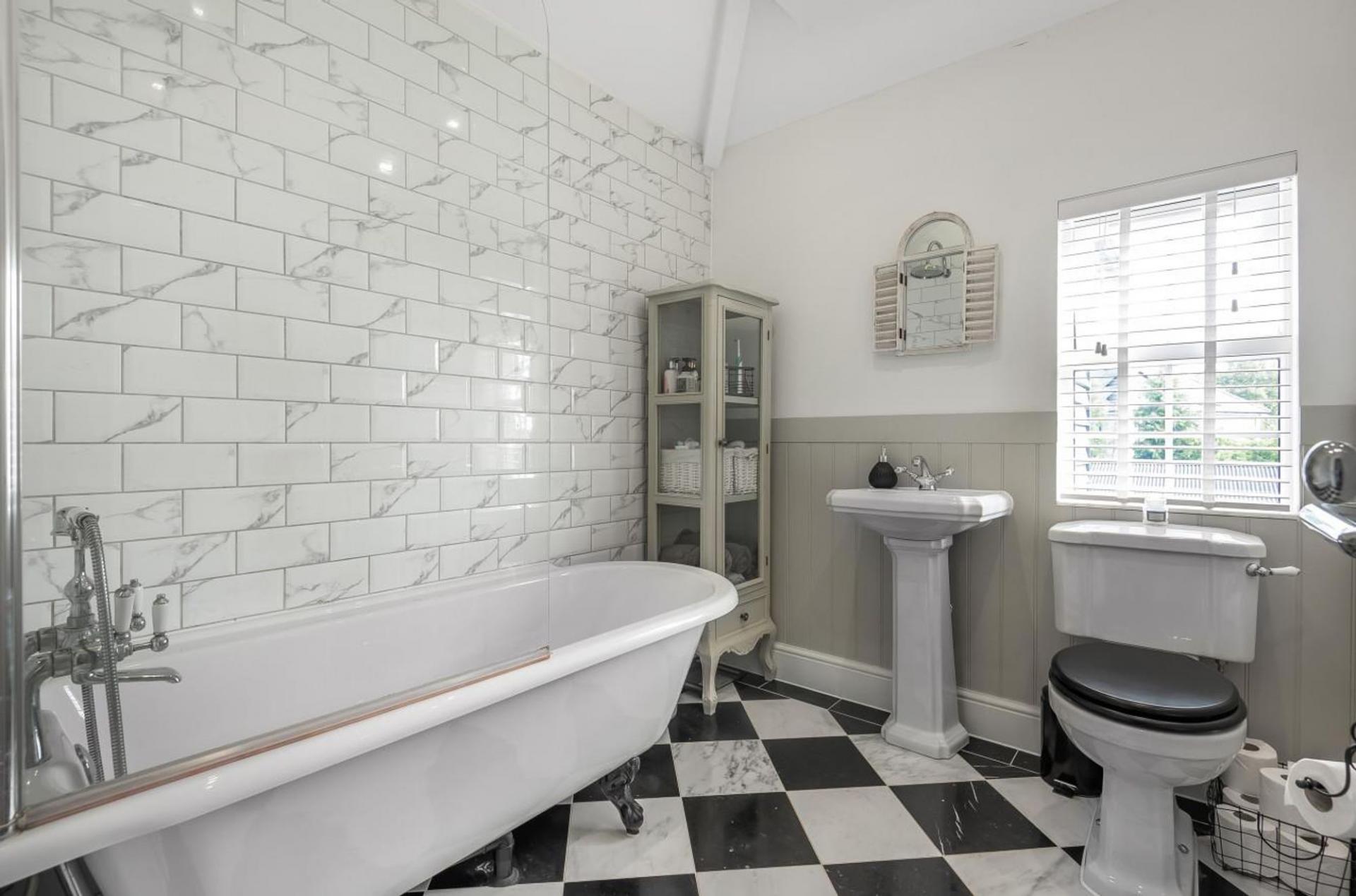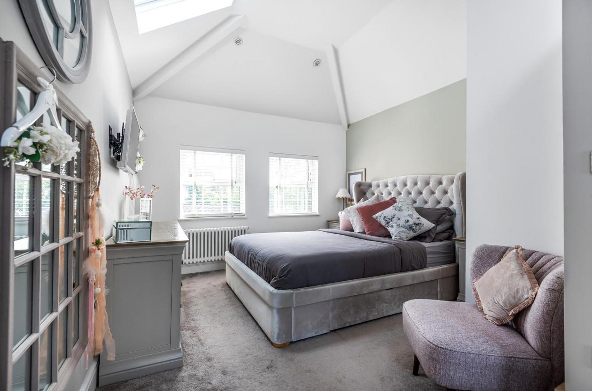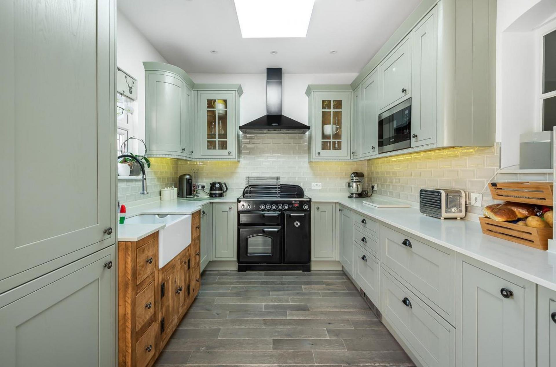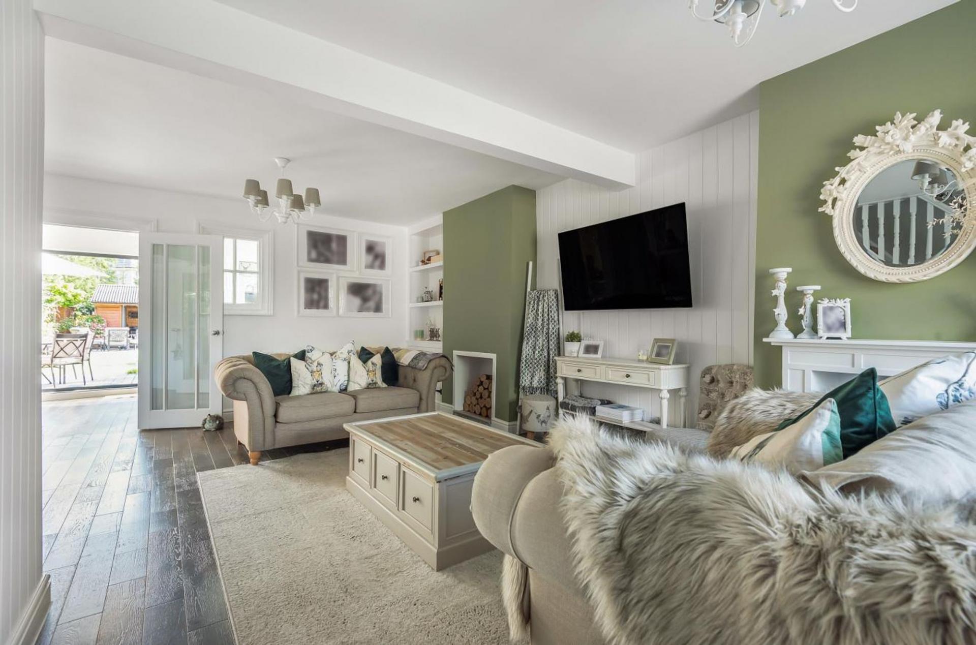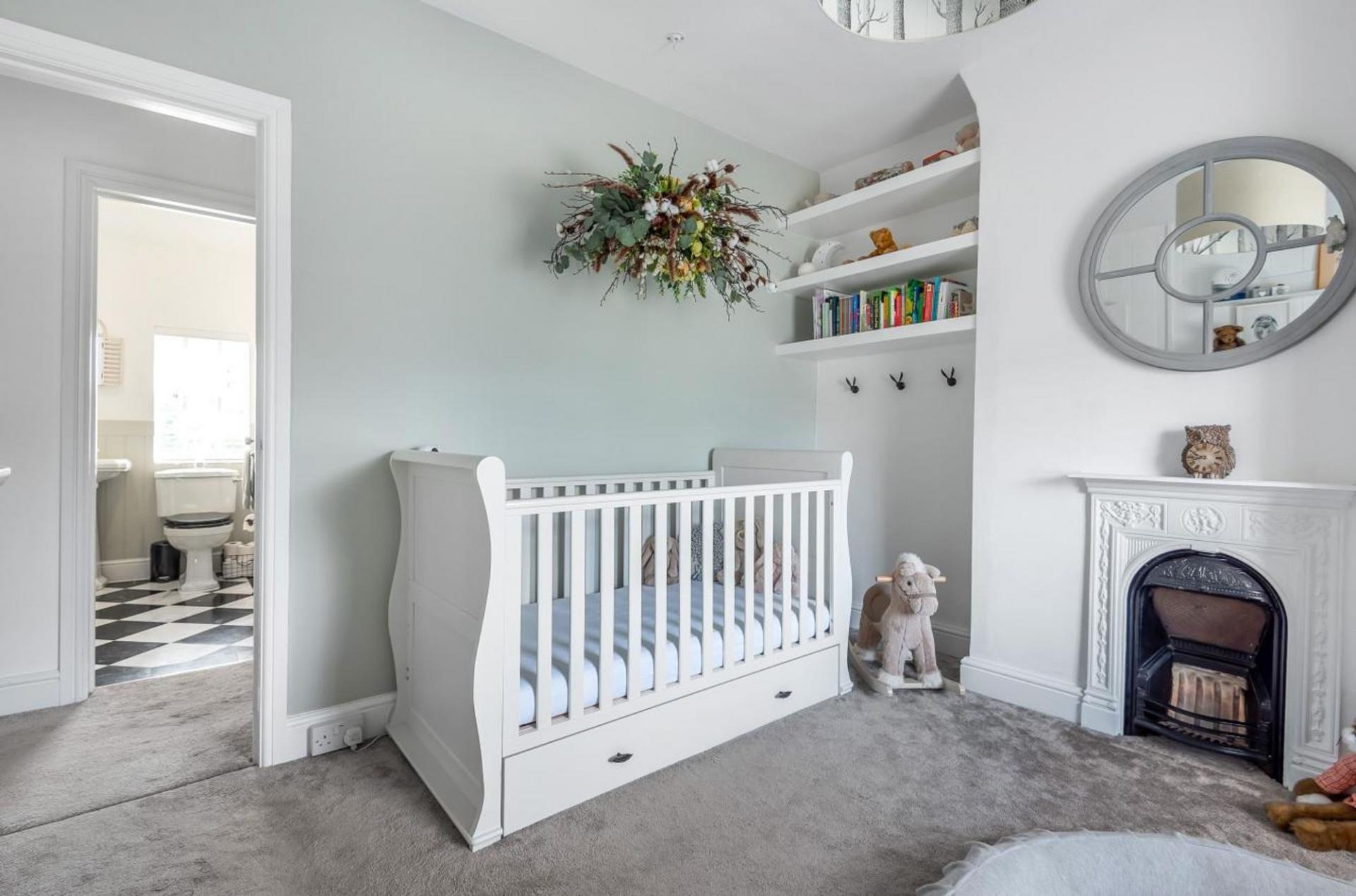 Upstairs, the magnificent dual-aspect principal bedroom spans the full length of the extension, with double height bespoke fitted wardrobes and is enhanced by a vaulted ceiling and inset roof lights. The second bedroom sits to the front, featuring a high ceiling, original cast iron fireplace and built-in wardrobe whilst bedroom three is an attractive single bedroom with views over the rear garden. A charming period-style three-piece bathroom serves the first floor. Outside, the landscaped rear garden includes a superb outbuilding with fitted kitchen, shower room and additional storage, while the front provides driveway parking. The property falls within a well-regarded school catchment and is offered with no onward chain.