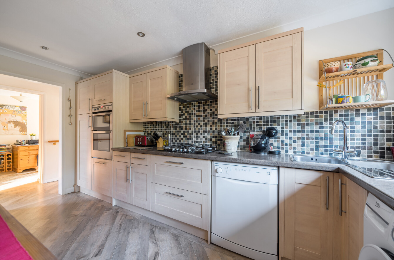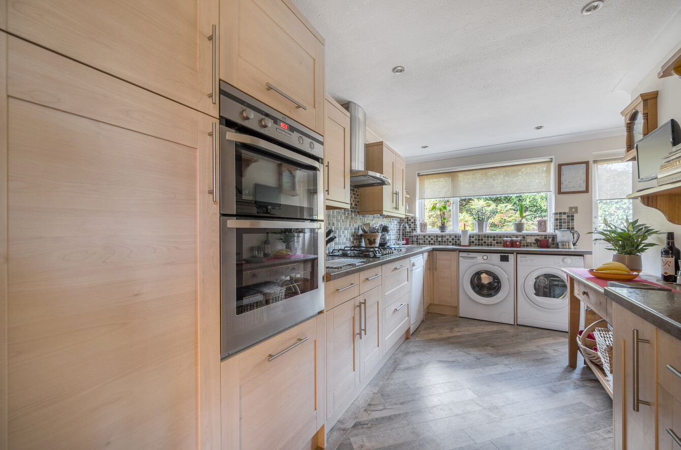 • The kitchen sits centrally with a door out onto a side garden and patio. It benefits from a range of storage, with both cupboards , pan drawers, and pull out larder. There is also a corner sink, built in double oven and gas hob plus space for a washing machine, tumble dryer, fridge freezer and dishwasher