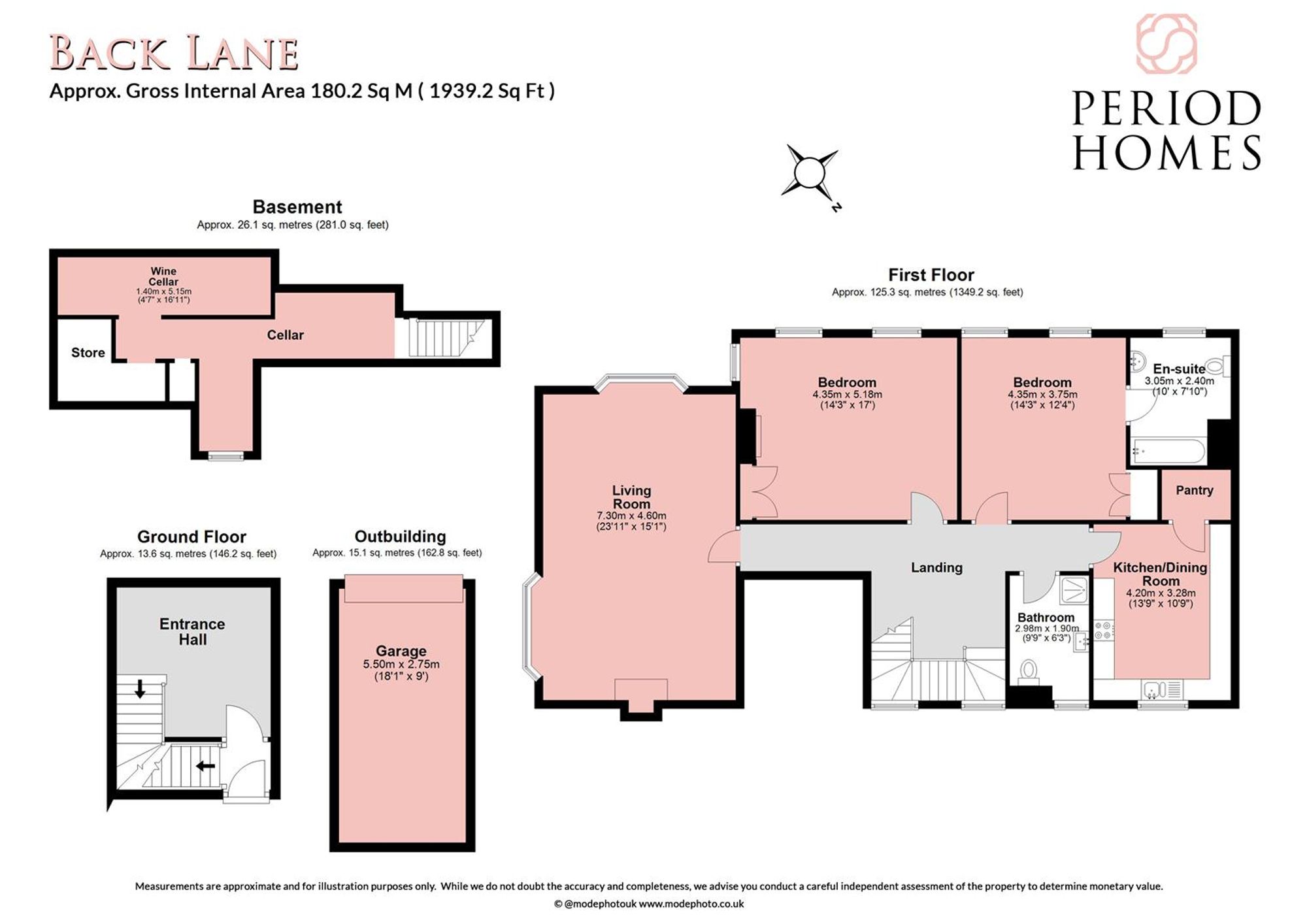 The property also benefits from a cellar, ideal for storage or as a wine room, as well as a garage located within the outbuilding. The total floor area extends to approximately 180 sq. m. (1,939 sq. ft.), providing generous and versatile living space.