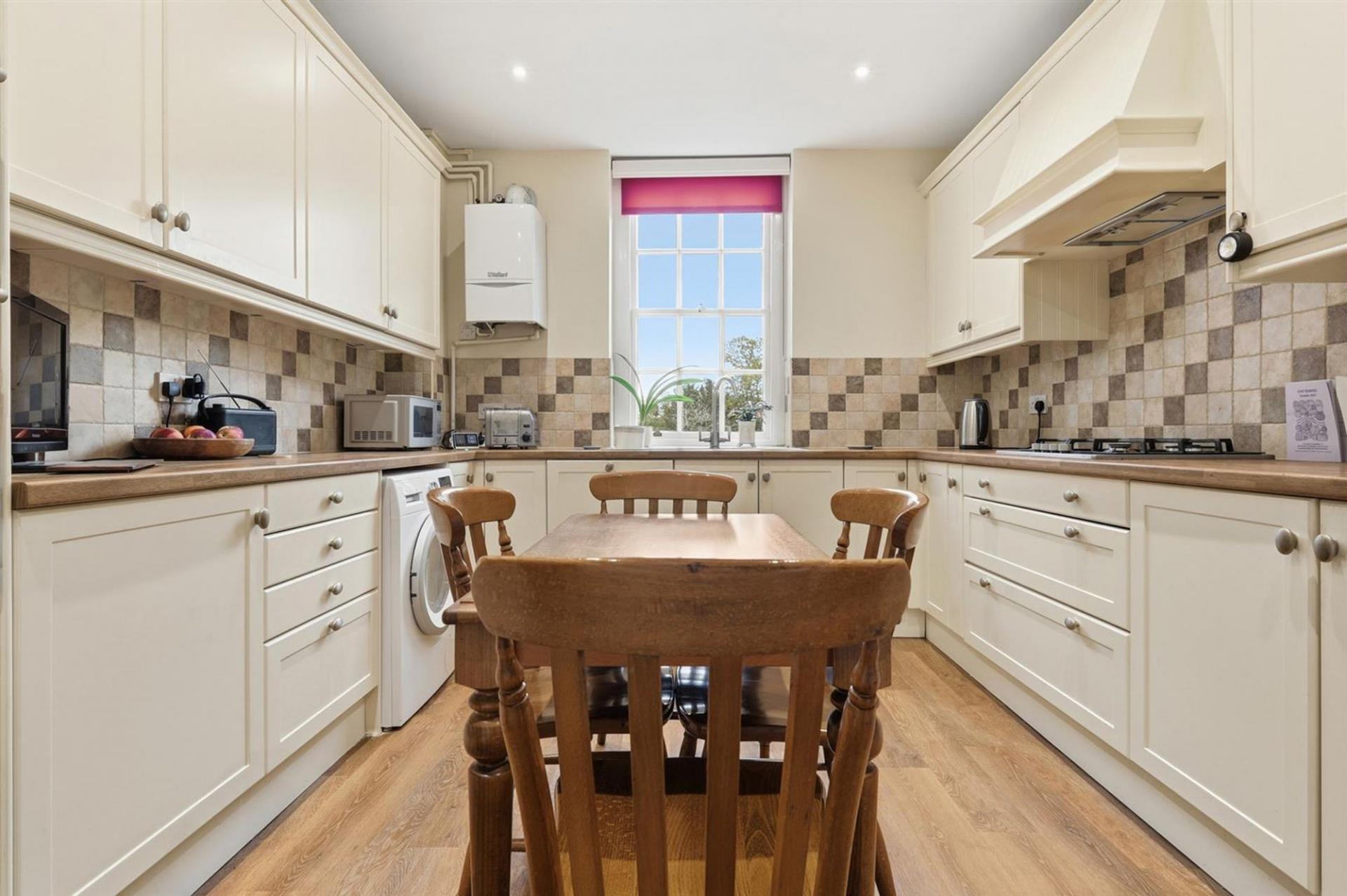Inside, the home opens to an impressive living room with generous dimensions and an abundance of natural light, enhanced by period detailing and a graceful bay window overlooking the gardens. The kitchen/dining room combines classic charm with practicality, featuring ample space for entertaining. Two spacious bedrooms, including a superb principal suite with an en-suite shower room, offer serene views across the grounds, while a well-appointed family bathroom completes the accommodation.