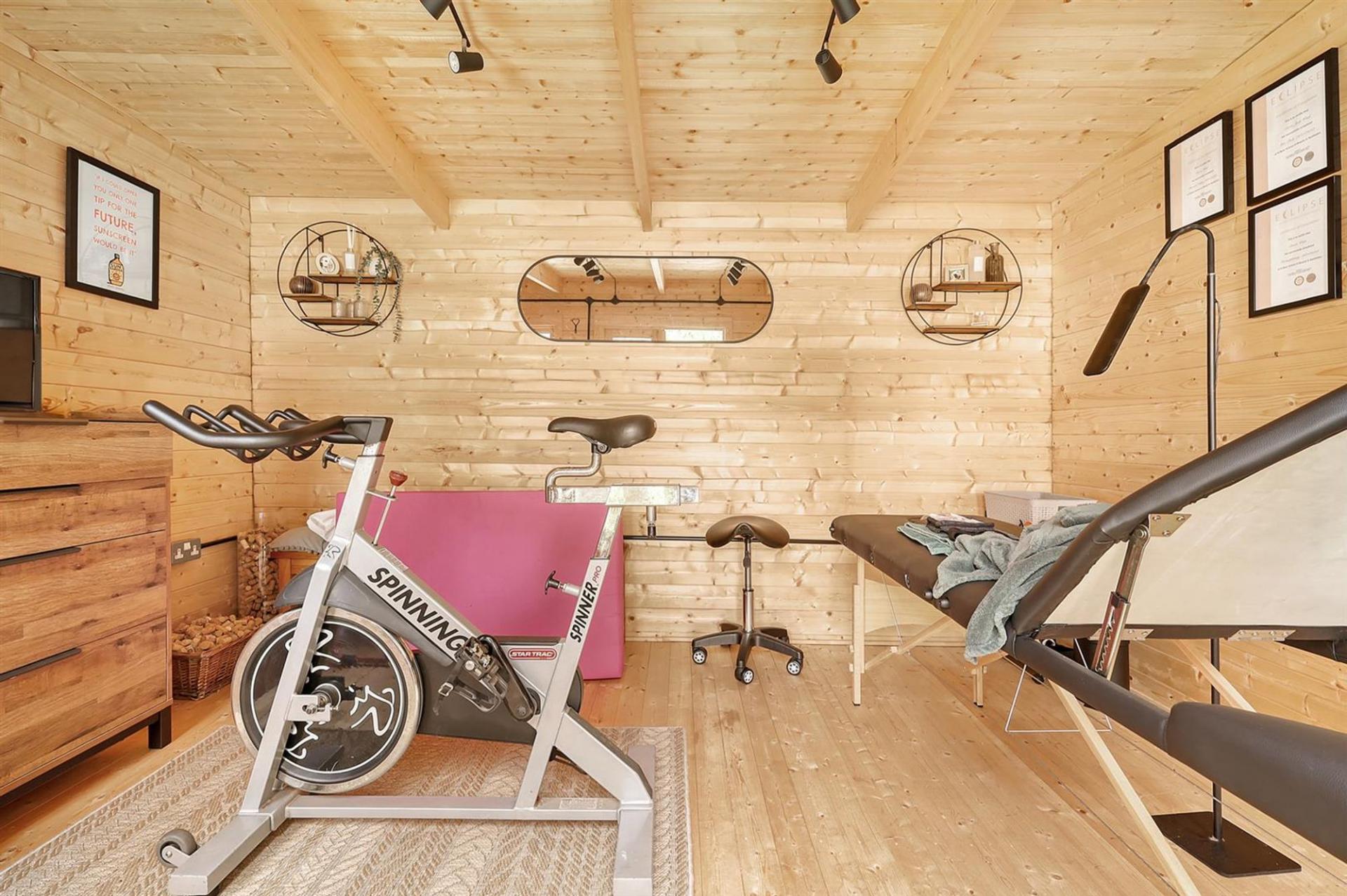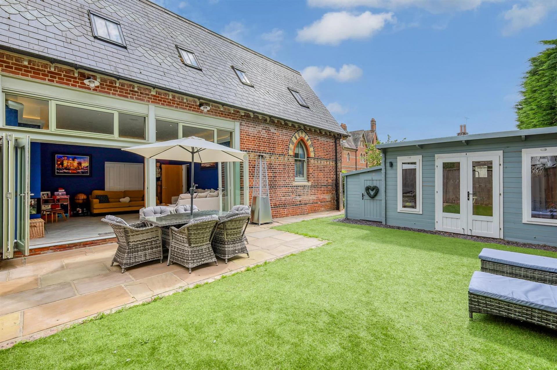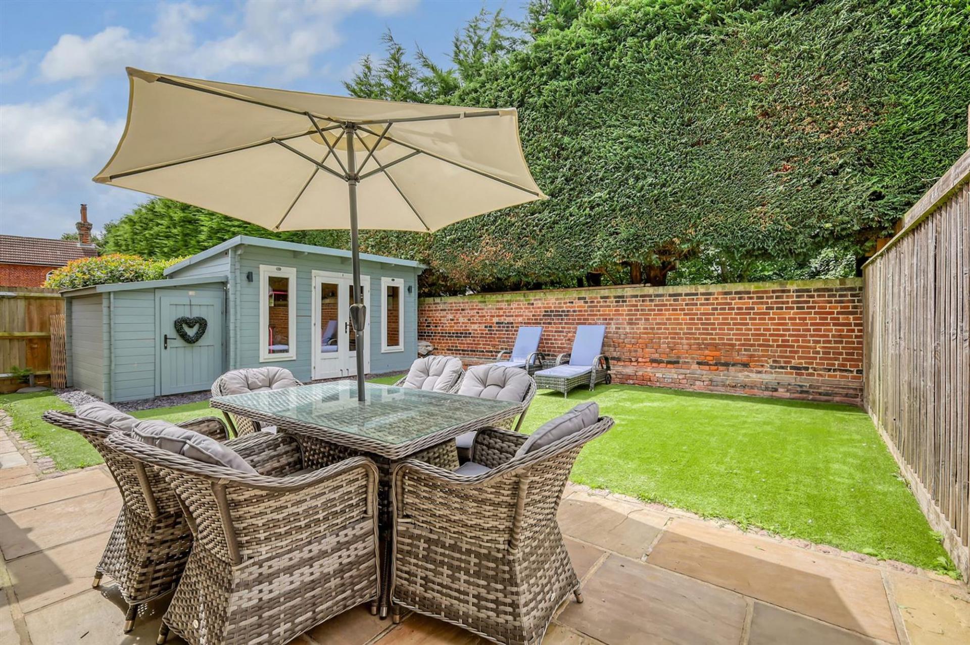 Externally, the walled rear garden provides a private, tranquil space. It begins with a natural stone-effect patio, ideal for alfresco dining, and continues with a lawn, garden cabin, and gated access to the front driveway.