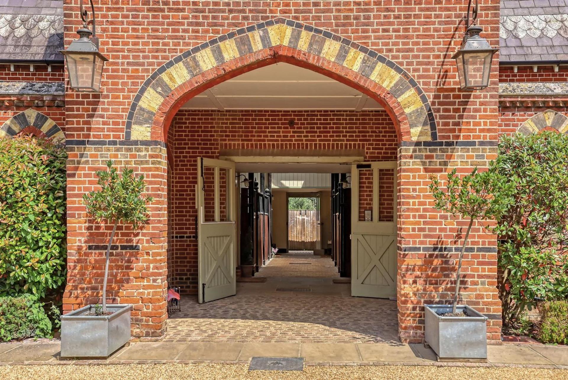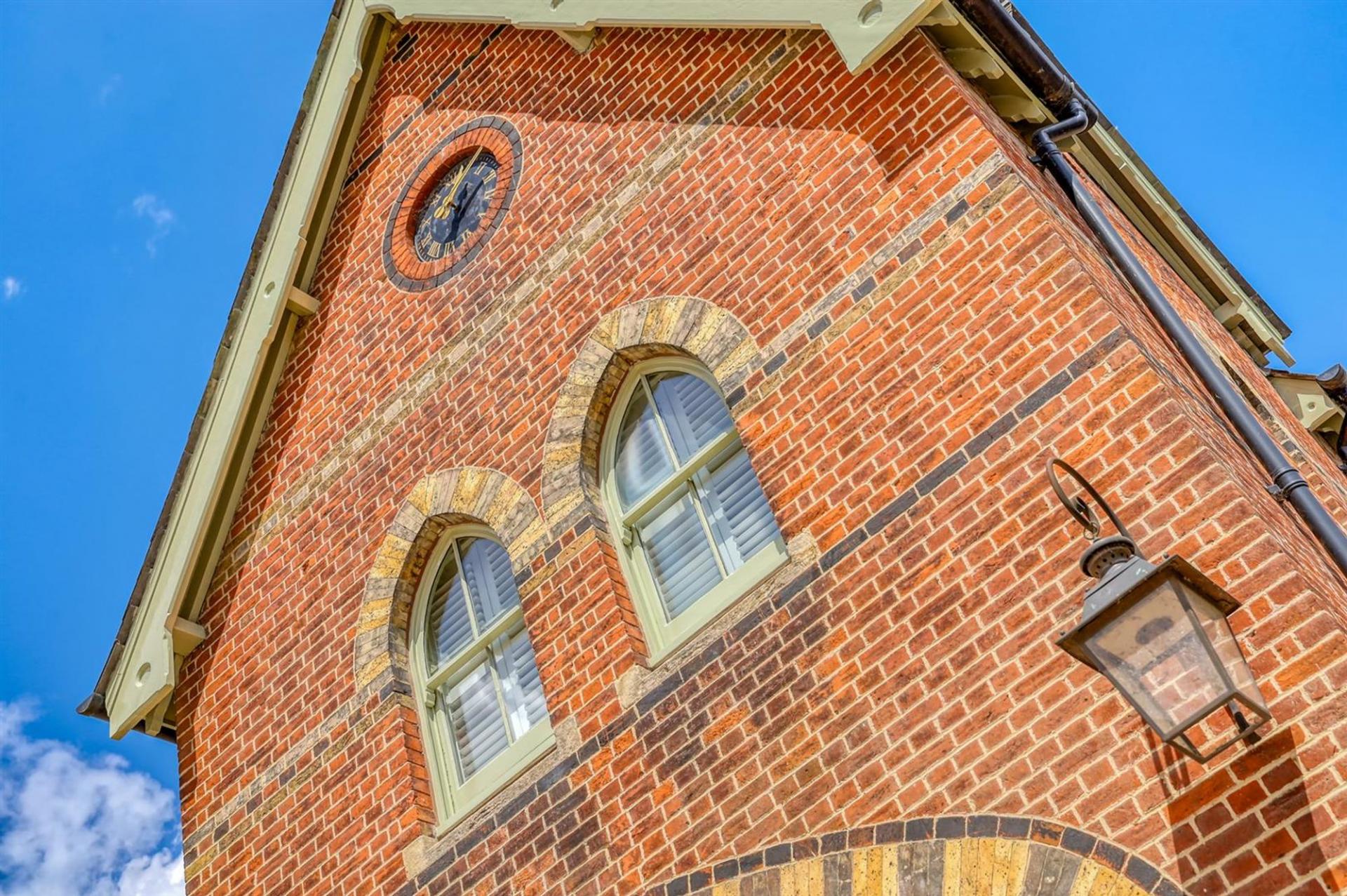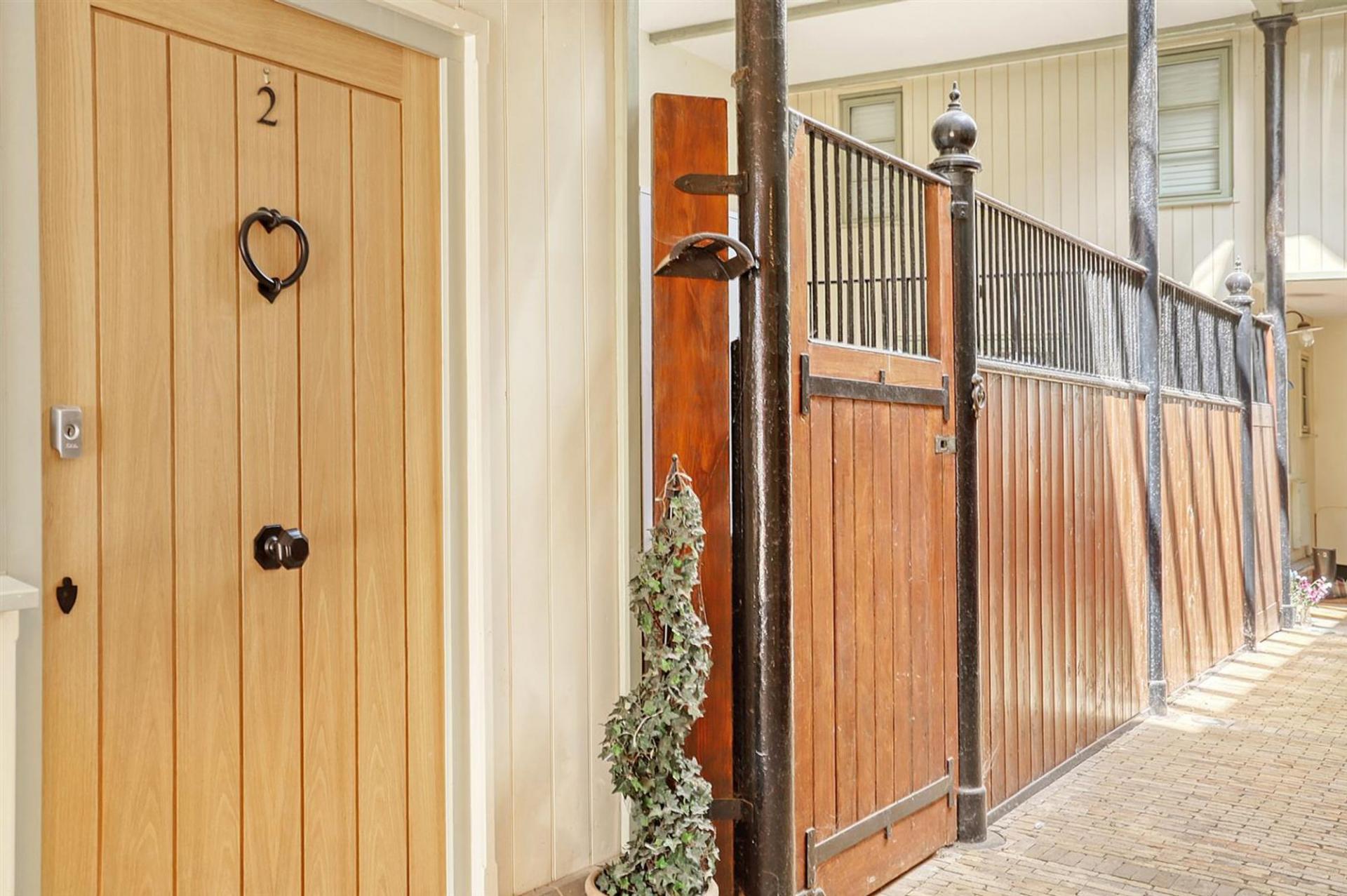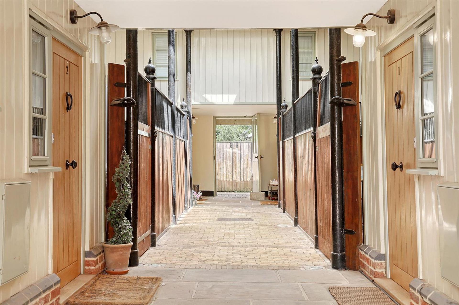 The home is approached via a tree-lined driveway leading to a secure gated parking area with space for two vehicles. Positioned at the front of the original building, the house welcomes you with a charming entrance hallway opening into a private indoor courtyard. Set beneath a glazed atrium and framed by restored Victorian cast iron stables, this space offers a unique setting for outdoor dining, entertaining, or relaxation.