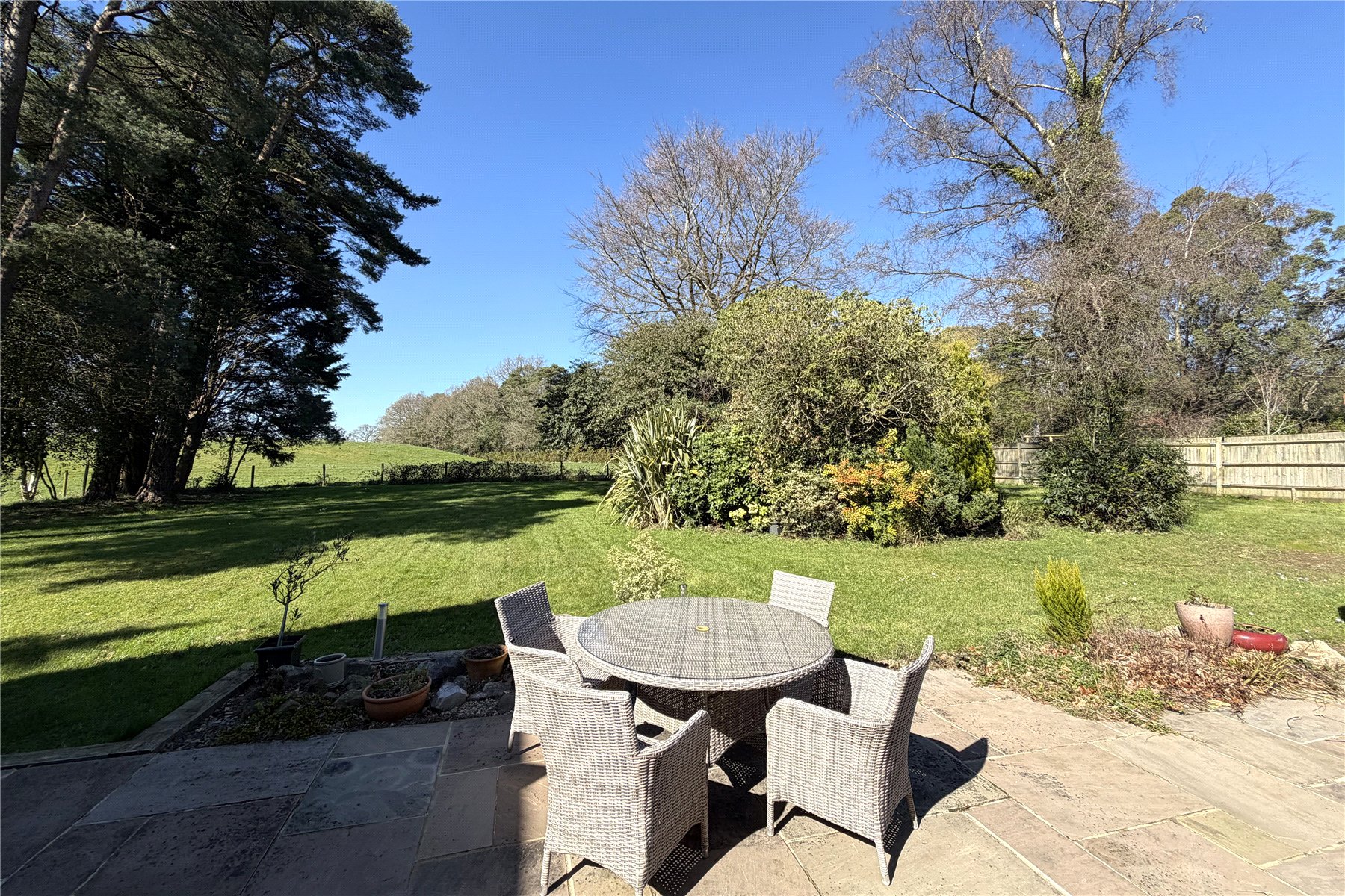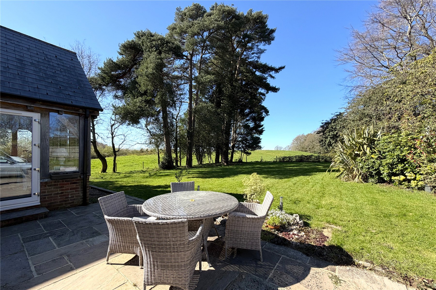 Such an exceptional view! The rear garden is mainly laid to lawn with a patio area adjacent to the sitting room to sit and enjoy the views over the fields.