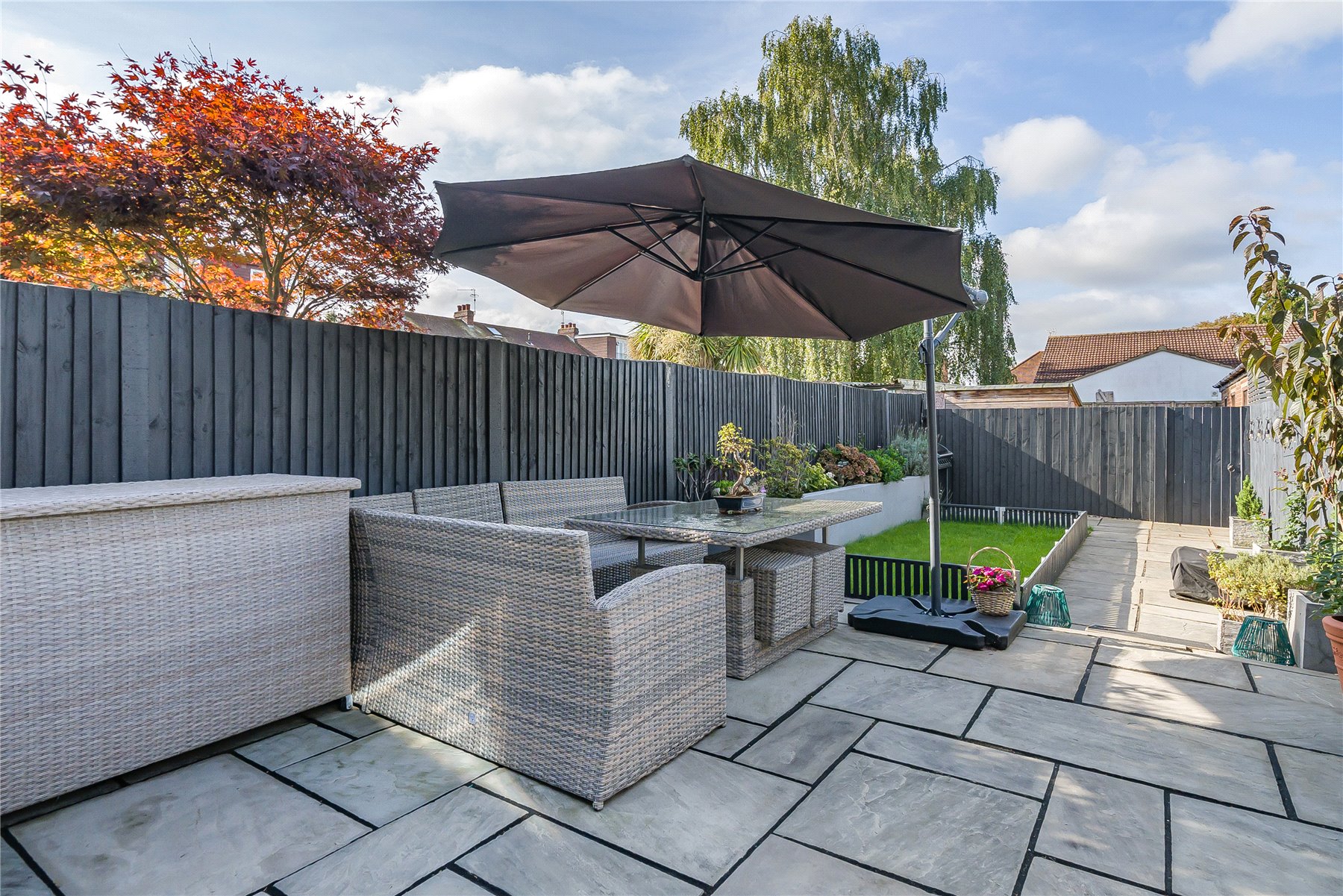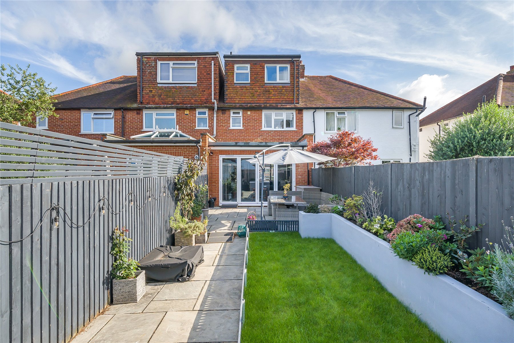 Outside, the rear garden has two sections. A pretty space with lawn area, large patio and various plants. Then beyond that is a hard standing area which could be used to create a home office/studio. To the front of the property ample off street parking for two cars.