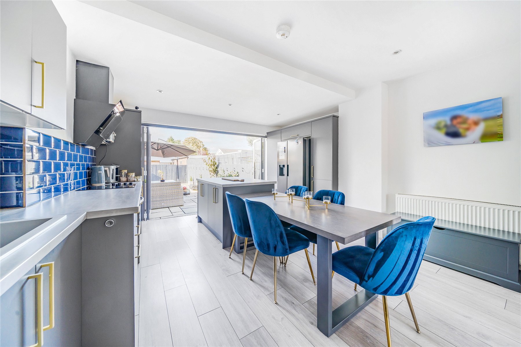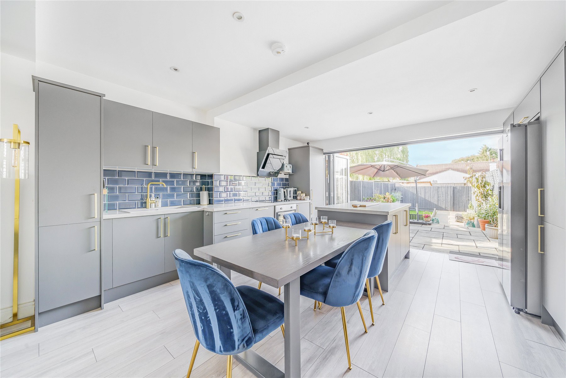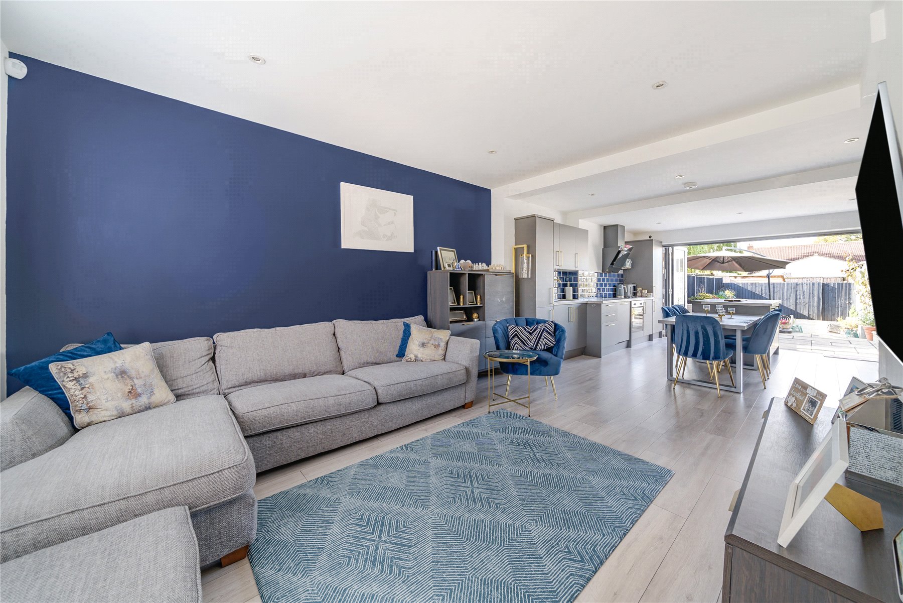 The accommodation on the ground floor is open-plan and comprises a superb 29' lounge/kitchen/diner with island and patio doors into the rear garden.
