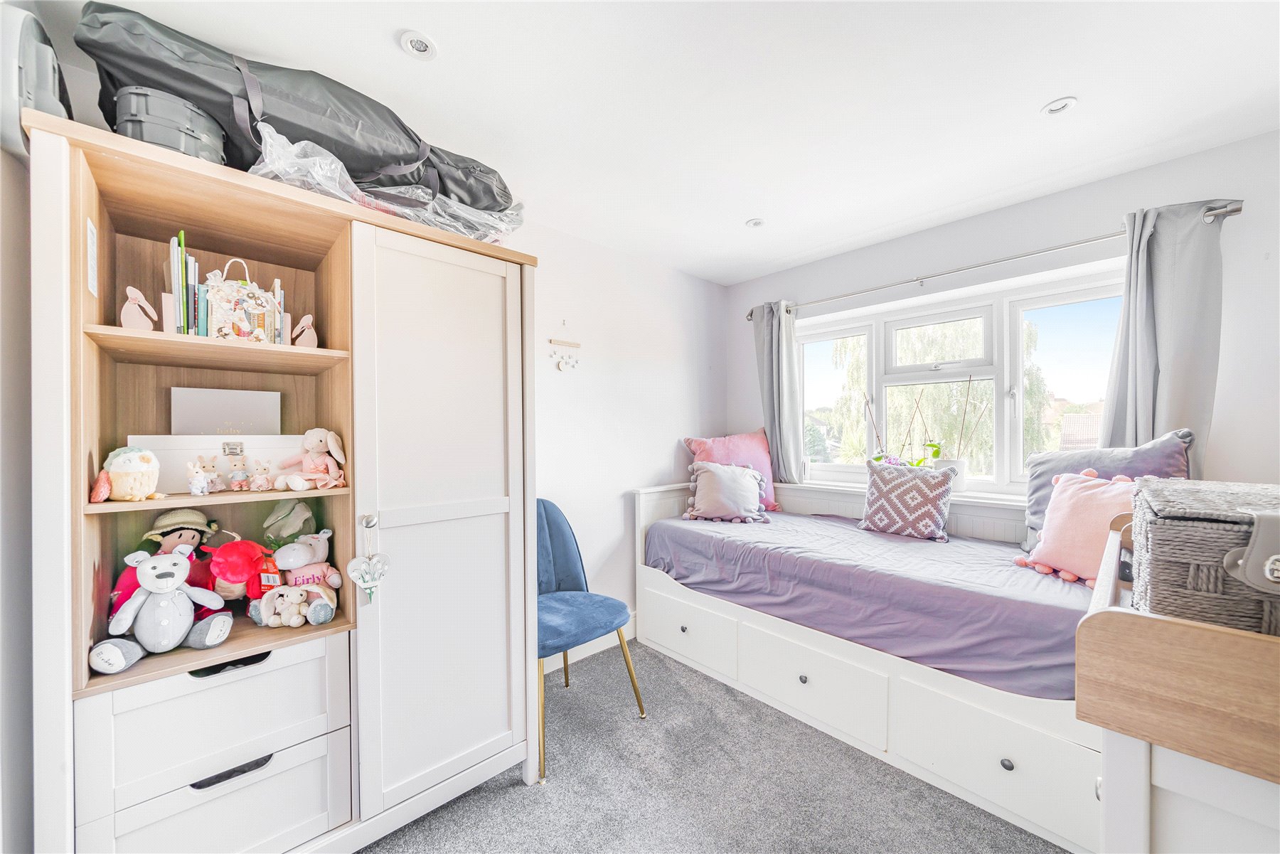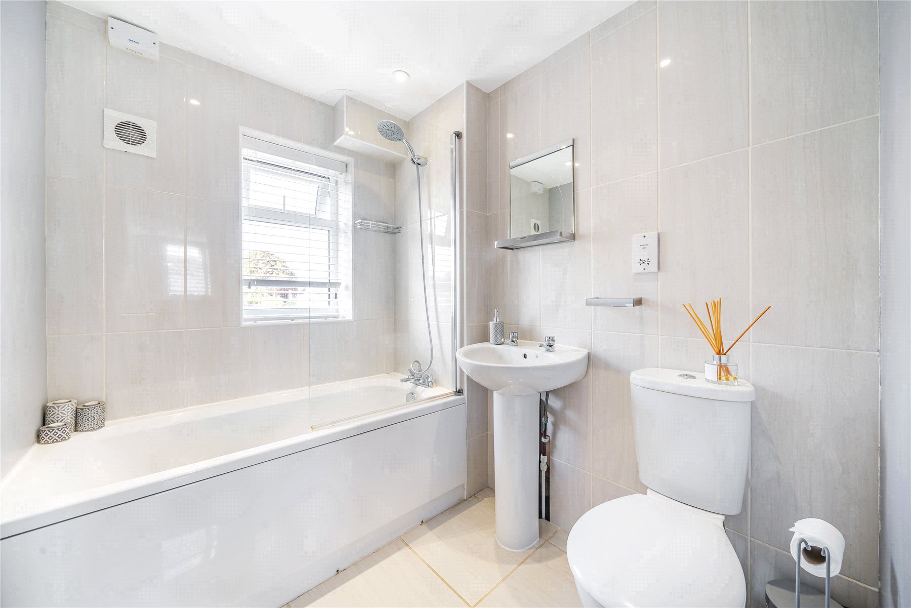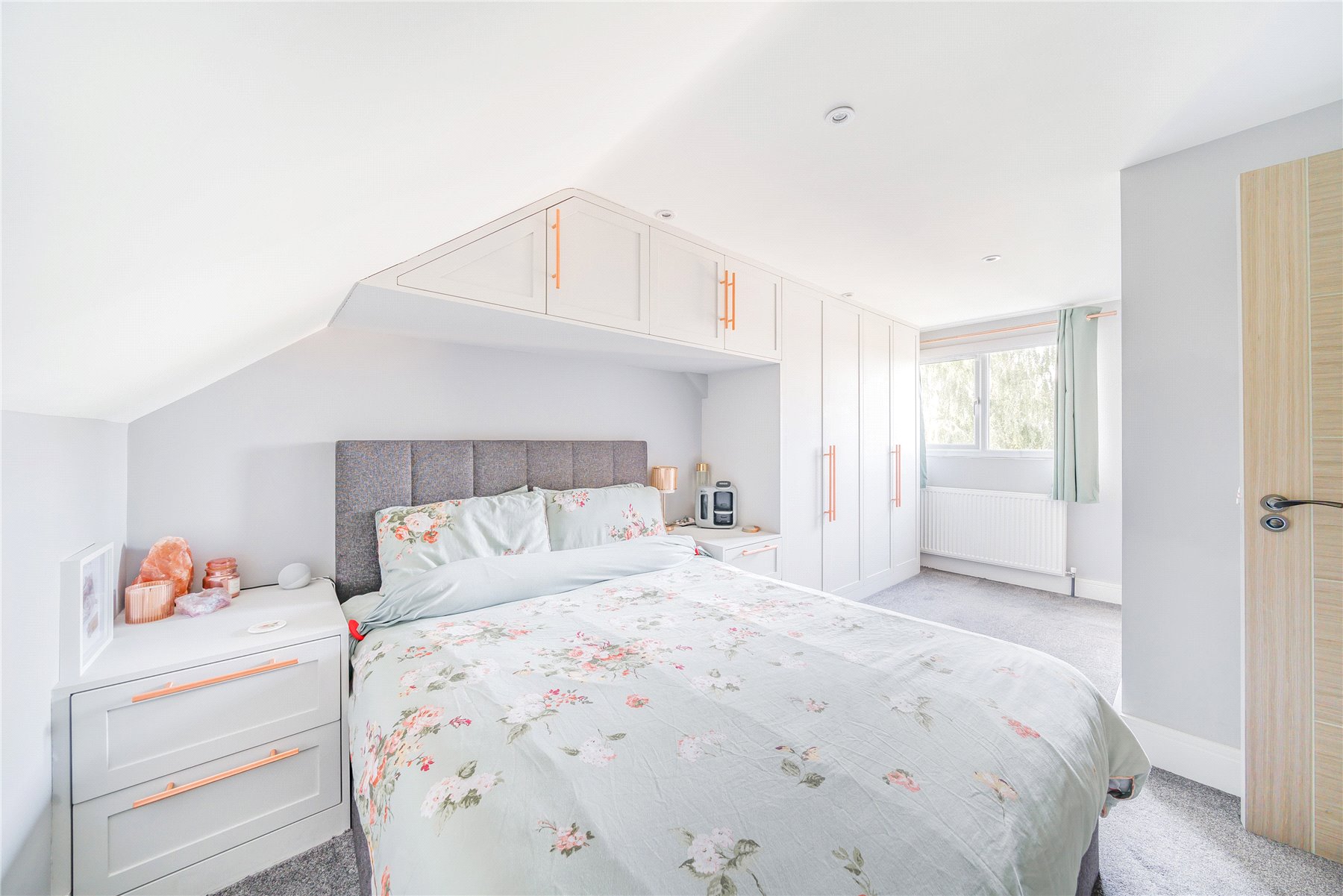 On the first floor there are two double bedrooms, the larger of which has fitted wardrobes, and a well-appointed family bathroom. The top floor has a superb main bedroom with wardrobes and access to eaves storage, as well as a lovely en-suite shower room.