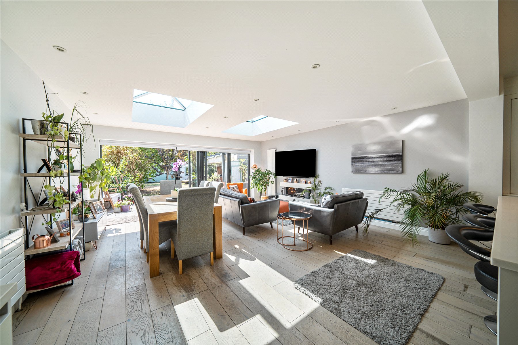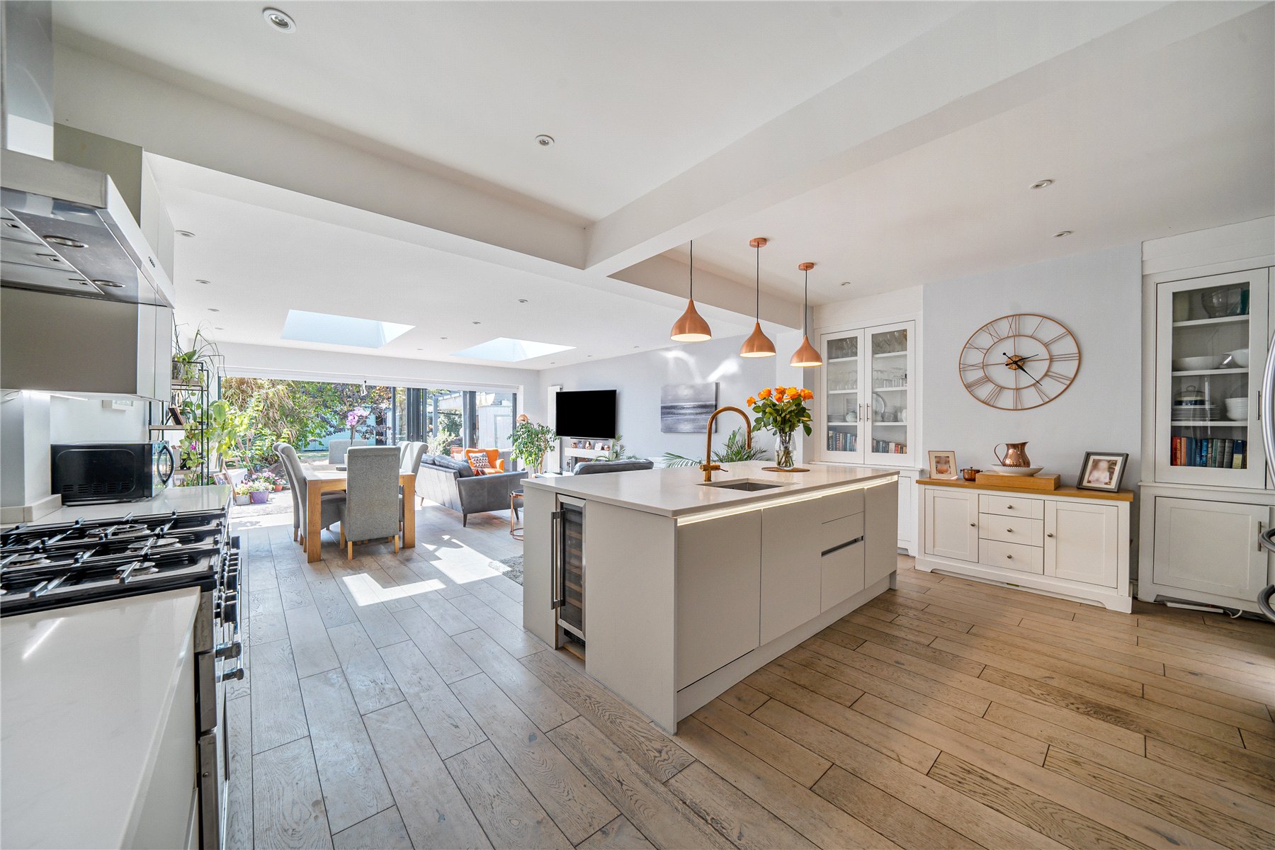 To the rear, the impressive, bright open plan kitchen, dining, and seating area is perfect for modern family living. With ample units, a large marble topped island, dining, and seating areas and bi-fold doors onto the garden, this room is a central hub for entertaining, and seamless indoor-outdoor living.