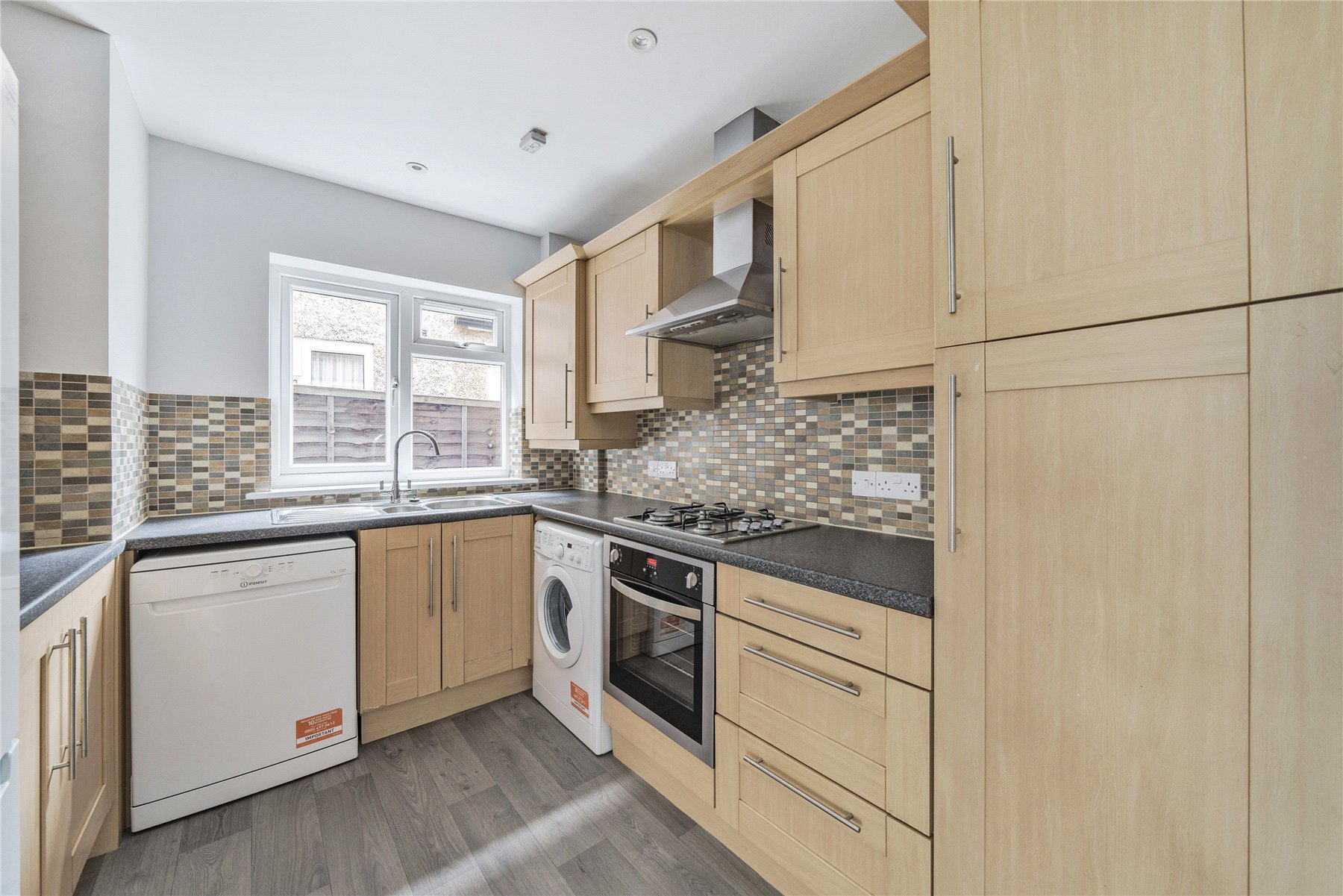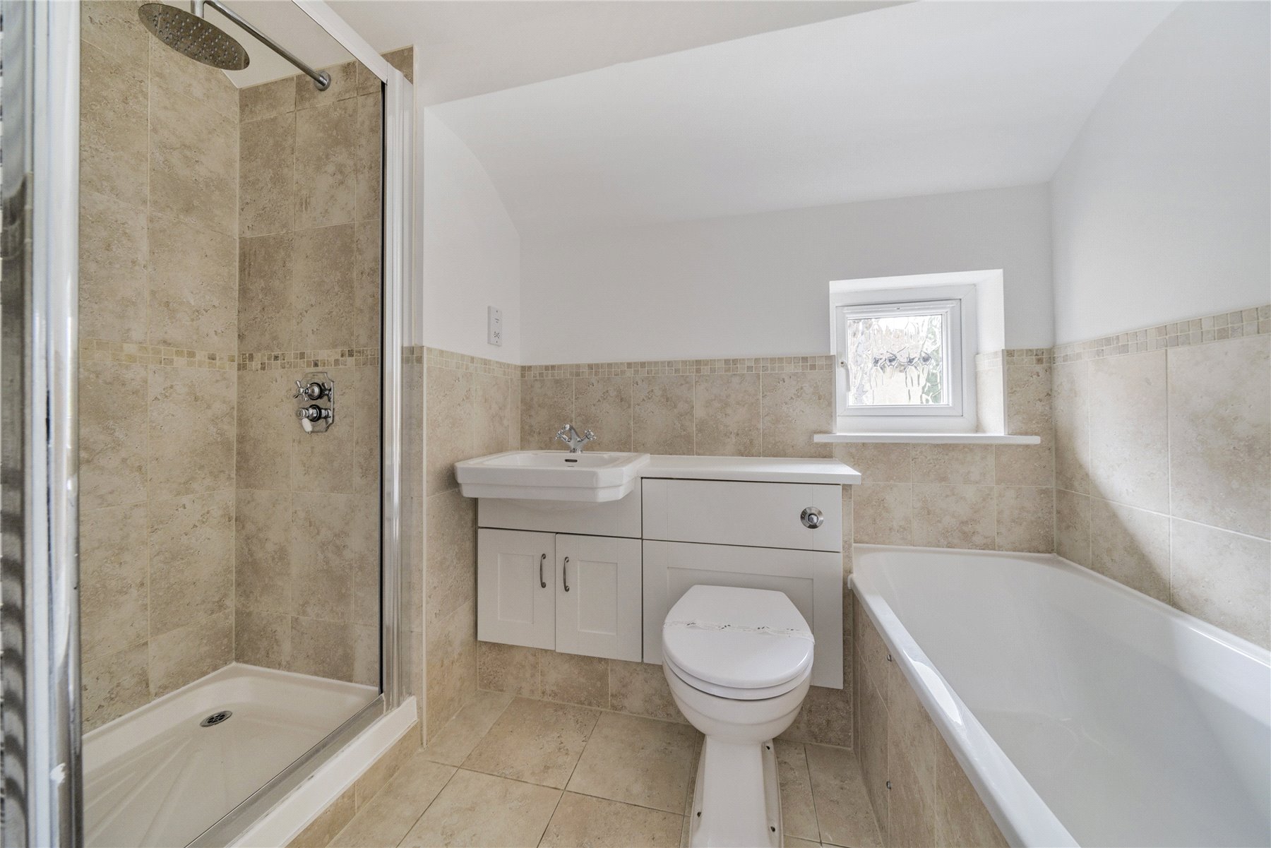 Upstairs there are three spacious bedrooms, with fitted storage in the main room, and a tiled bathroom complete with bath and separate shower cubicle.