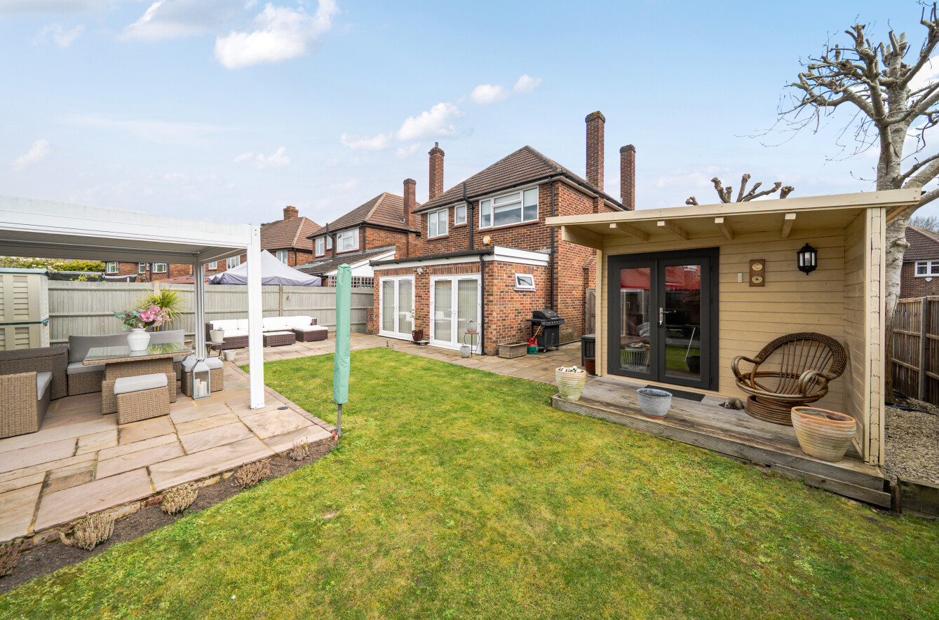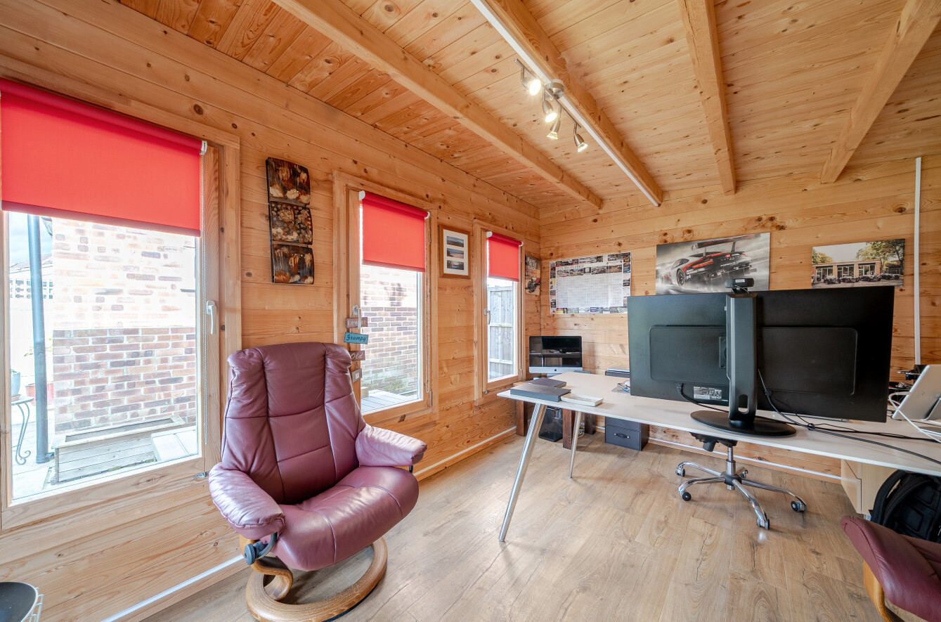 Externally, the property truly excels. The large rear garden, enjoying its sunny south west orientation, offers expansive lawn areas, patio seating, and excellent privacy. Mature trees enhance the sense of space and seclusion. A standout feature is the separate, fully powered and insulated home office, complete with its own electrical distribution board which is perfect for remote working or a creative studio. In addition, a pergola seating area provides a charming spot for outdoor dining and entertaining.