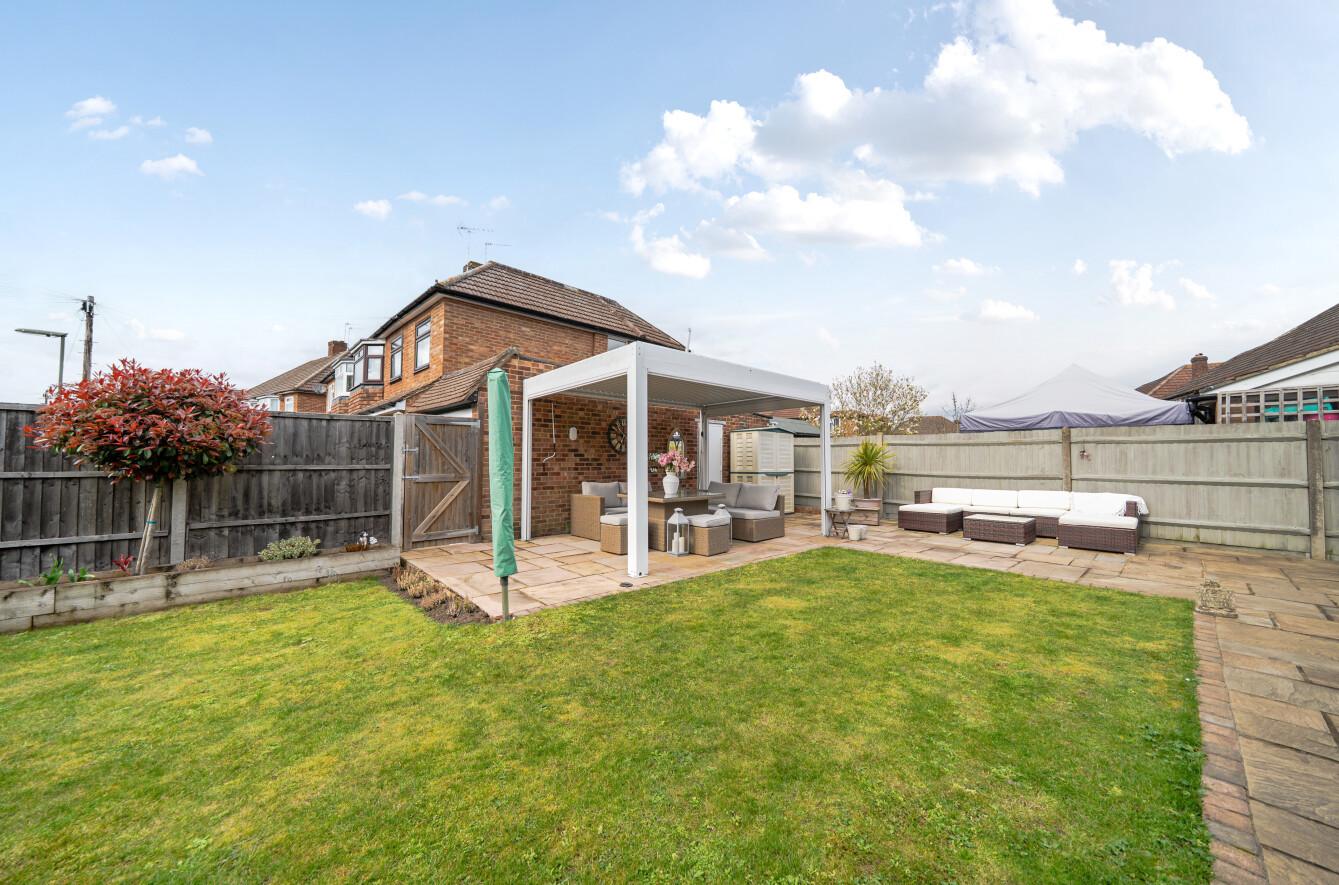 To the rear of the garden is a detached garage, accessed via a second driveway, offering excellent parking and storage options. The main driveway provides off street parking at the front of the property, alongside a substantial wrap-around front garden, reinforcing the benefits of the corner plot and providing further scope for landscaping or extension (subject to the usual consents).