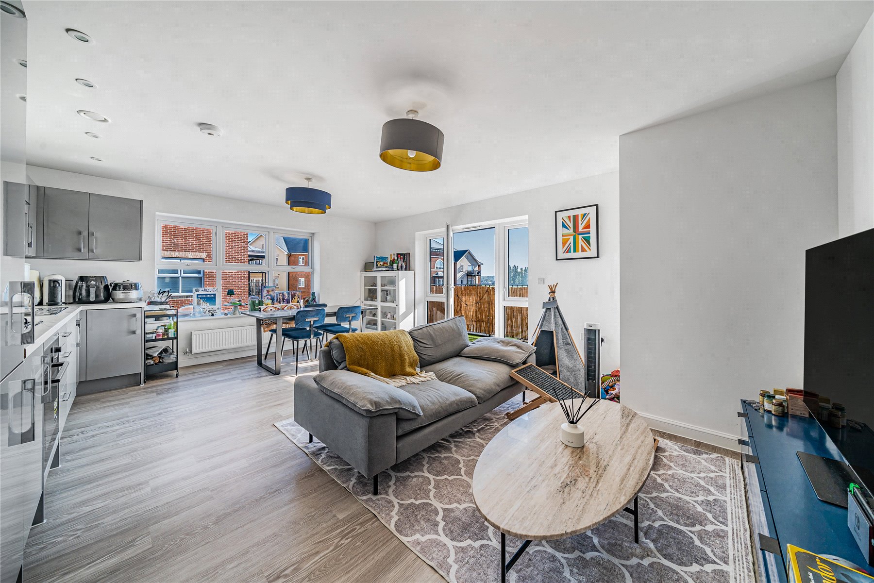 The open plan kitchen provides a range of base and wall mounted glossy grey units, with four ring gas hob, electric oven, integrated tall standing fridge freezer and dishwasher. The living area has dual aspect windows, including double doors leading to the balcony.