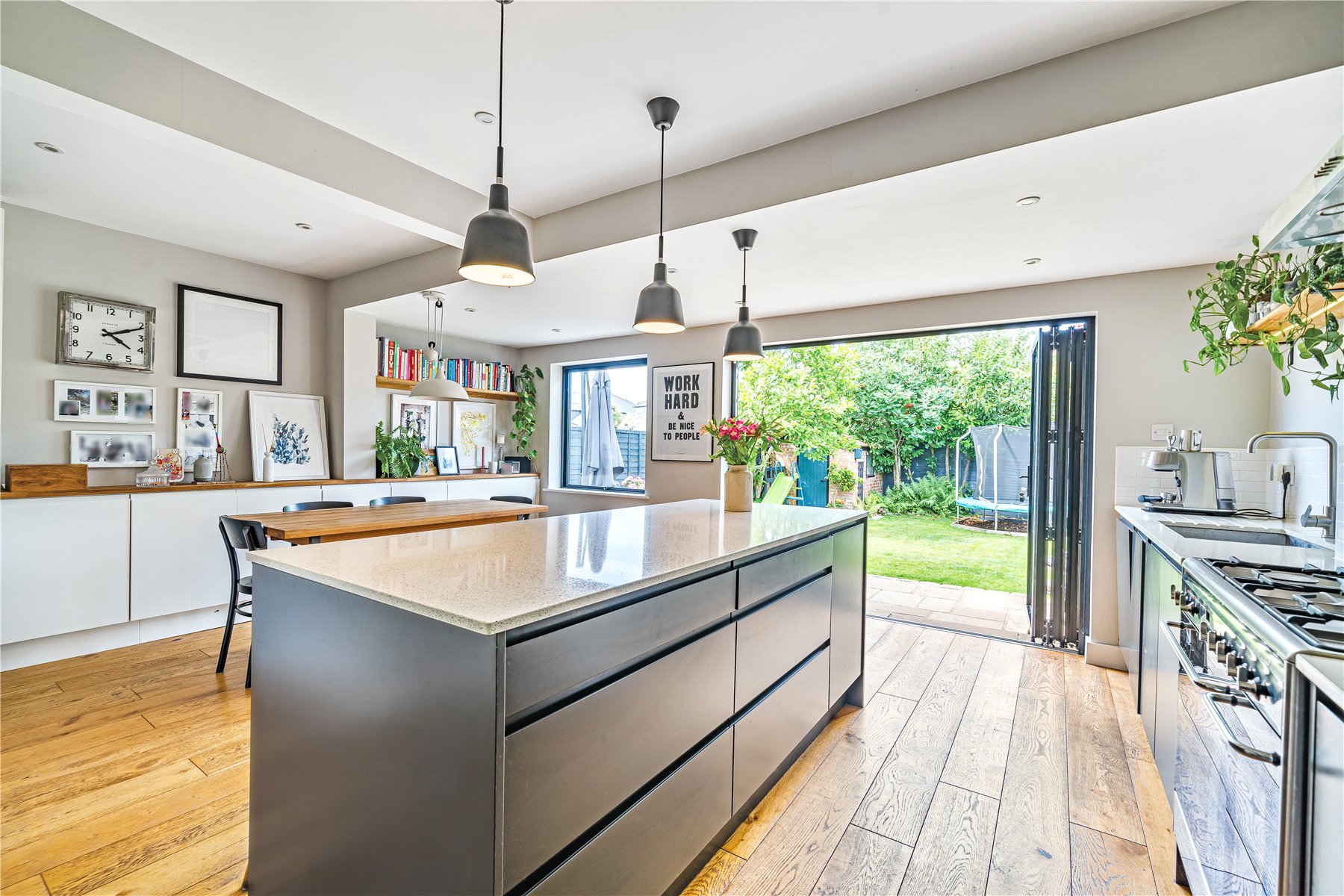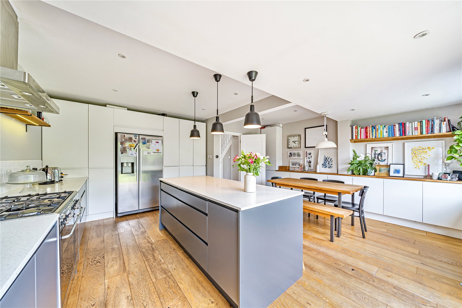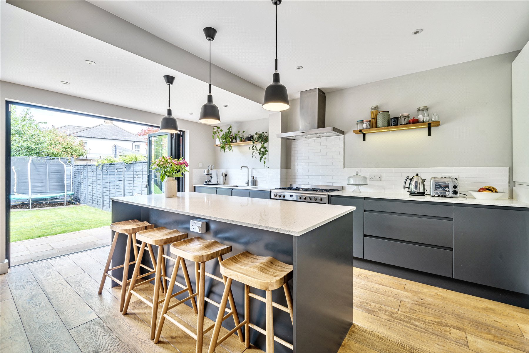 On the first floor, there are three bedrooms, two of which are great double rooms with fitted storage, a smaller single bedroom and a modern family bathroom.