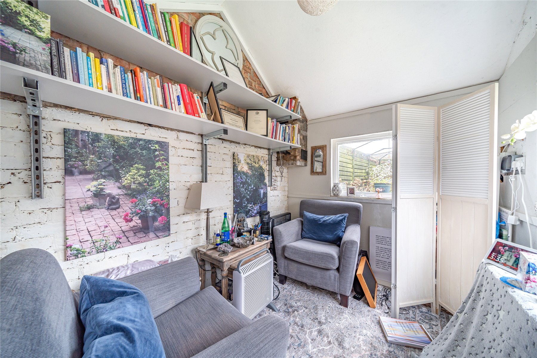 Outside, the rear garden is low maintenance and offers side access and a brick-built home office/studio.