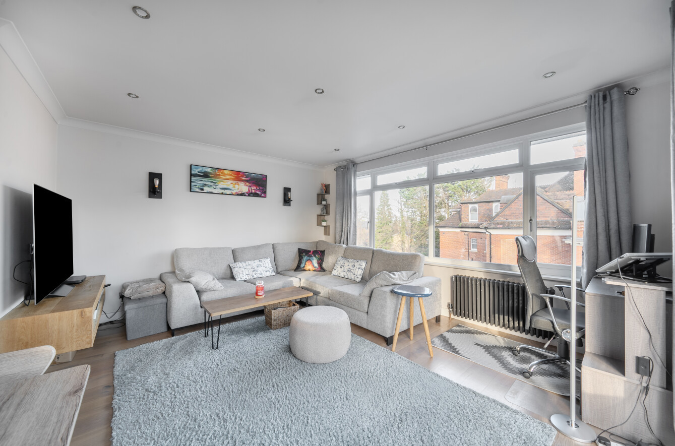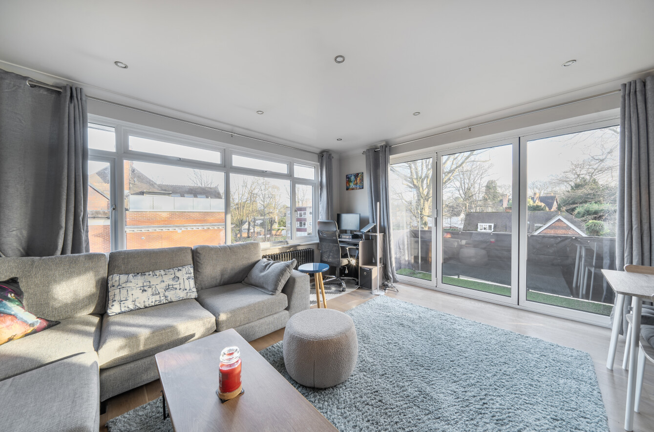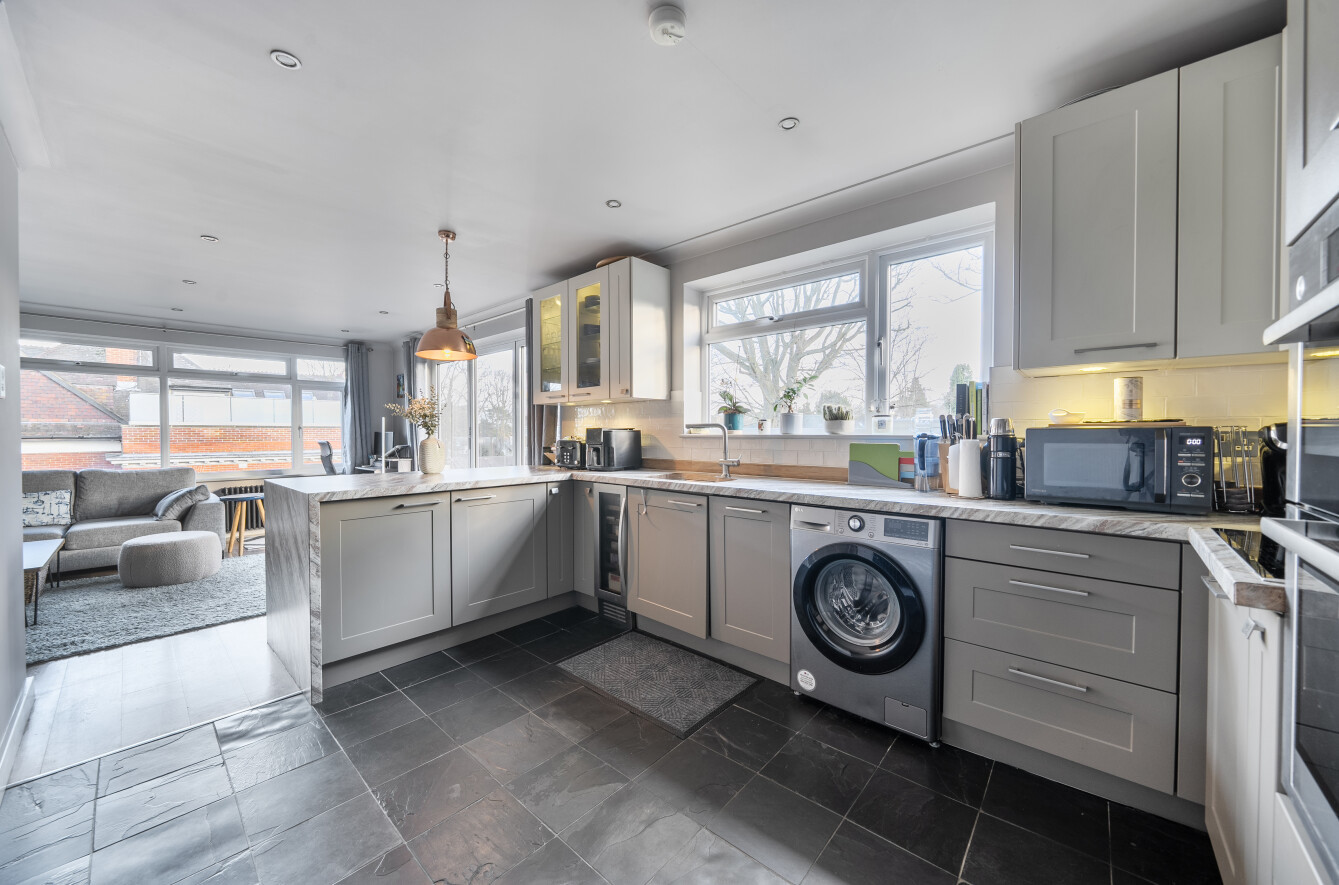 Spacious top-Floor Apartment with Private Balcony in Sought-After Location A stunning top-floor apartment, complete with its own private balcony, situated in a highly desirable location just a stones throw from Queens Road shops, cafés, and Weybridge mainline station.Upon entering, you are greeted by a beautifully designed kitchen featuring a range of fitted eye and base-level storage units, solid oak worktops, and high-quality Bosch appliances, including a built-in oven/grill, induction hob, dishwasher, and washing machine. Additional integrated appliances include a wine cooler and fridge freezer.The main living area has been thoughtfully designed as a spacious lounge and dining space with a dual aspect, bi-fold doors opening onto your private balcony, and engineered oak flooring laid throughout much of the flat.An inner hallway provides ample additional storage and leads to two generously sized double bedrooms, both with fitted wardrobes. The main tiled bathroom, located off the hallway, includes a bath with overhead shower and wash basin, alongside a separate WC.Externally, the development is surrounded by well-maintained grounds, and the apartment benefits from an allocated parking space. Immaculately presented and finished to a high standard throughout, this apartment is certainly worthy of a closer inspection.