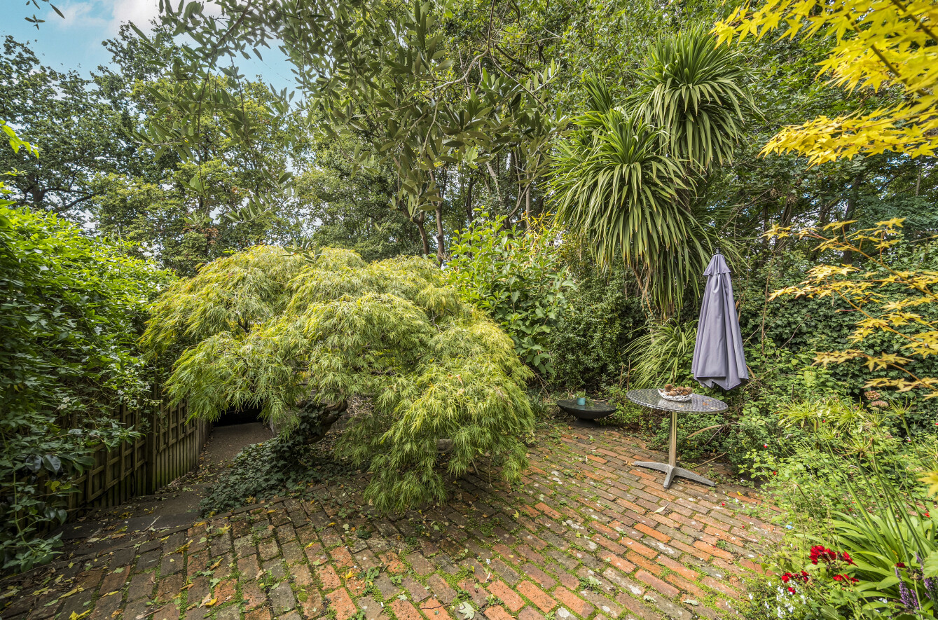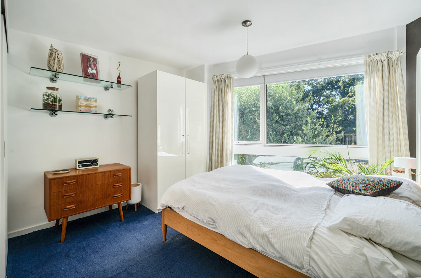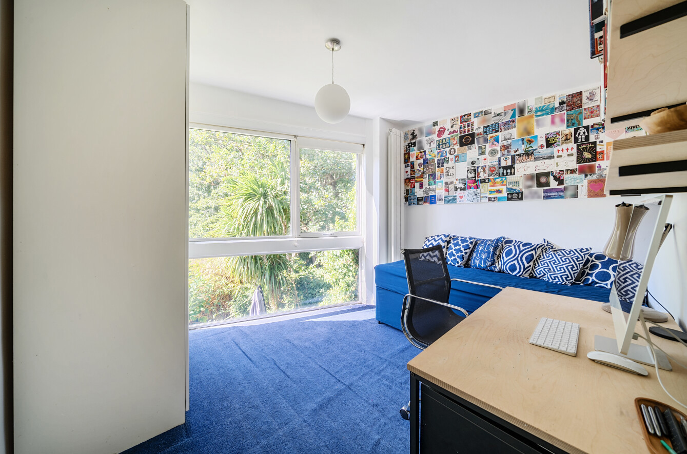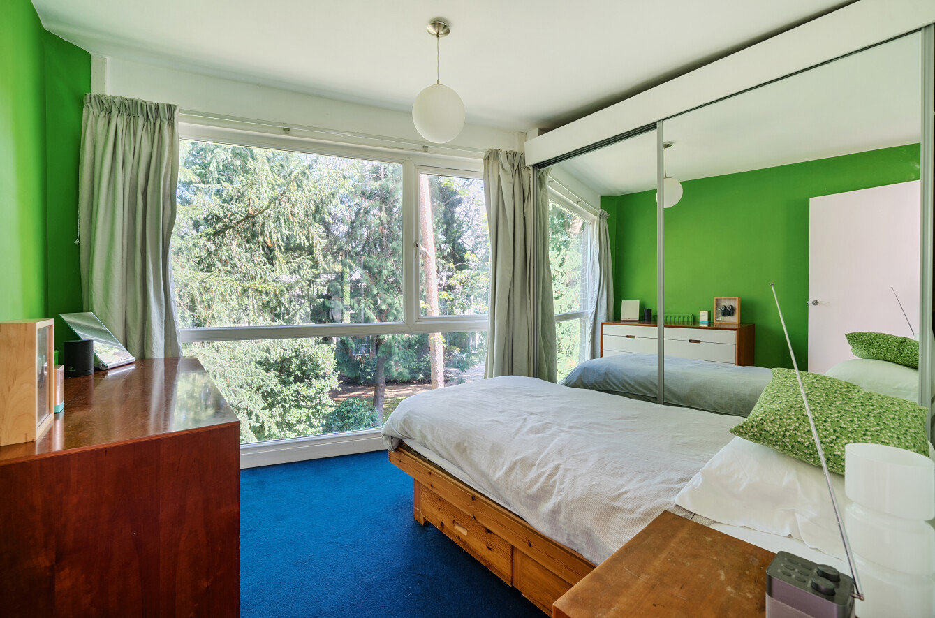 The main reception room offers expansive views over the well-maintained communal grounds and surrounding woodland, while the dining room and study benefit from nearly full-height glazed doors opening onto the private garden, creating a seamless indoor-outdoor connection. The sleek, modern kitchen also enjoys direct garden access, and a guest WC completes the ground floor.