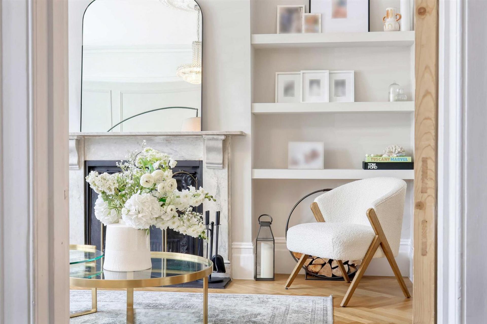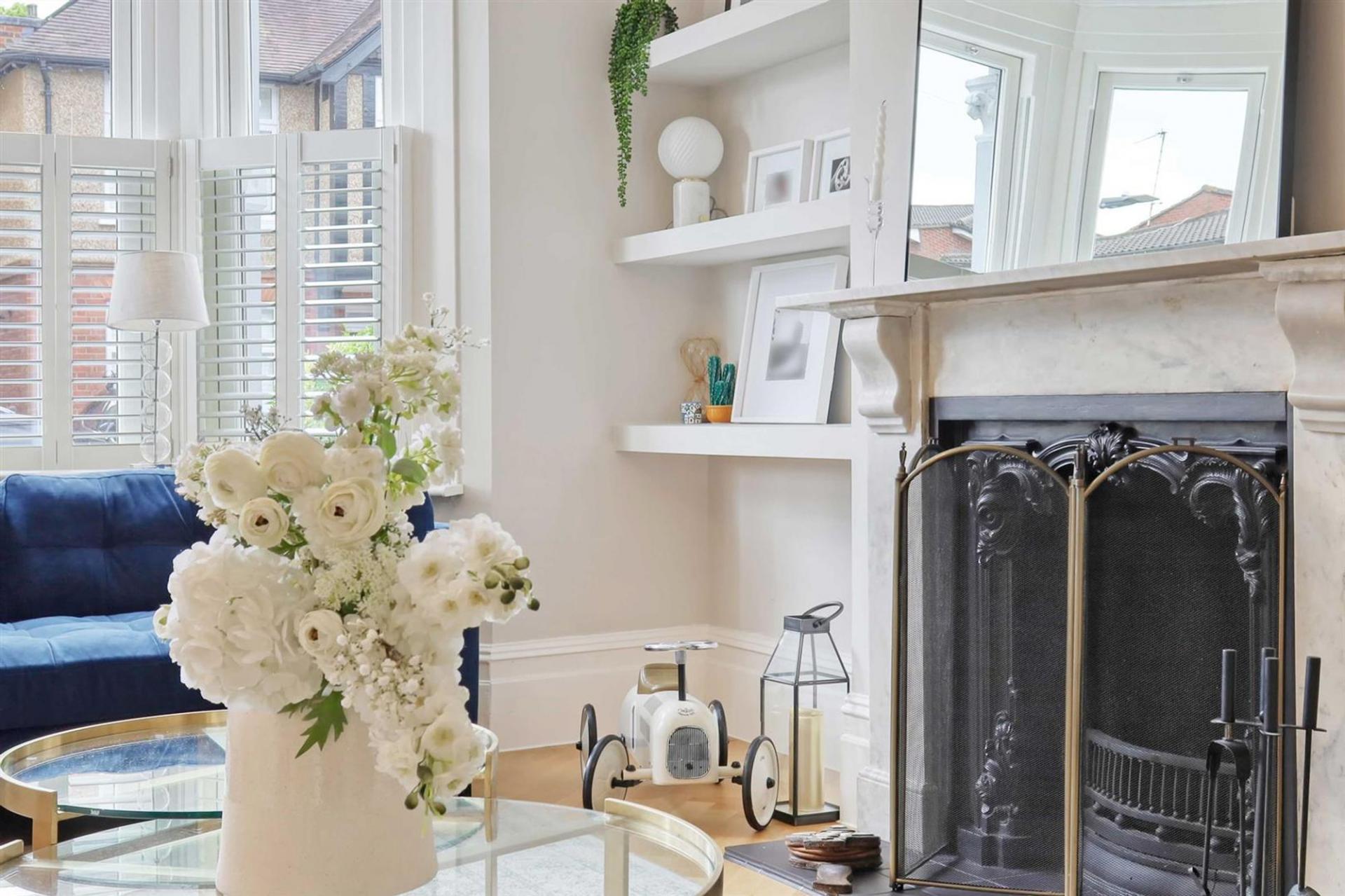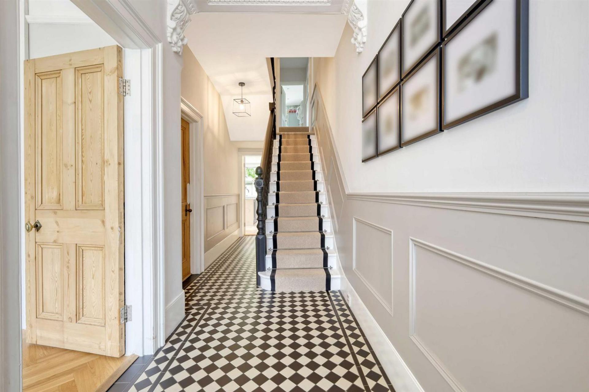 An elegant entrance hall with classic flooring leads to a spacious living room, bathed in natural light from its large bay window, and featuring a charming fireplace as a focal point. The high ceilings, detailed cornices, and ceiling roses are beautifully complemented by contemporary fittings, creating a perfect blend of originality and modernity.