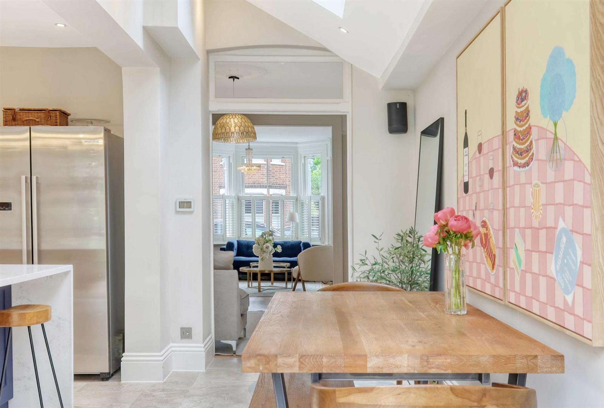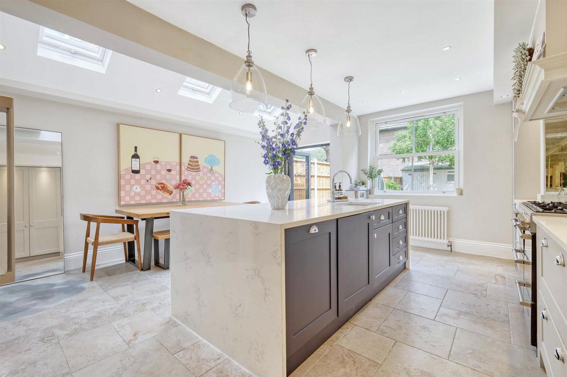 The heart of the home lies in the expansive kitchen/dining/family room, which extends towards the rear garden. This area, featuring modern appliances and a large central island, is designed for family living and entertaining, with bi-fold doors opening to a well-maintained garden. The tasteful decor, with a mix of neutral tones and vibrant accents, adds to the home's welcoming atmosphere, with a part-vaulted ceiling and rooflight windows adding height and natural light.