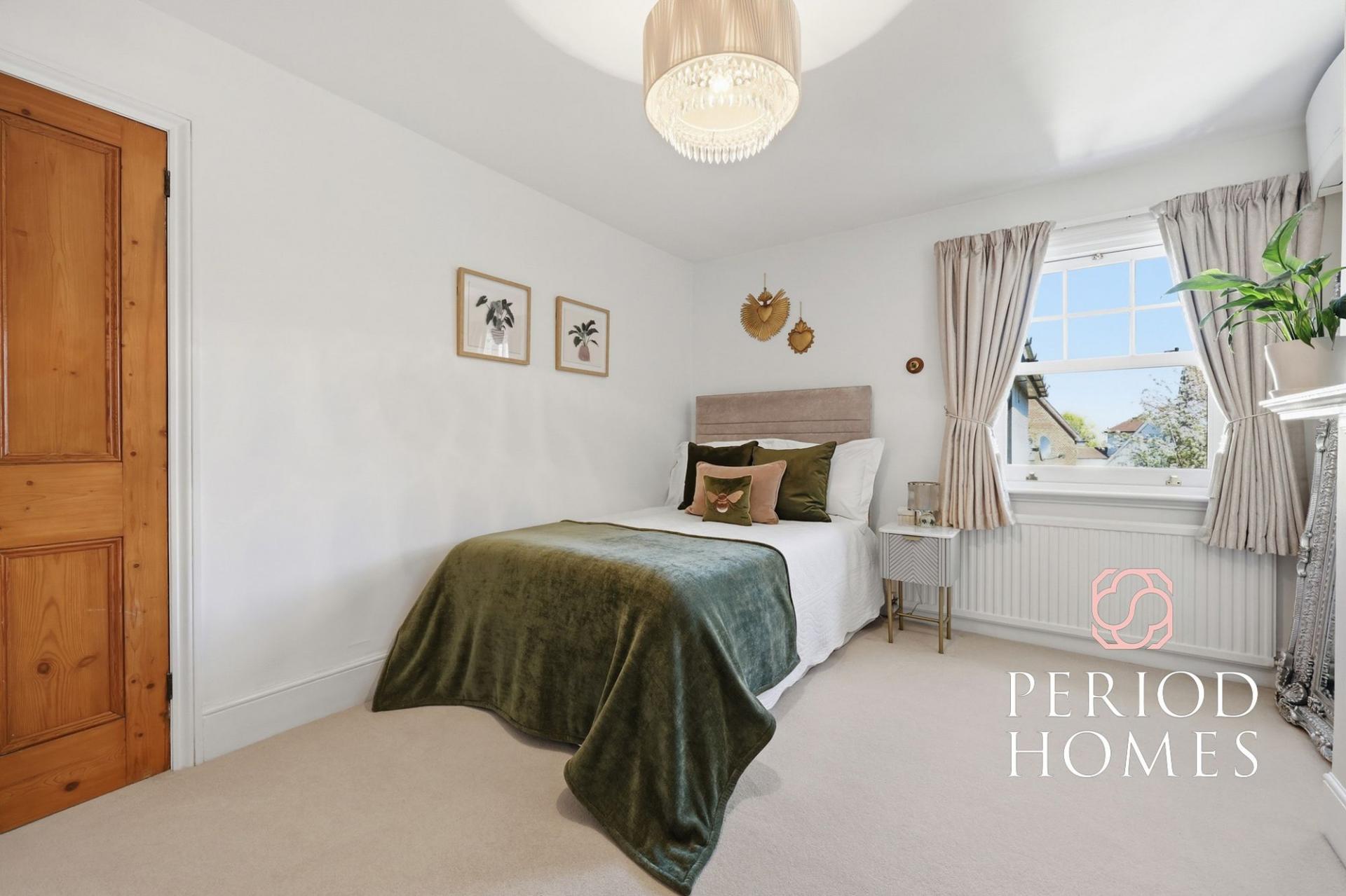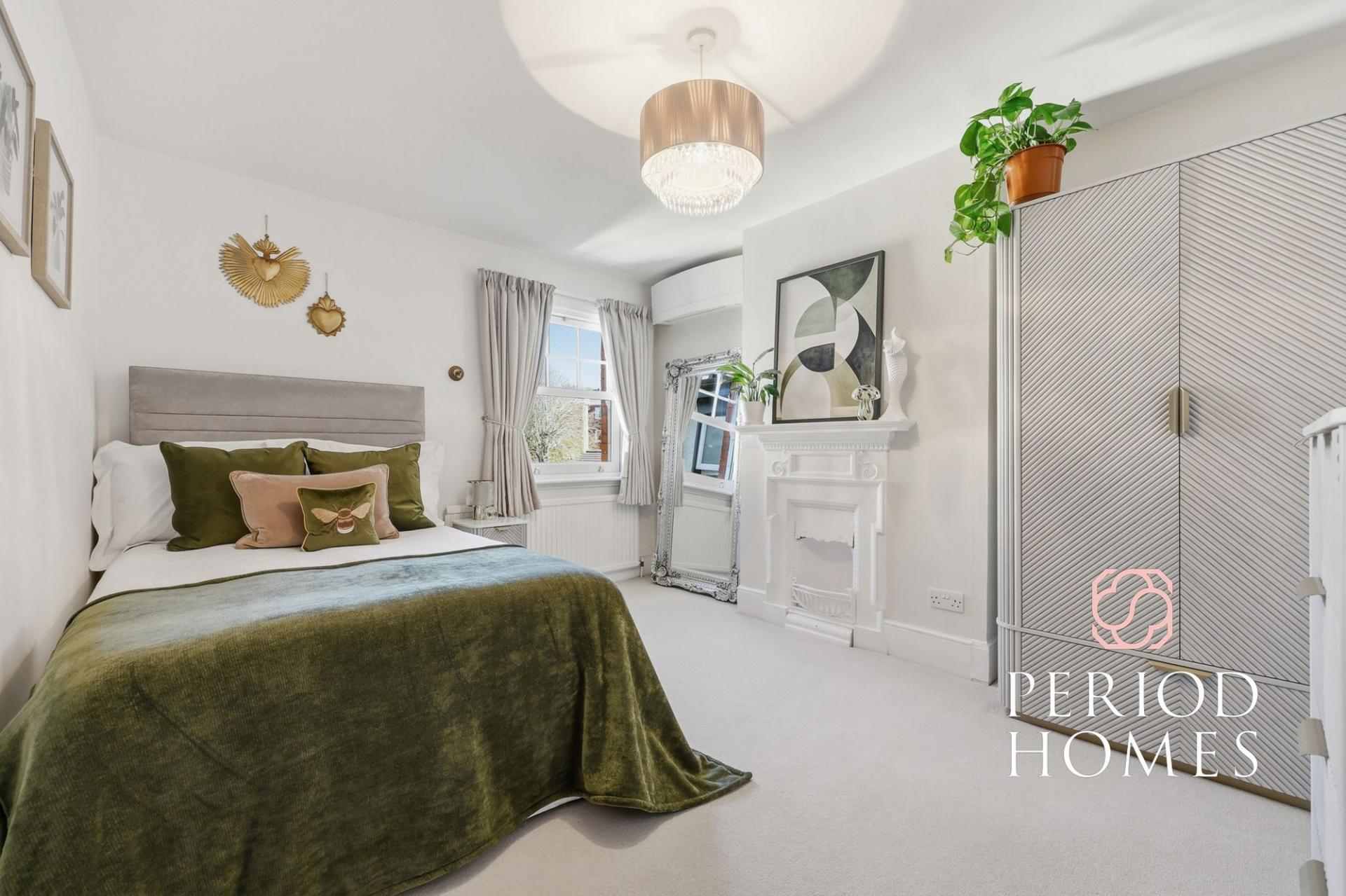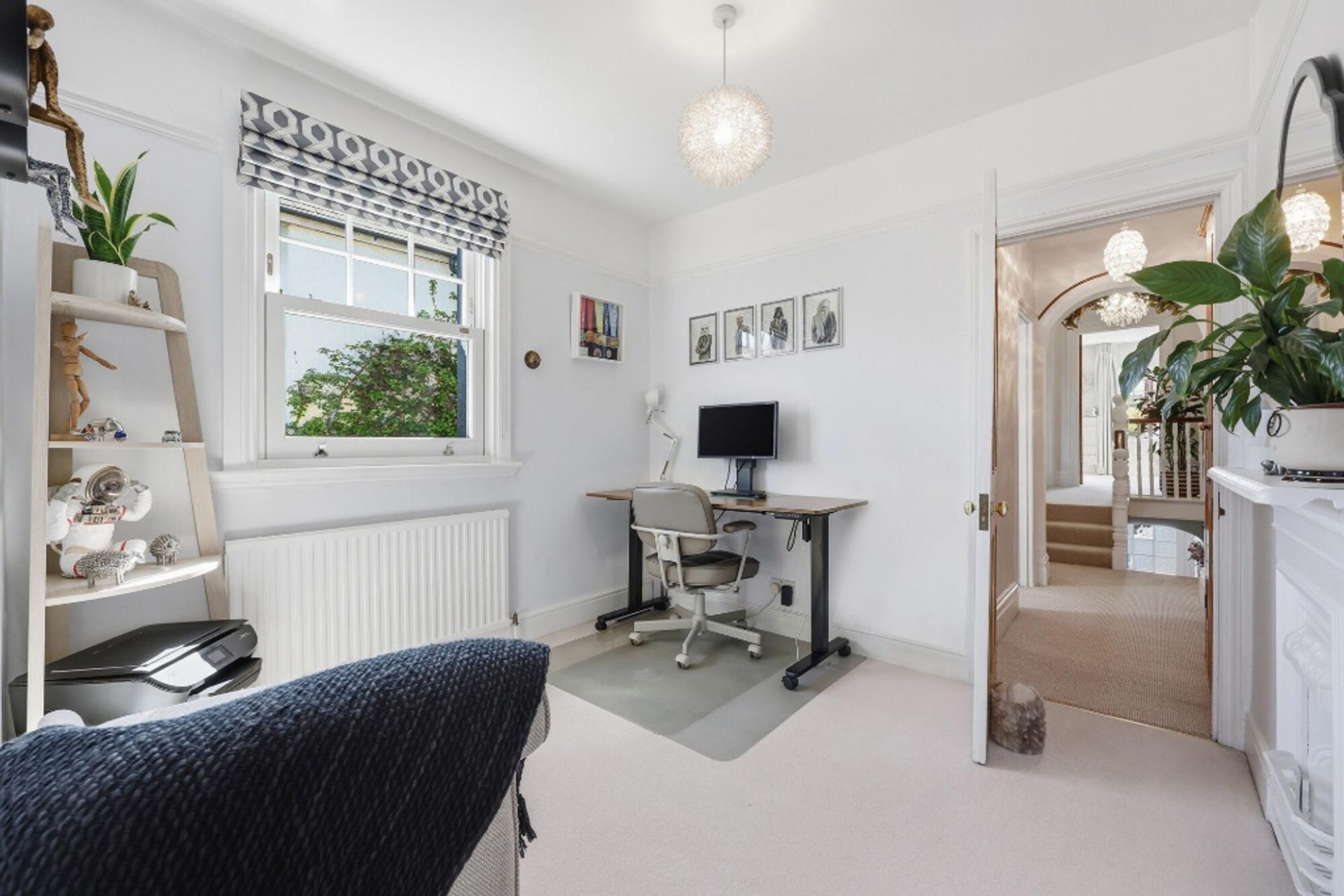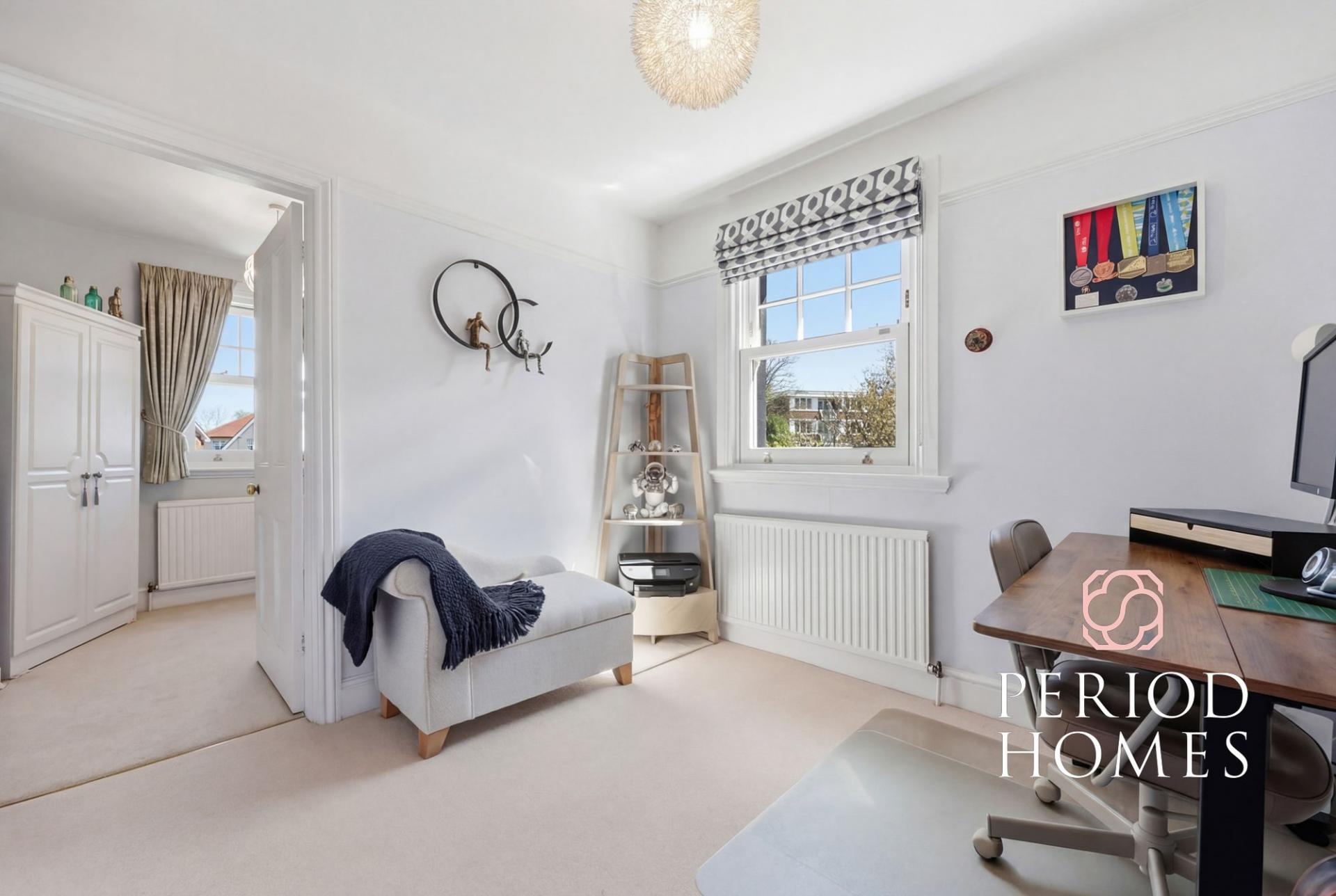 Upstairs, the first floor provides well balanced bedroom space. The principal bedroom is positioned to the front of the property and is a particularly generous double, featuring dual windows and an original style fireplace. A further double bedroom sits alongside, while two additional rooms are located to the rear, one of which is currently used as a home office. A modern family bathroom completes the first floor.
