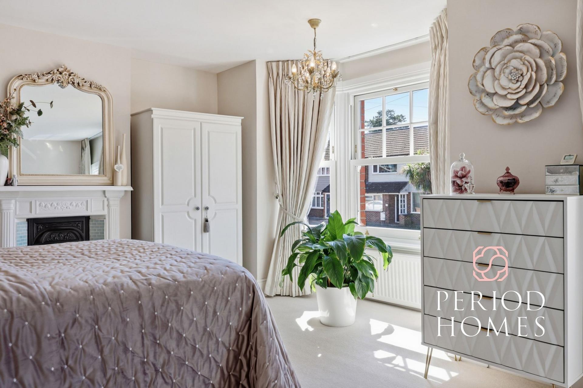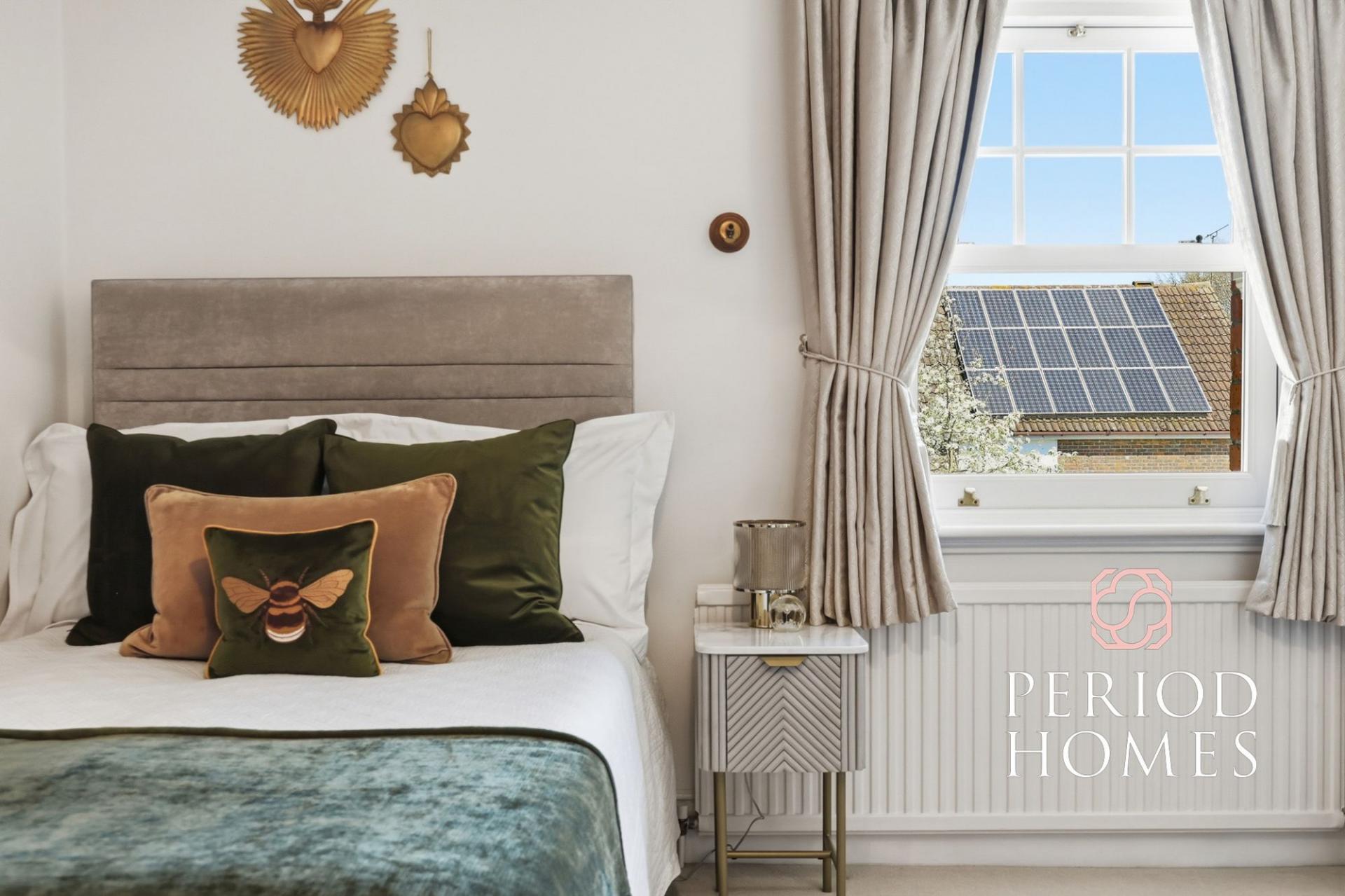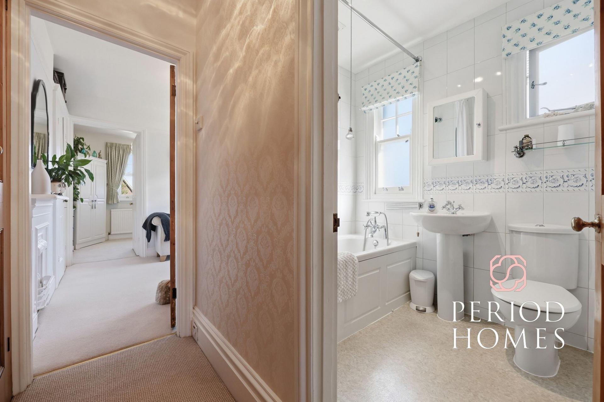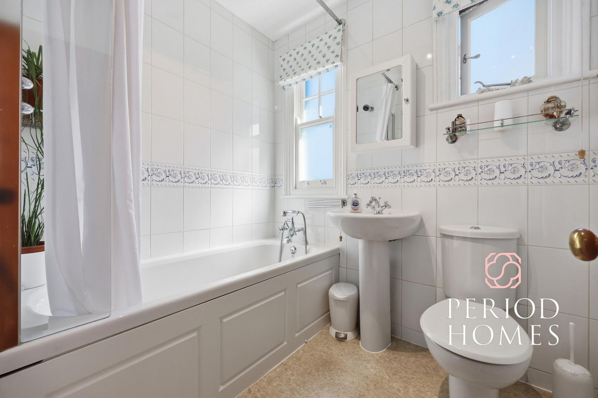 Upstairs, the first floor provides well balanced bedroom space. The principal bedroom is positioned to the front of the property and is a particularly generous double, featuring dual windows and an original style fireplace. A further double bedroom sits alongside, while two additional rooms are located to the rear, one of which is currently used as a home office. A modern family bathroom completes the first floor.