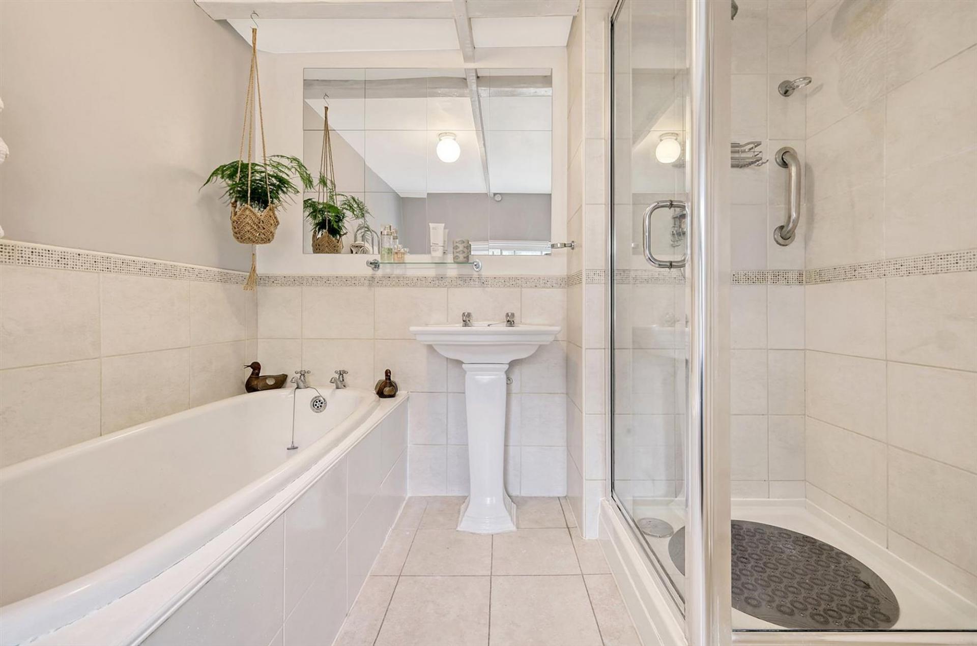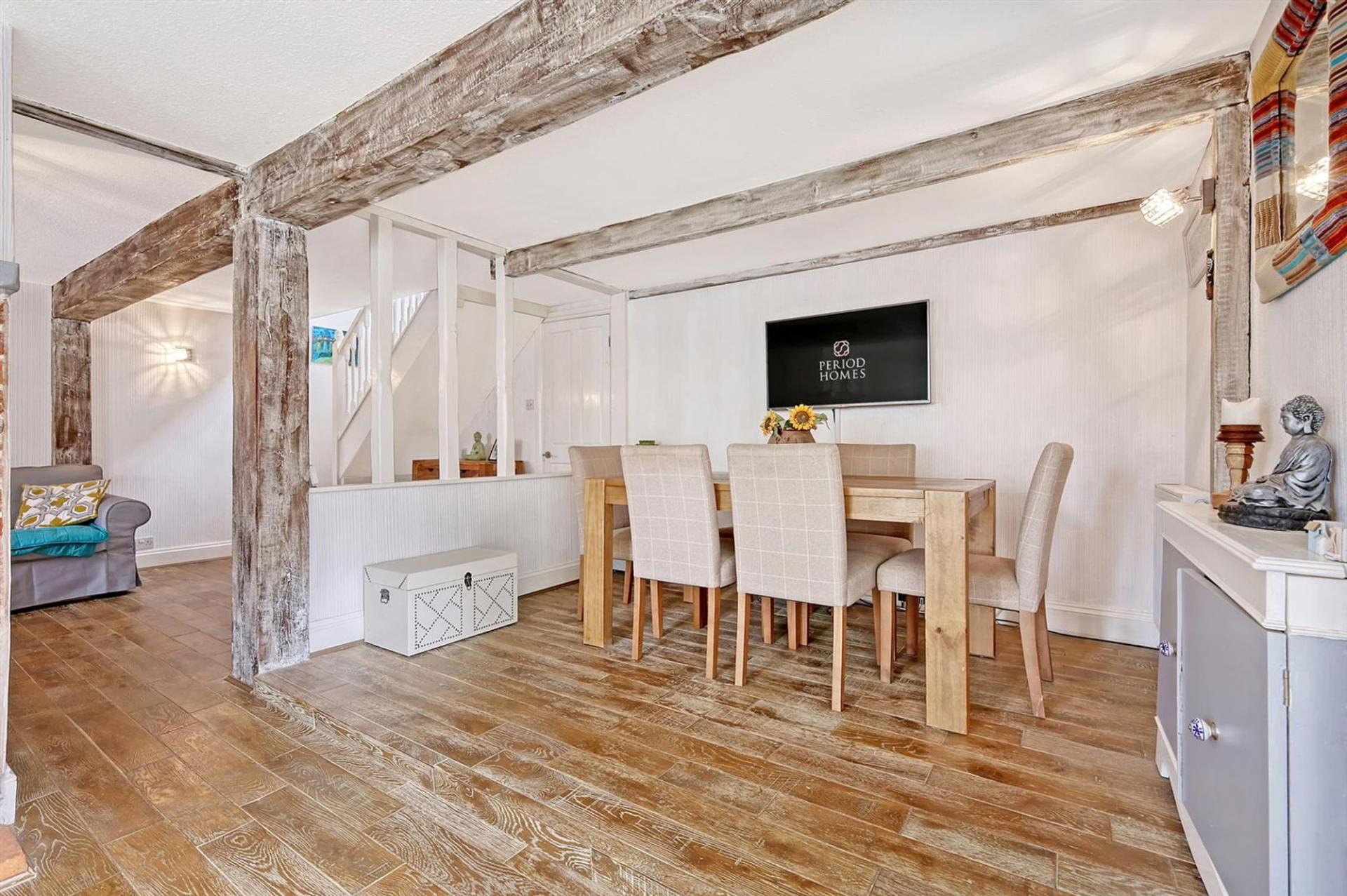 Upon entering through a quaint gated shingle front garden, you are welcomed into the inviting lounge with exposed beams and a feature log burner, creating a warm and cosy atmosphere. The ground floor boasts two reception rooms, ideal for relaxing or entertaining. Towards the rear, the extended kitchen features a stable door that opens onto the south-facing garden. A convenient downstairs shower room and WC complete the ground floor. Upstairs, you’ll find two double bedrooms and a generous family bathroom which is well-appointed, providing a relaxing space with both a bath and shower.