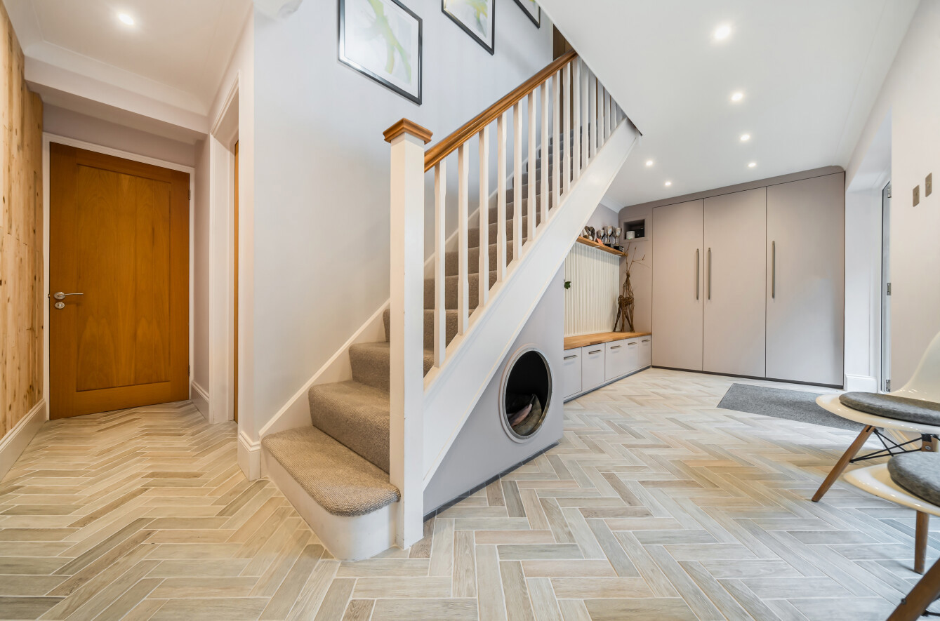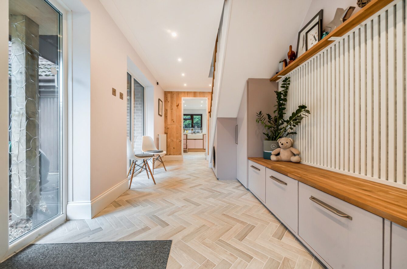 A glazed front door flanked by glazed side panels opens into a spacious and welcoming entrance hall with plenty of space for a busy family or to welcome guests, with a long bench seat the perfect spot to take off shoes and boots, and tuck away in the storage beneath. A substantial coats cupboard sits to one end. Tiled herringbone flooring extends into a newly refurbished WC and the kitchen.