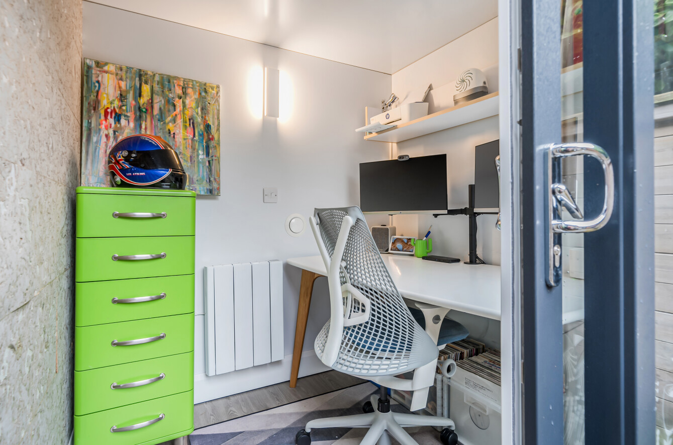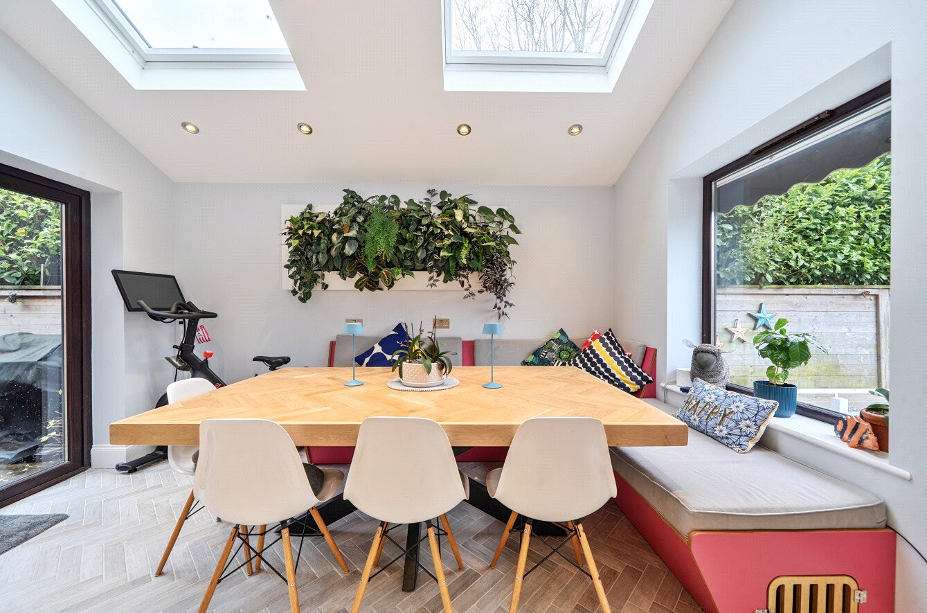 doors onto the back garden and a clever corner bench seat has been created in the dining area offering generous seating with storage below. Patio doors from the dining area open onto a tucked away and discreet courtyard, the perfect spot for a bbq, whilst also leading to the utility room and a fully insulated home office with heating and internet connection.