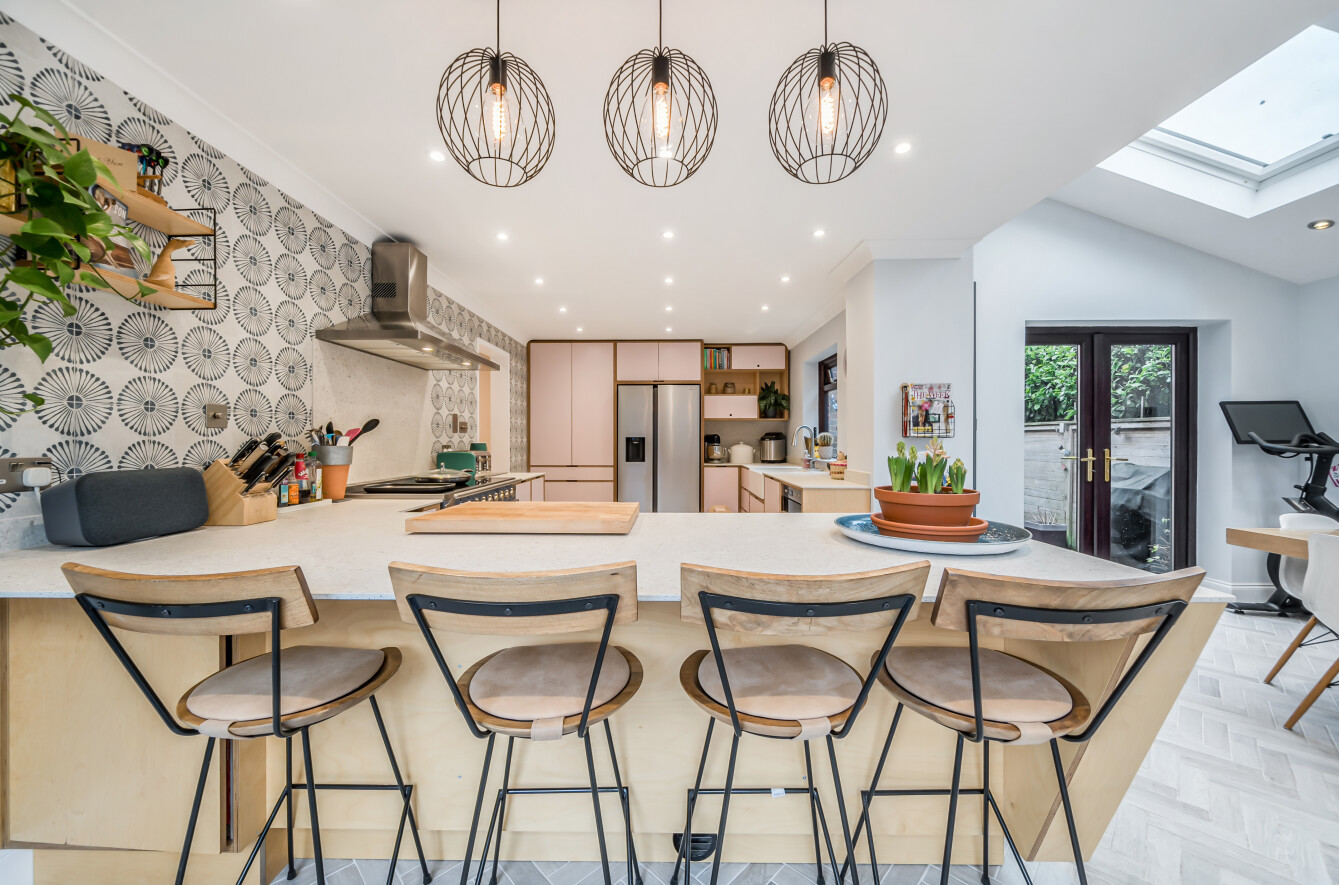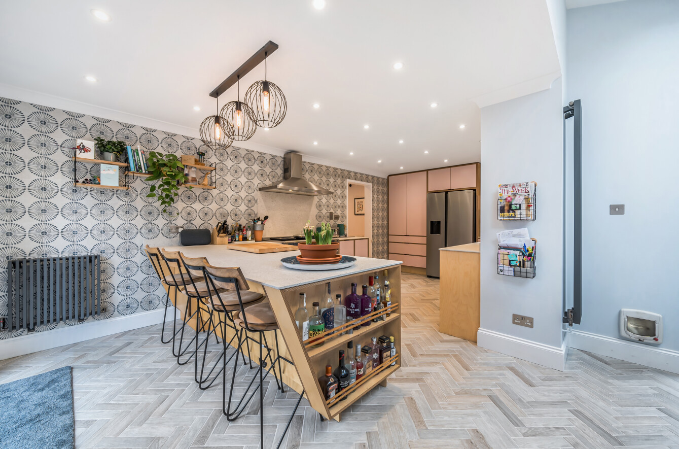 The kitchen has been opened up, extended and modernised to create a super open plan kitchen/dining room enjoying a triple aspect with the added benefit of patio doors to front and back and part vaulted ceiling with velux windows. The kitchen transformation has been a labour of love with bespoke hand made units, porcelain worktops and splashback, Rangemaster oven and hood, under plinth built in vacuum system, double butlers sink and integrated microwave and dishwasher.