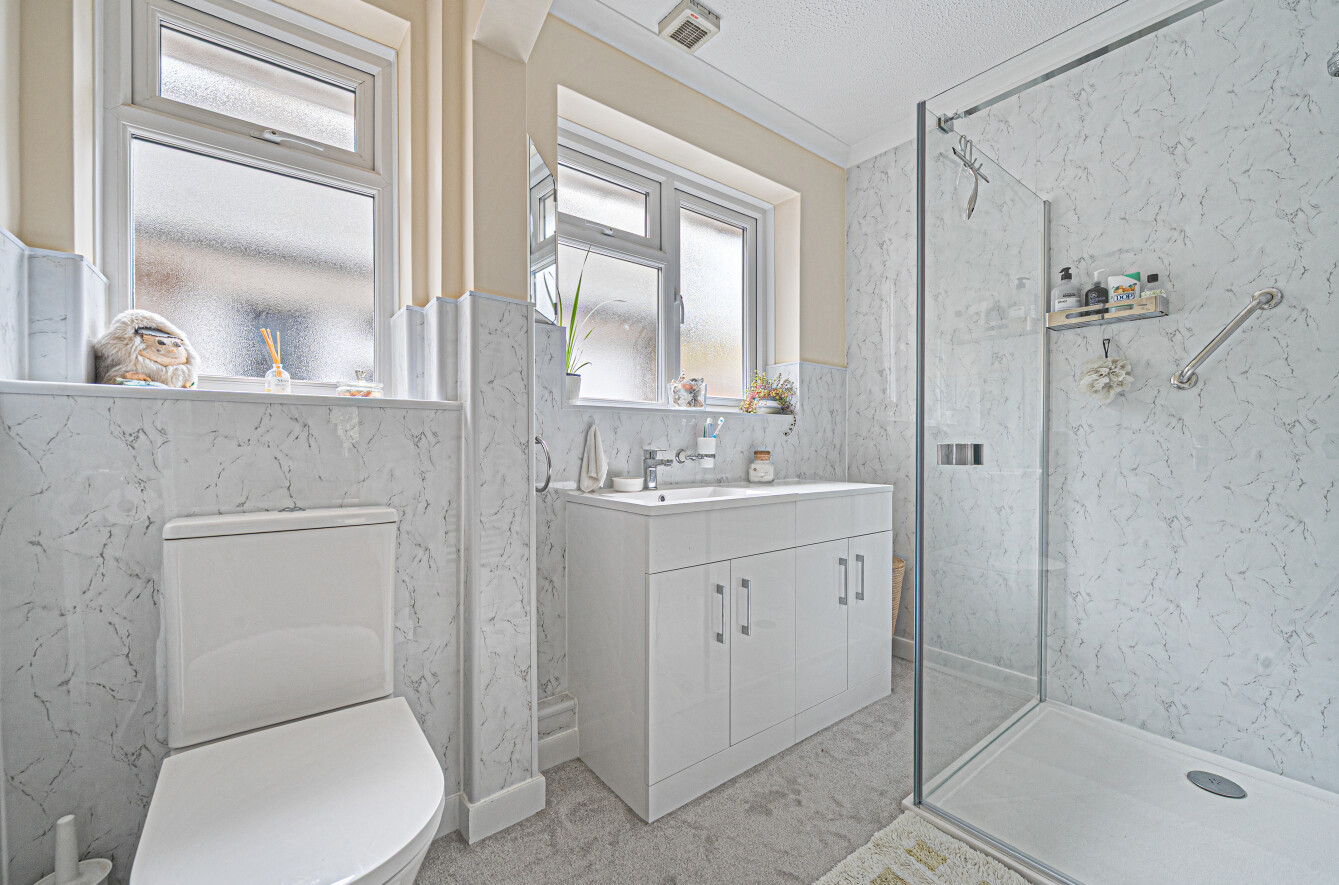 The bedrooms space sits to the left hand side of the bungalow. There are two double bedrooms with fitted wardrobes; one additionally benefitting from a built in corner sink/vanity unit. The third bedroom has a built in wardrobe but is currently used as a study. Completing the accommodation is a recently upgraded family shower room with large walk in shower cubicle and sink with large vanity storage cupboards below.
