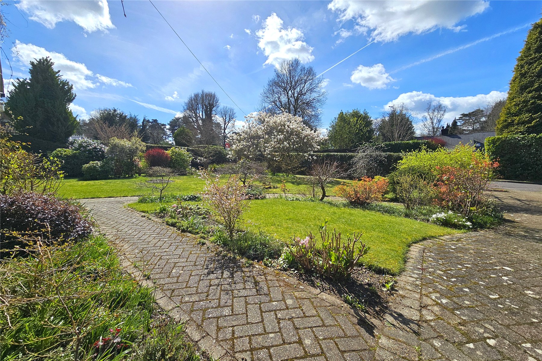 Gated front garden offering a very attractive sunny, level approach to the house, mainly laid to lawn with mature plants and shrubs plus hedging, providing both a natural boundary and high degree of privacy. Running up the side of the plot is a herringbone block paved driveway offering parking for several cars leading up to a spacious garage with up and over electric door and a store to the rear.