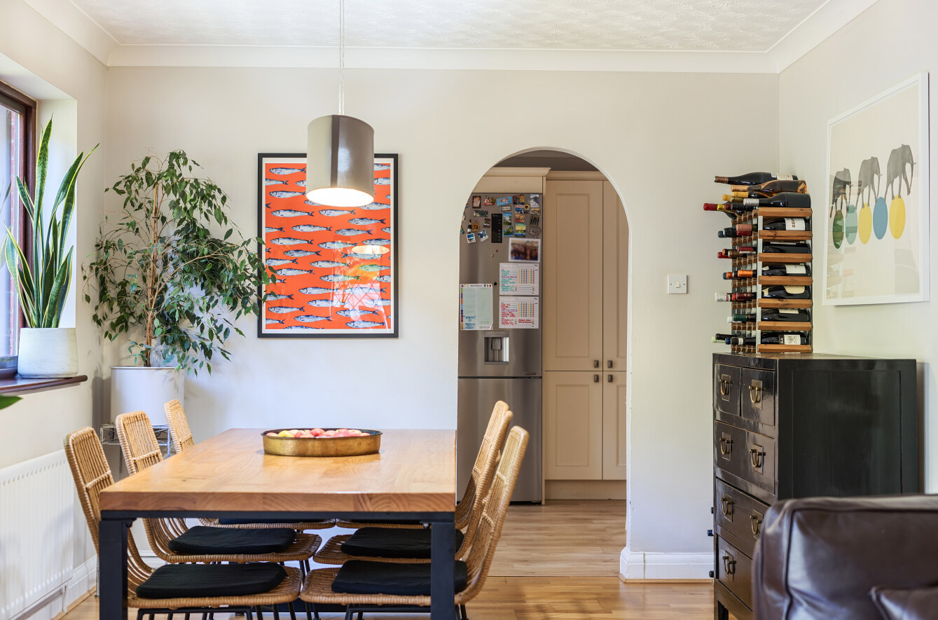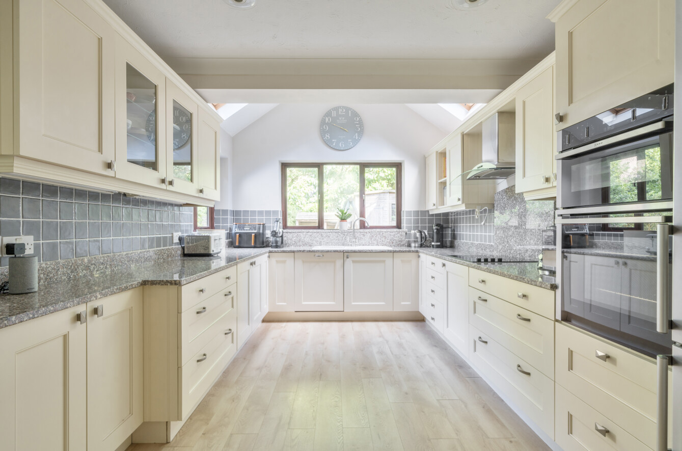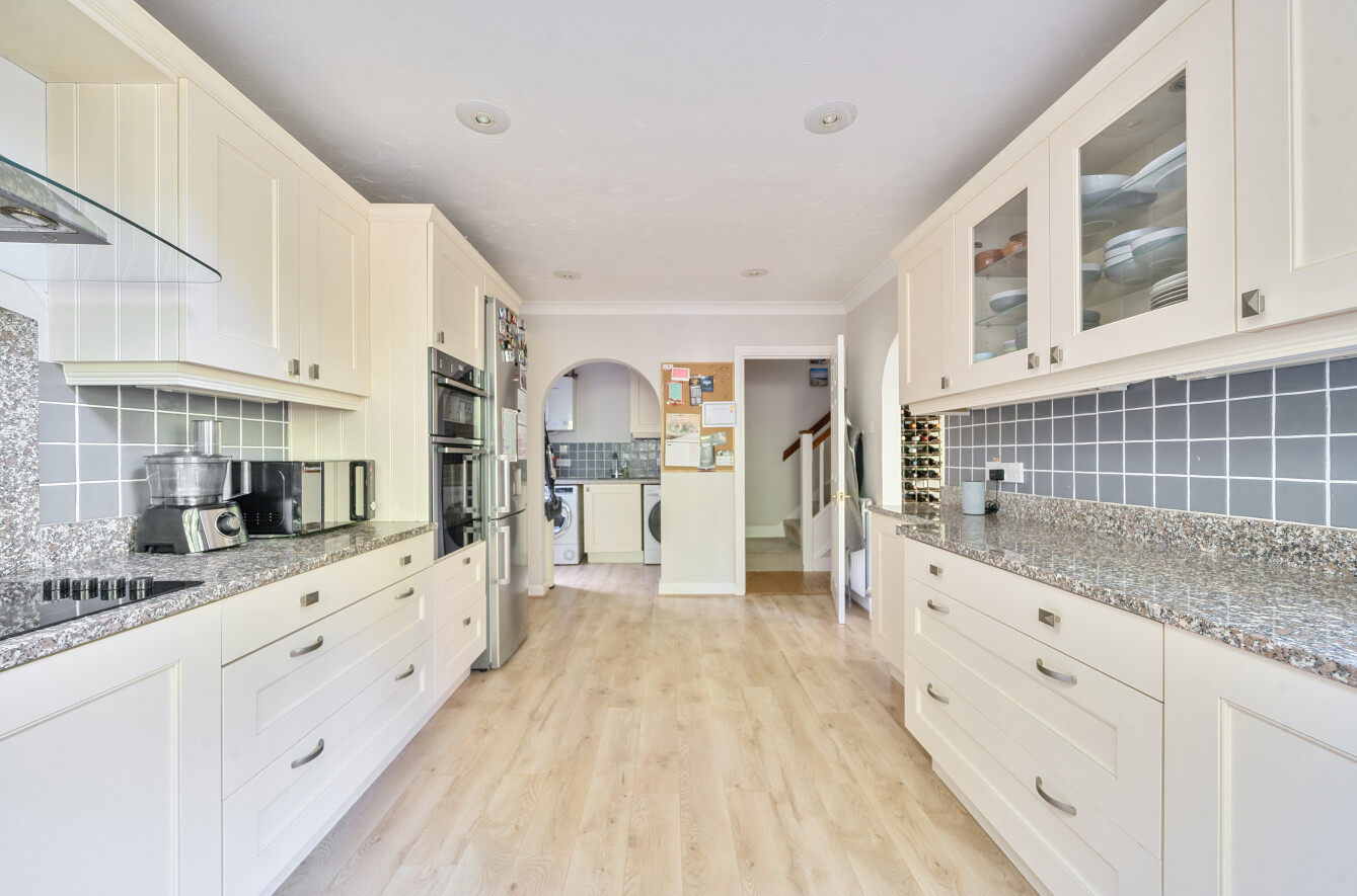 The extended kitchen is dual aspect and has a charming vaulted ceiling to the end allowing plenty of natural light in. There is plenty of work top and drawer/cupboard storage in addition to integrated electric hob, double oven and dishwasher. An arch leads through to a utility room with space for further white goods.