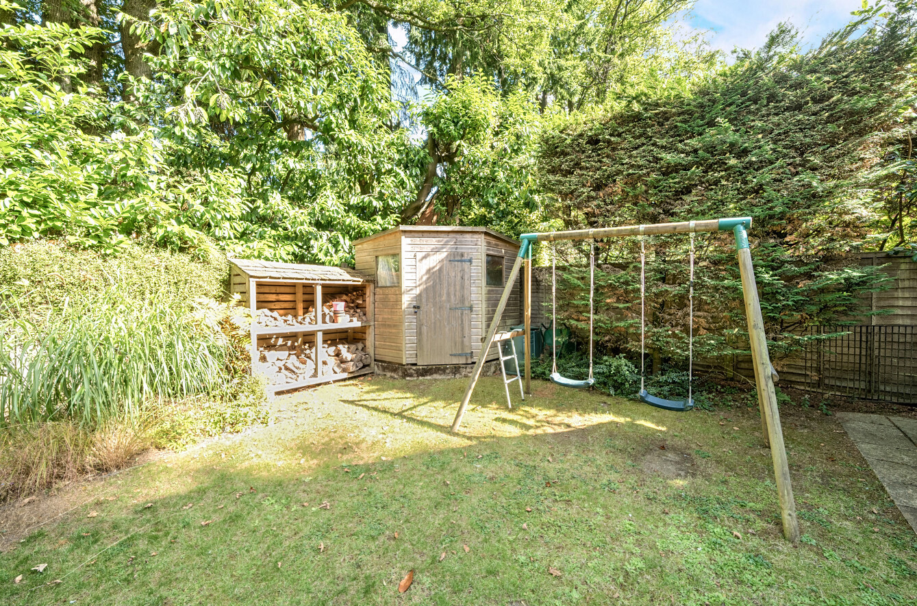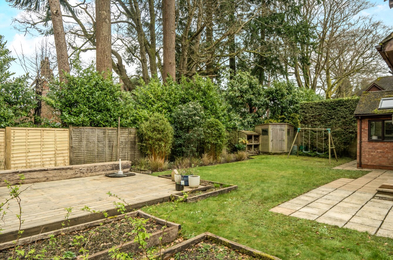 Level enclosed gardens which are predominantly laid to lawn with a paved patio area wrapping around the sitting room and dining room and a further decked terrace to one corner (with built in corner bench seating) offering a variety of areas in which to dine or entertain. There are a couple of raised vegetable beds for the working gardener, complemented by a garden shed and adjacent wood store.