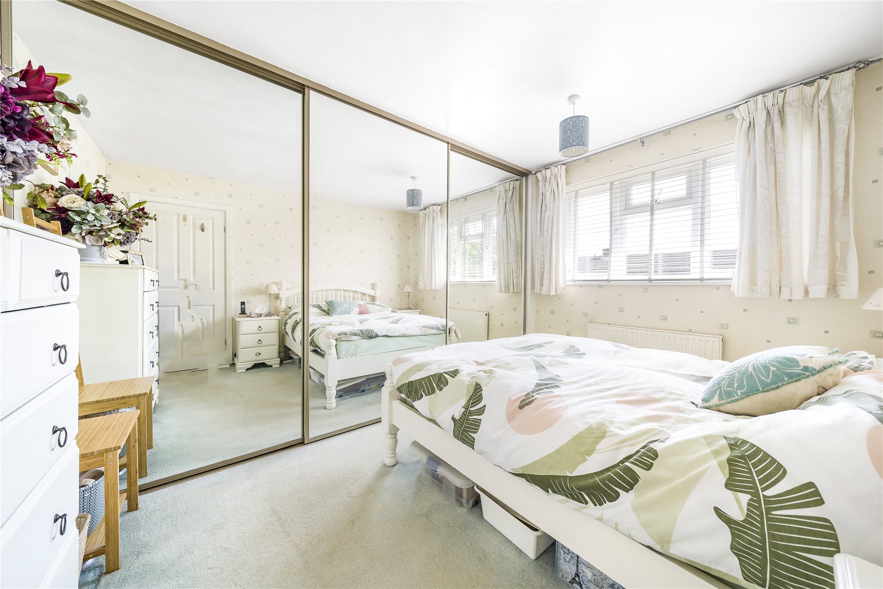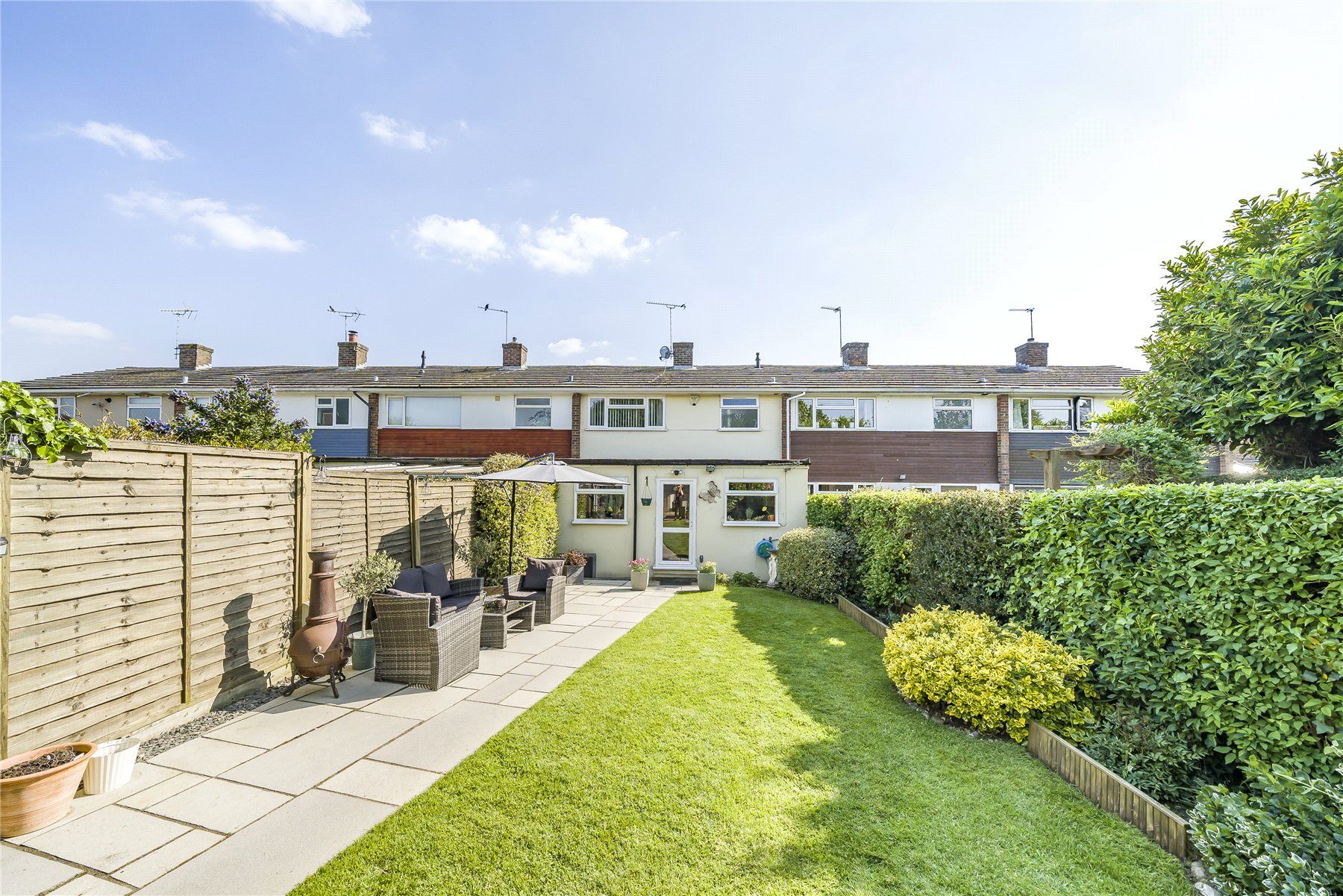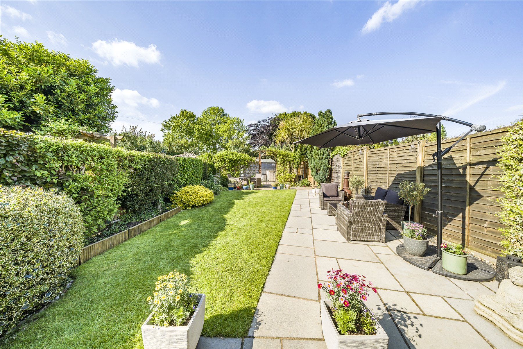 Outside, the front overlooks a pretty green, while the rear garden is beautifully kept and approximately 70' in length, with three power sockets, spacious lawn areas and a large patio.