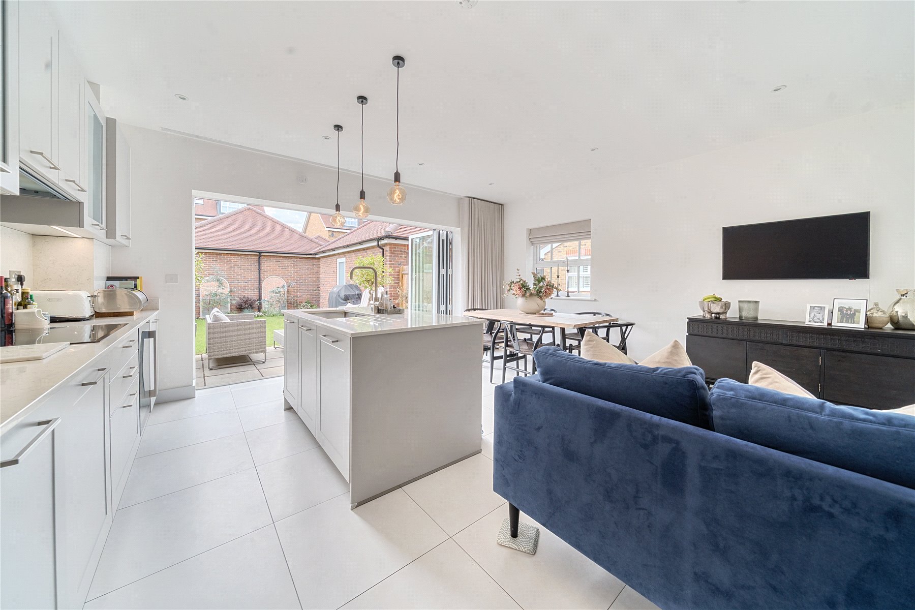 The ground floor comprises a well-appointed front aspect lounge with Amtico flooring, downstairs WC with space for utilities, and a beautiful kitchen/diner with bi-fold doors, island and porcelain floor tiles.