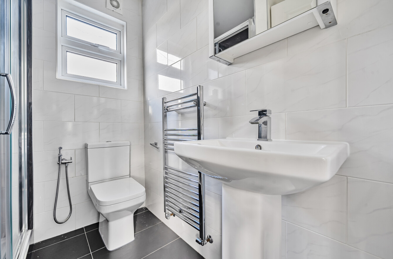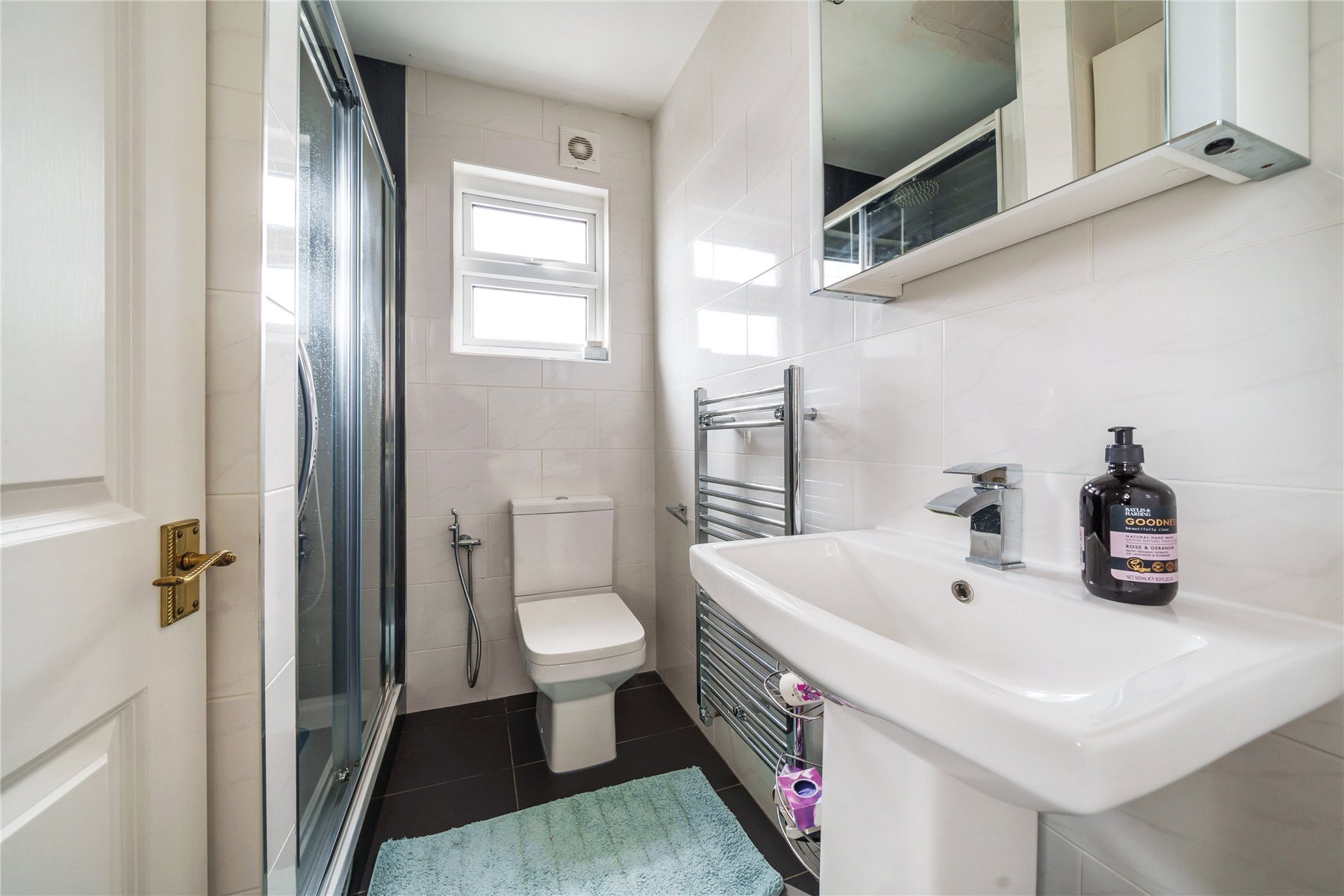 On the upper level, there are two bedrooms to the front of the house, one with a bay window and built-in storage, the other with two windows and built-in storage cupboard. There are two further bedrooms to the rear, one approximately 18ft in length with built-in storage cupboards and an ensuite shower room. The fourth bedroom also has built-in storage. The luxury ensuite shower room has a double shower cubicle, WC, wash hand basin and heated towel rail. The luxury family bathroom has decorative teal tiles as a feature wall over the bath, with a white three-piece suite including a whirlpool bath and a heated towel rail.