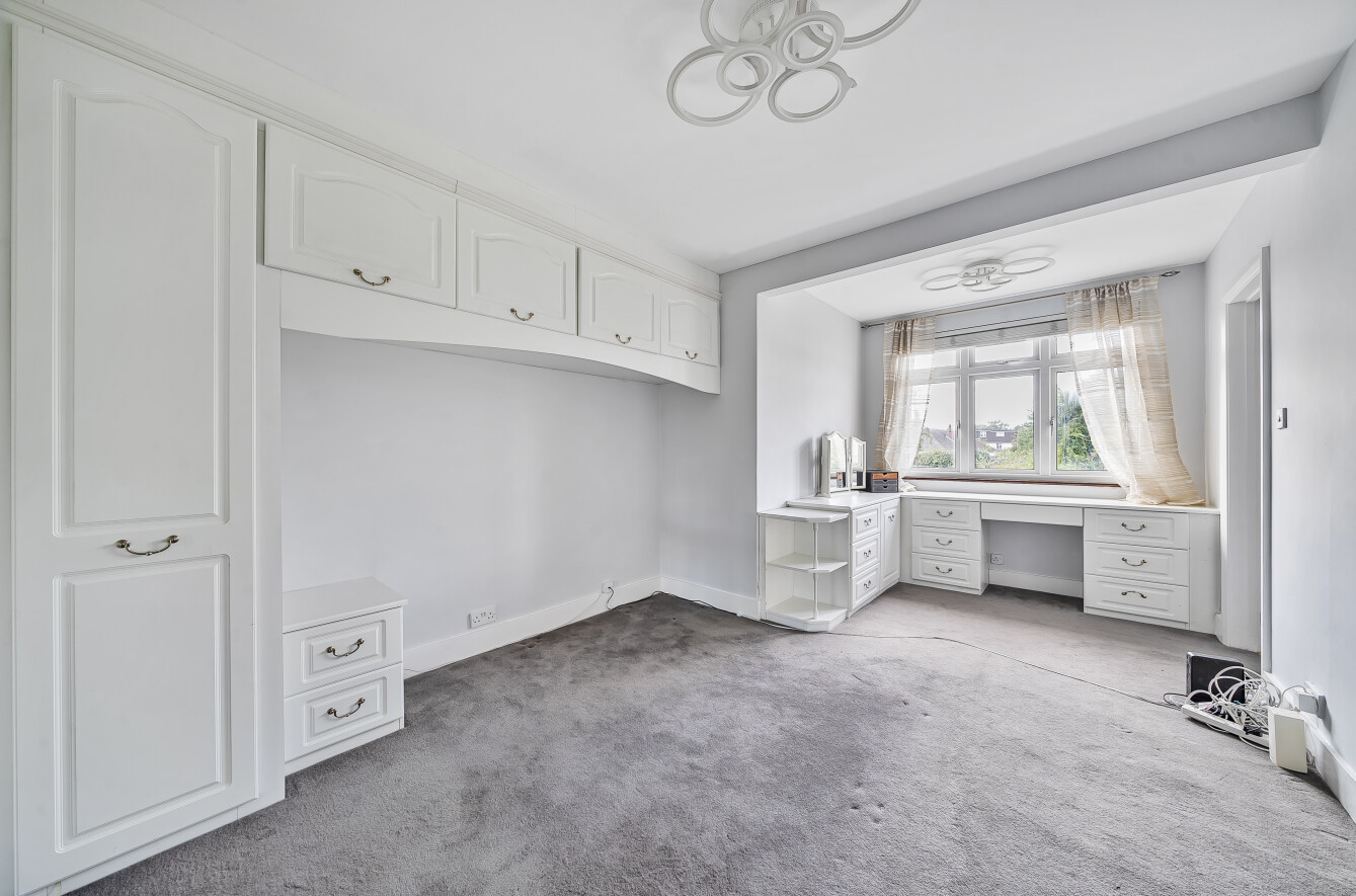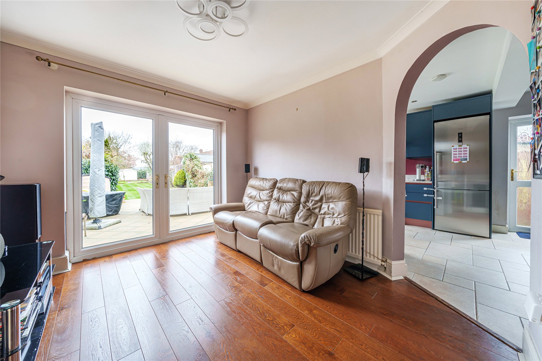 The living room is approximately 23ft in length with bay windows, an open fireplace and double doors into the family room. The family room is situated to the rear of the property, with double doors to the garden and an archway into the kitchen. The kitchen is sizeable, modern and re-fitted with a good range of low-level and wall-mounted units conveniently configured for ease, including a fold-away breakfast bar and a range gas hob, electric oven and space for fridge freezer, washing machine and dishwasher. The garage is approximately 20ft in length, with rear access to the garden.