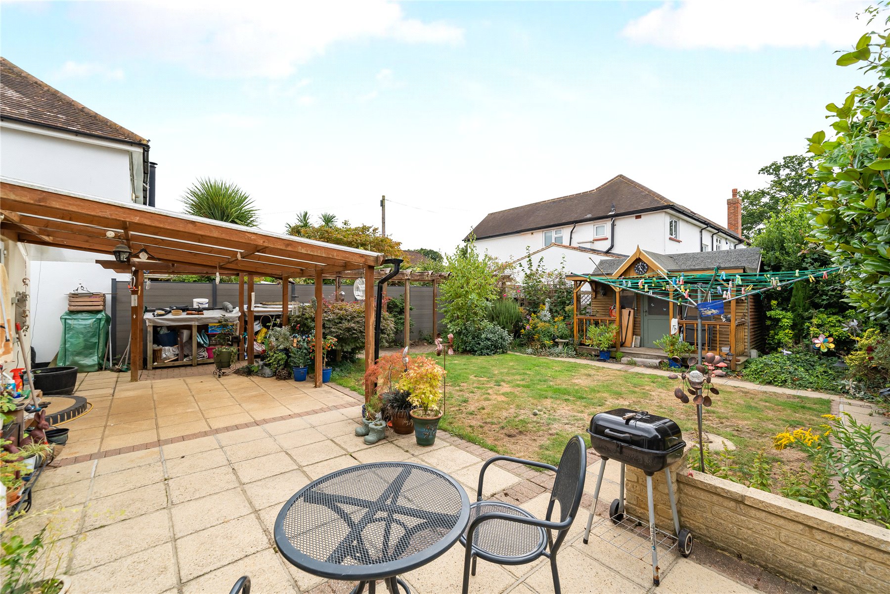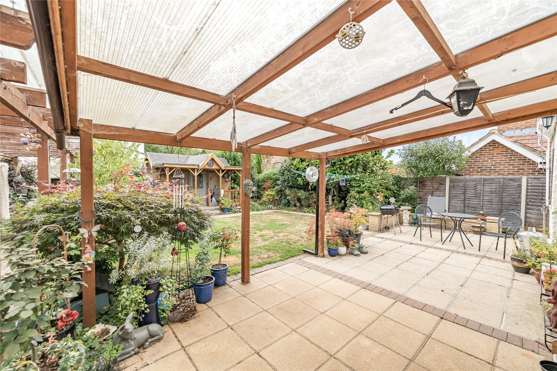 Outside, the rear garden is a decent size, with a large patio area, lawn space and various plants and shrubs, as well as a summer house.