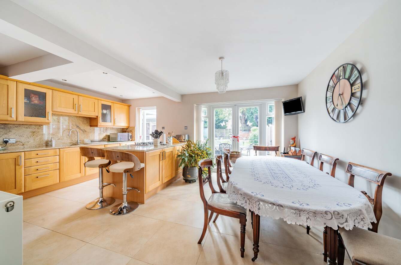 The ground floor cloakroom has been fitted with a modern suite and the spacious lounge/dining room features a lovely bay fronted window and flows through to the kitchen/dining/family room via a set of glass panel double doors. The rear aspect fitted kitchen/breakfast/family room has been fully fitted with a range of eye and base level units with integrated appliances including NEFF double ovens and all finished with high quality stone work tops while opening to the patio and garden.