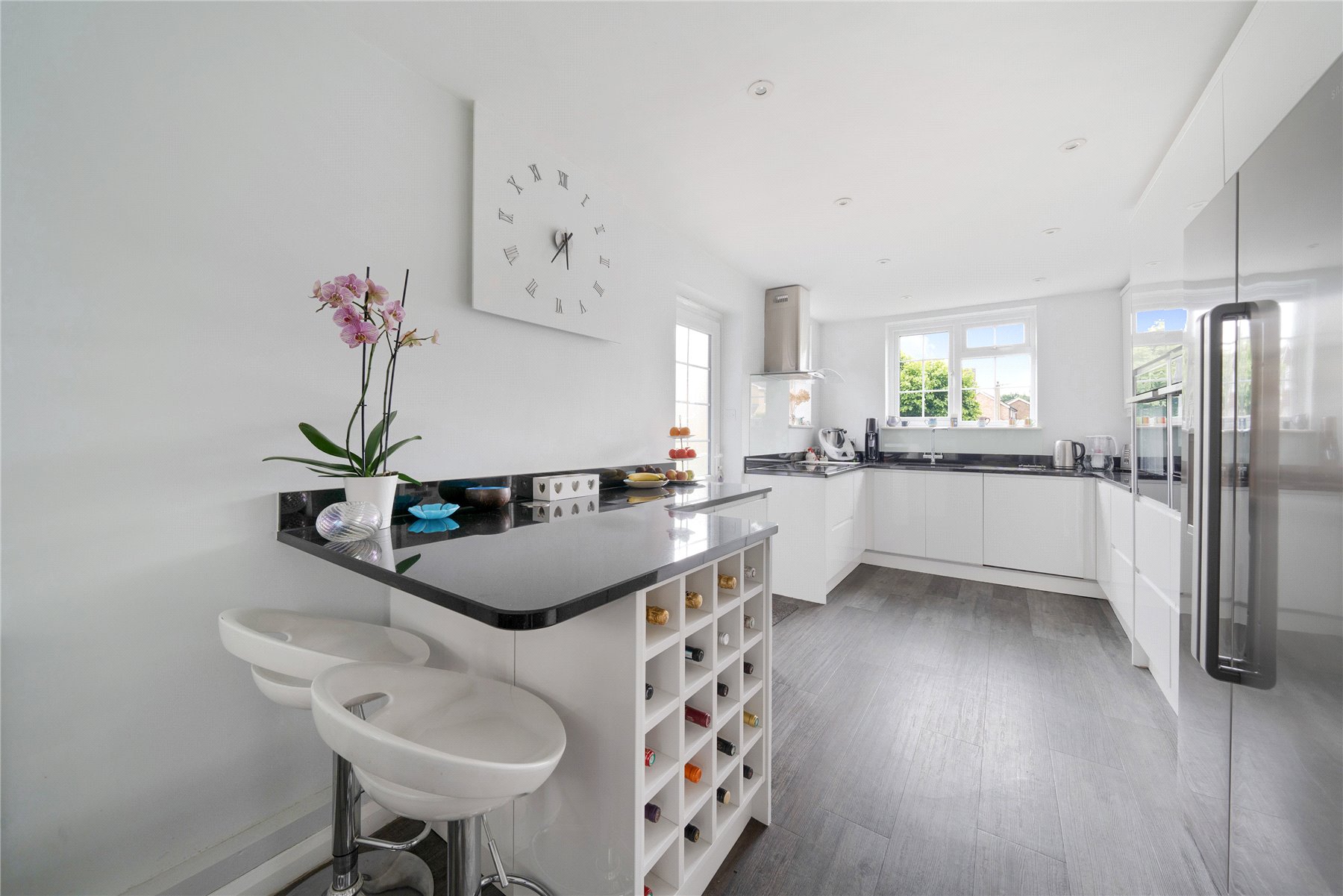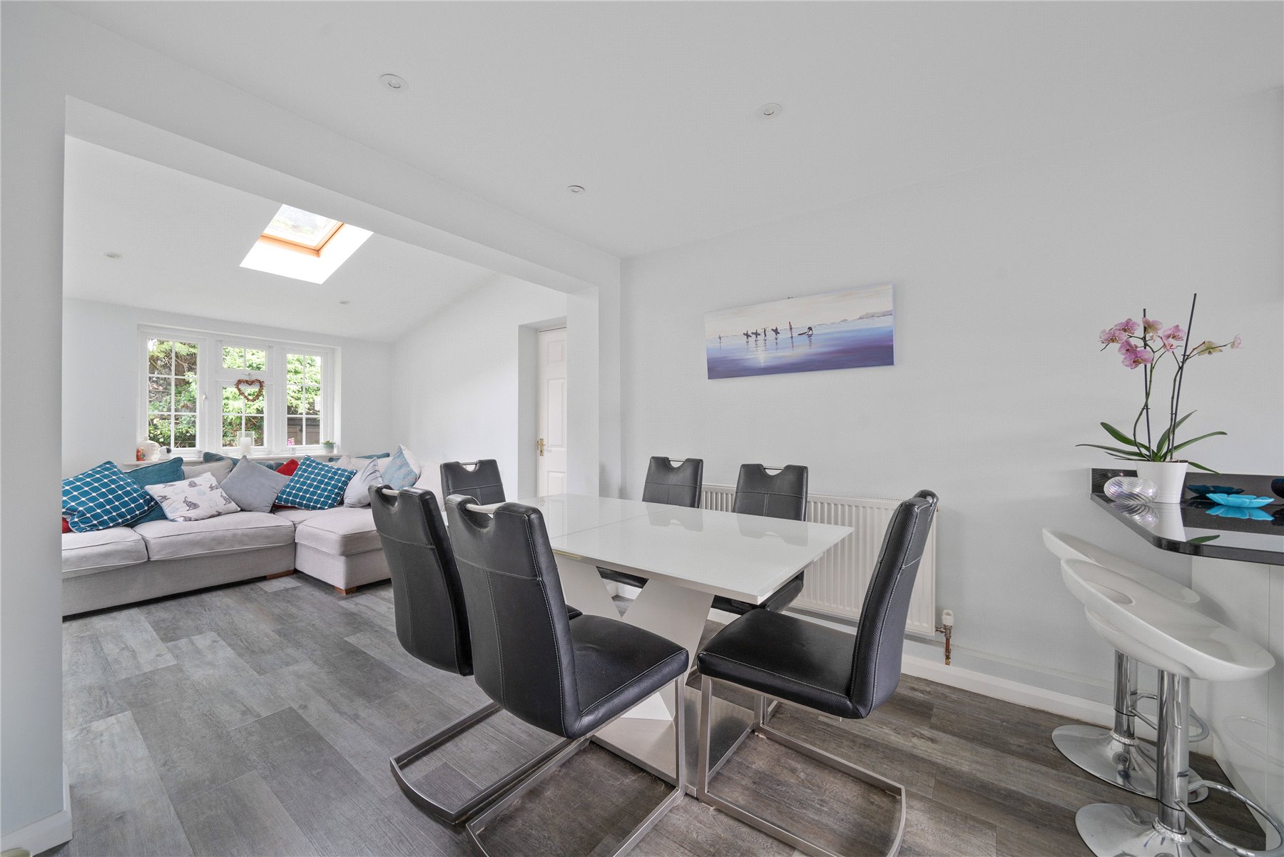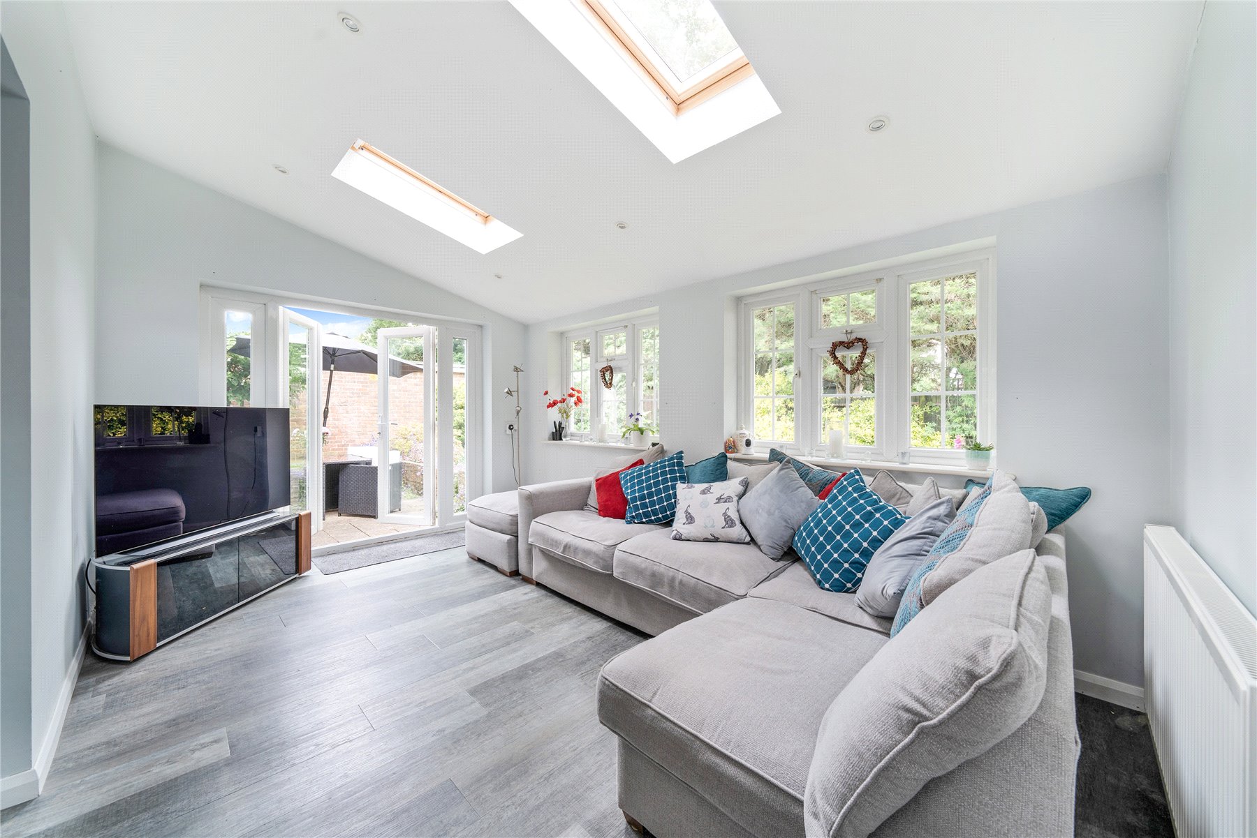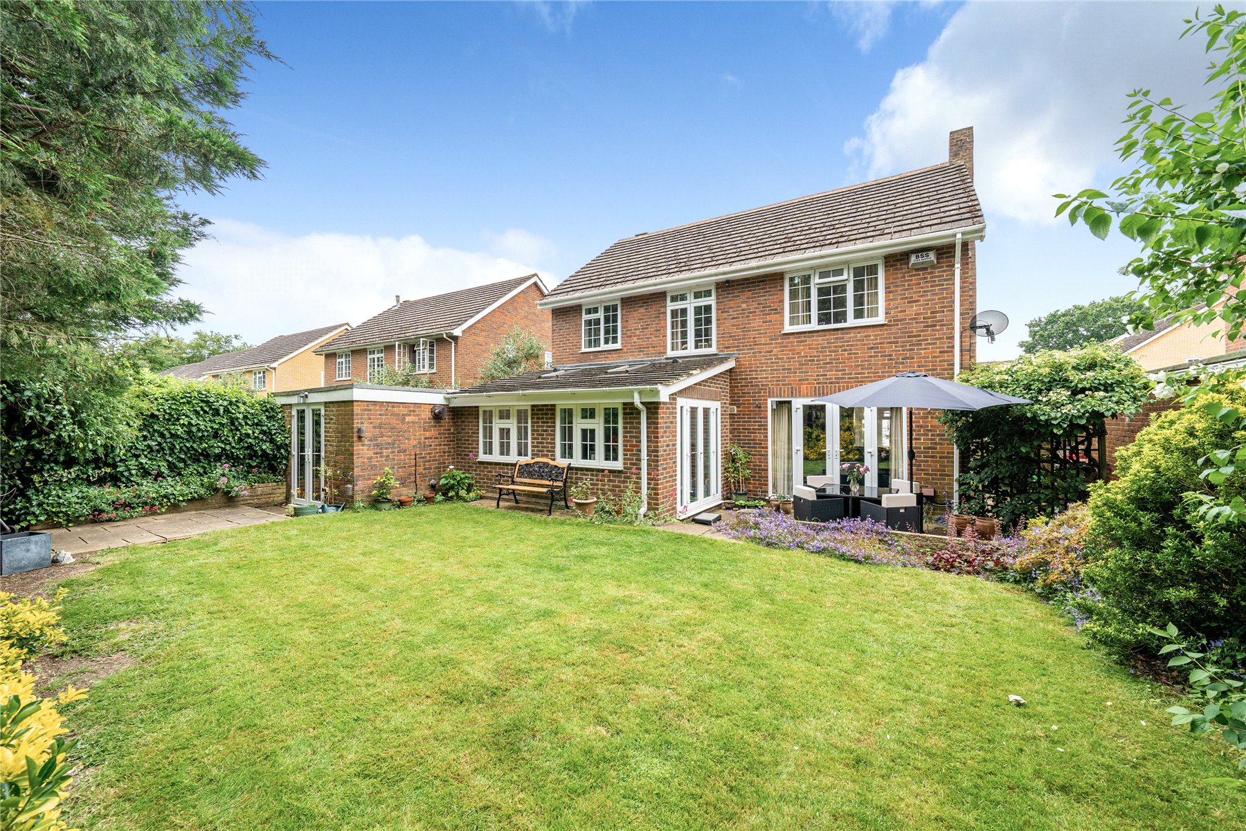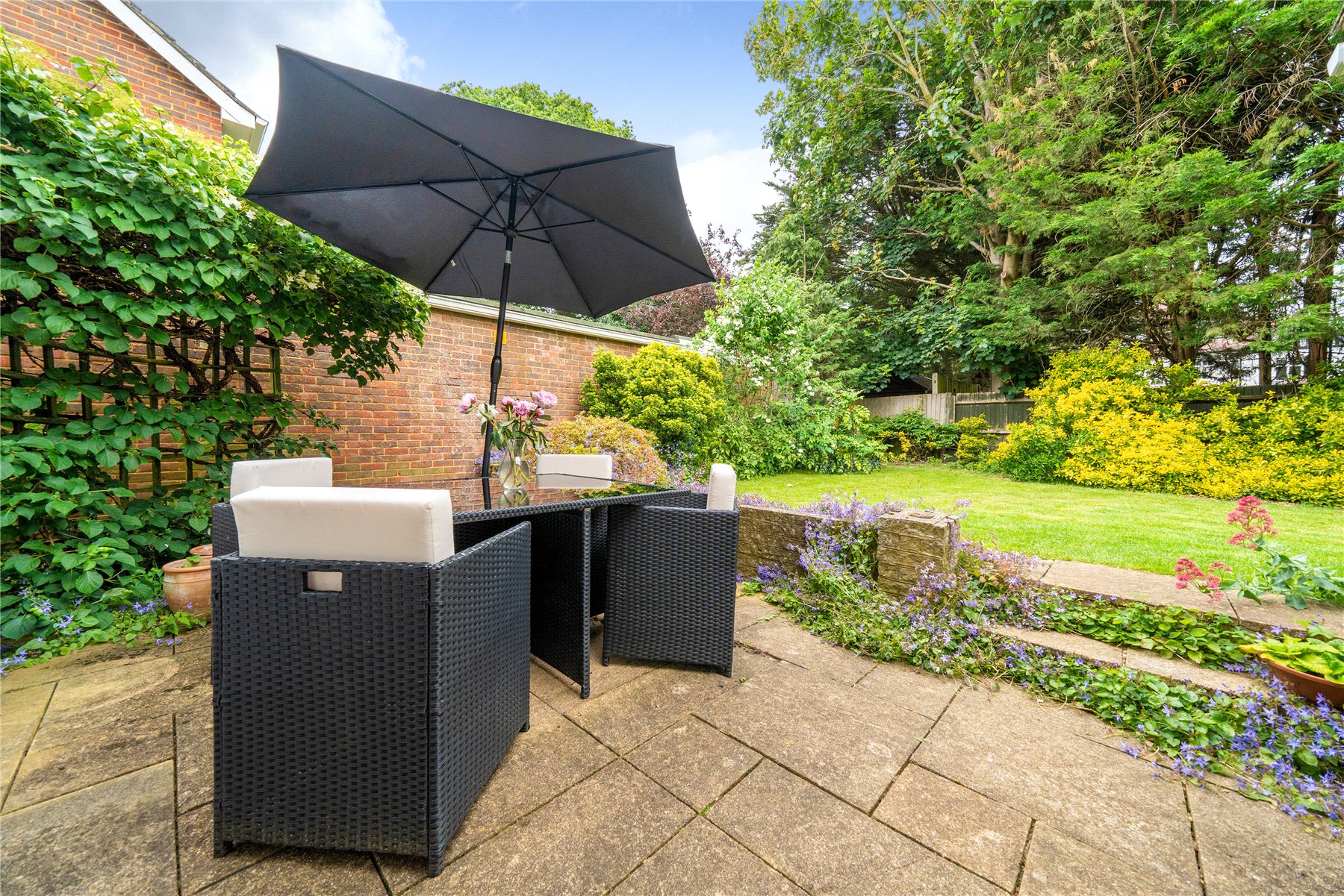 Outside, the rear garden is nearly 50' deep, with an extensive lawn area, spacious patio and various plants and shrubs. There is a pretty front garden, off street parking for multiple cars, and access to the garage on the side of the house, which lends itself to further extension (STPC)
