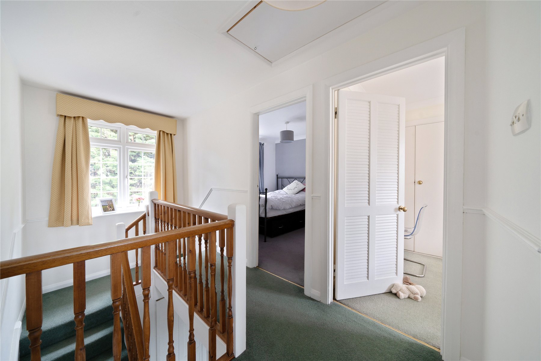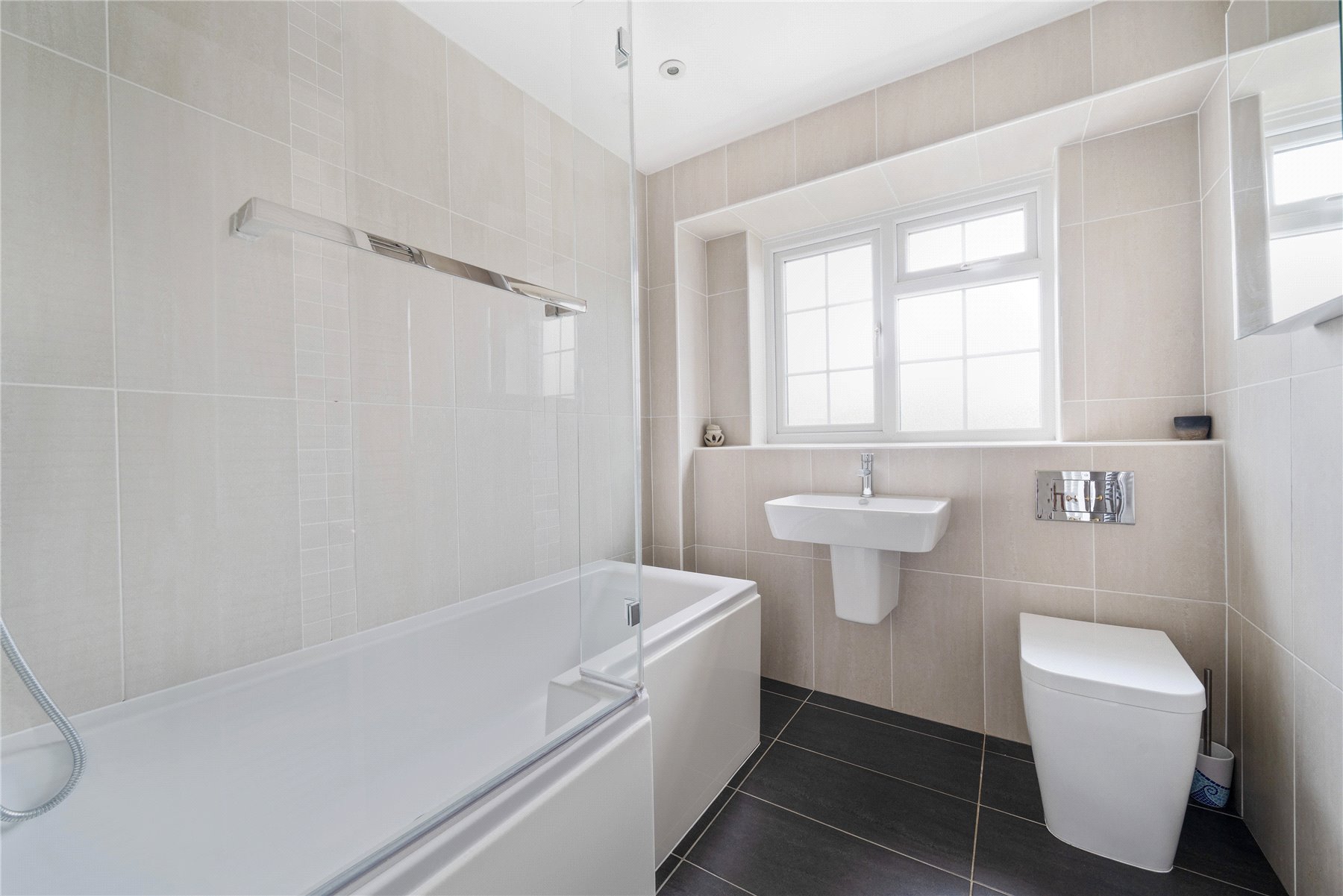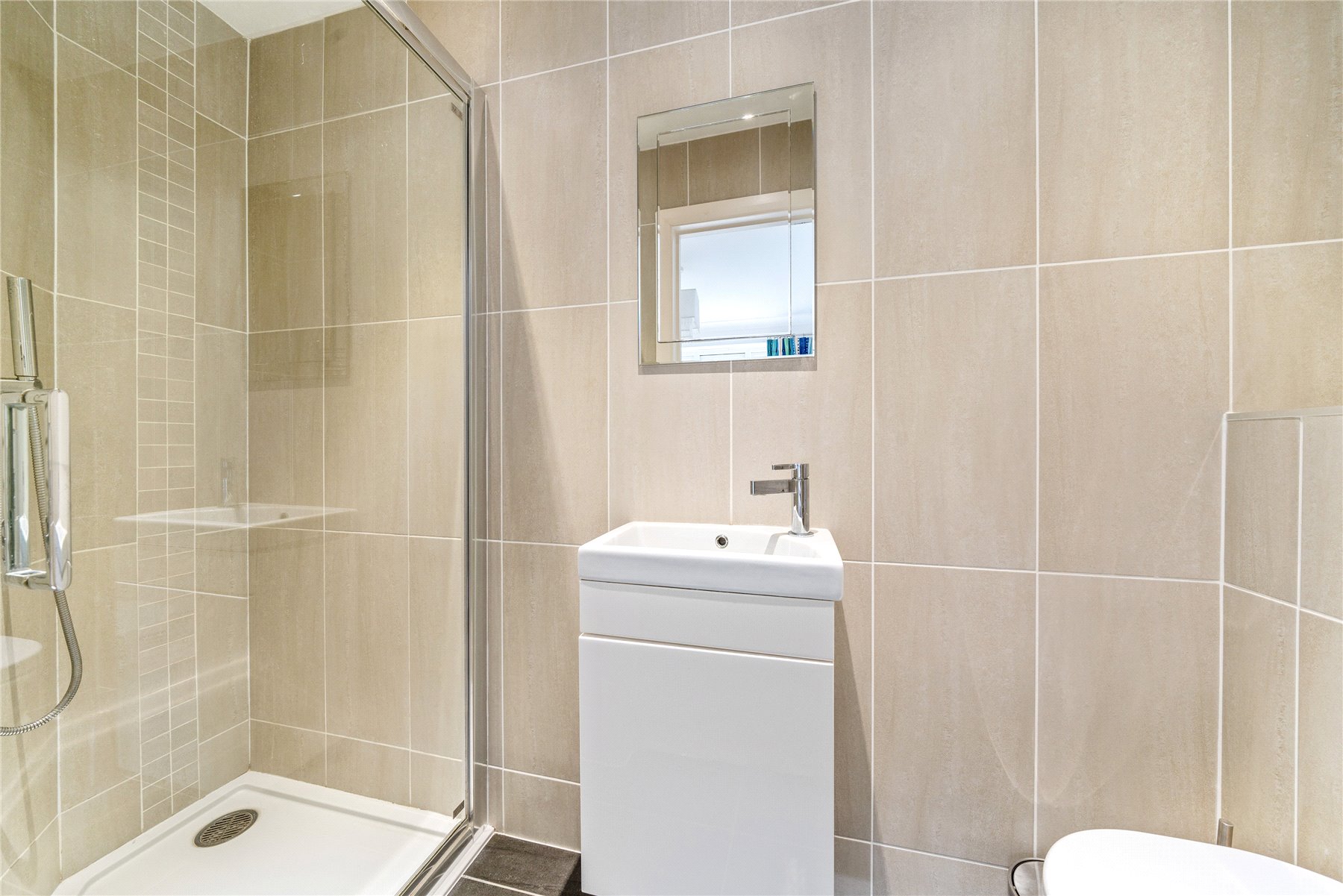 Upstairs, the main bedroom has a range of fitted wardrobes and a luxury en-suite shower room, which is tiled floor to ceiling. There are three further bedrooms, two of which have fitted storage, and a modern family bathroom, also fully tiled.