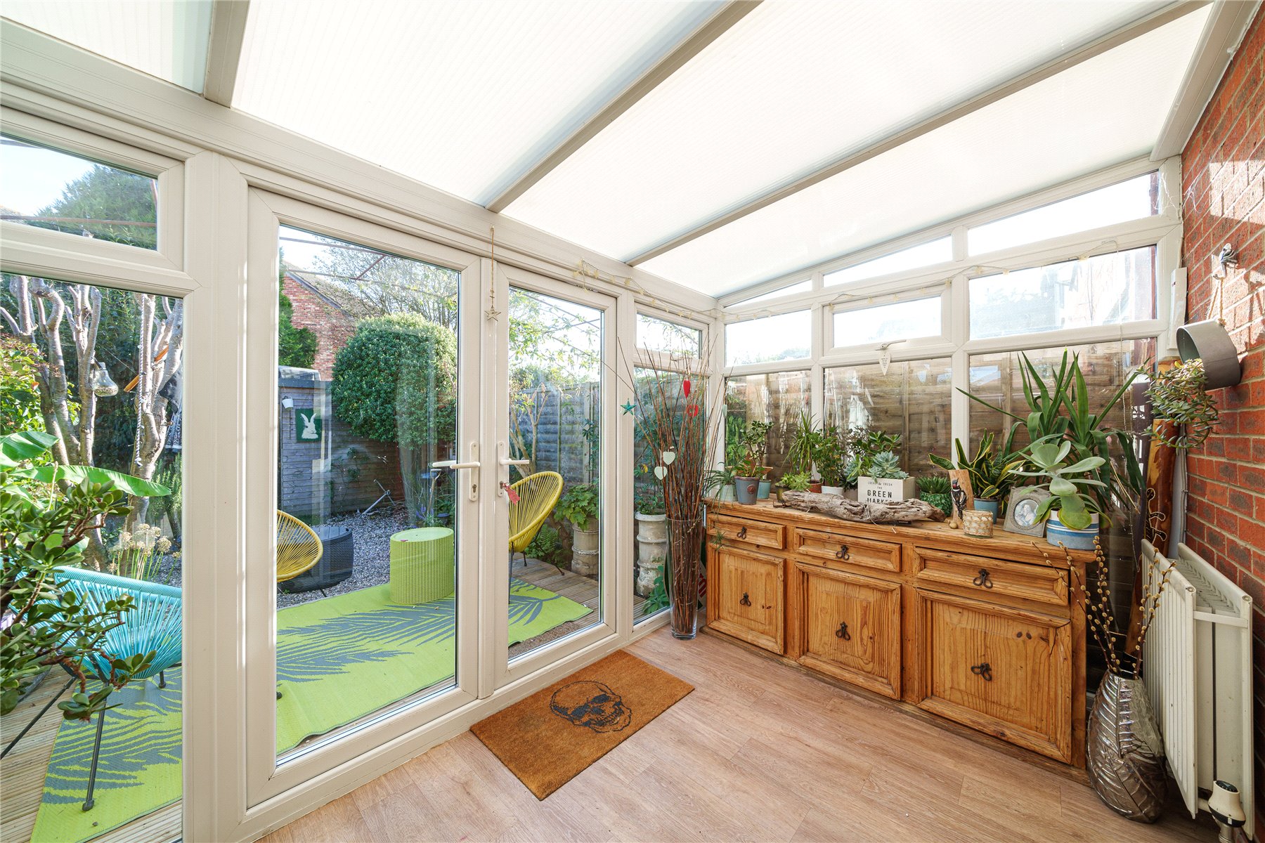 Inside there is a separate WC off the entrance hall and storage cupboard. The kitchen offers a range of base and wall mounted wooden units, including a four ring gas hob, electric oven and extractor hood. The living room is approximately 15ft in length with wood effect flooring and sliding doors on to the conservatory, which also has double doors on to the rear garden.